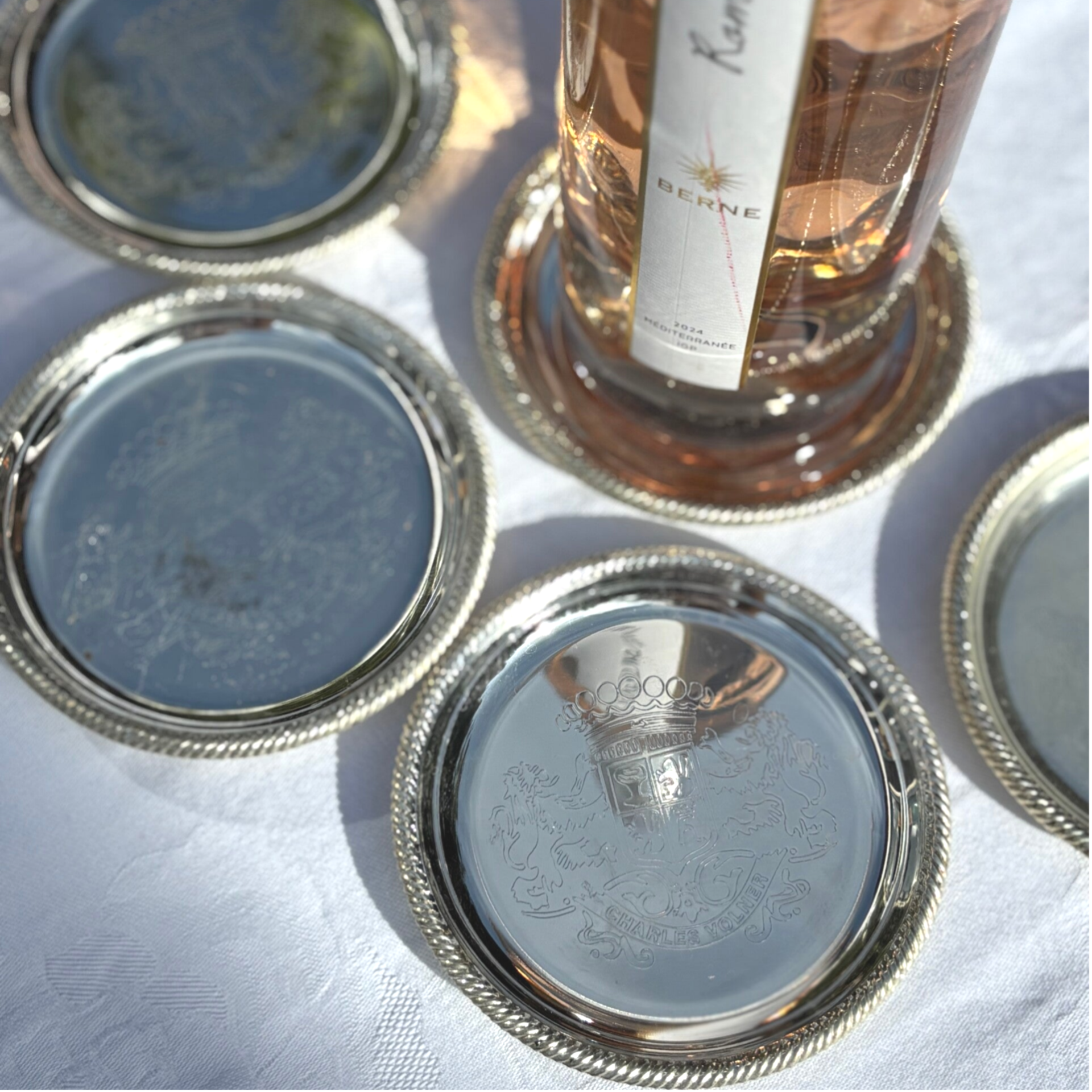 Verzilverde flesonderzetter met wapen in vintage staat. Enkele stuks beschikbaar, kunnen onderling verschillen.