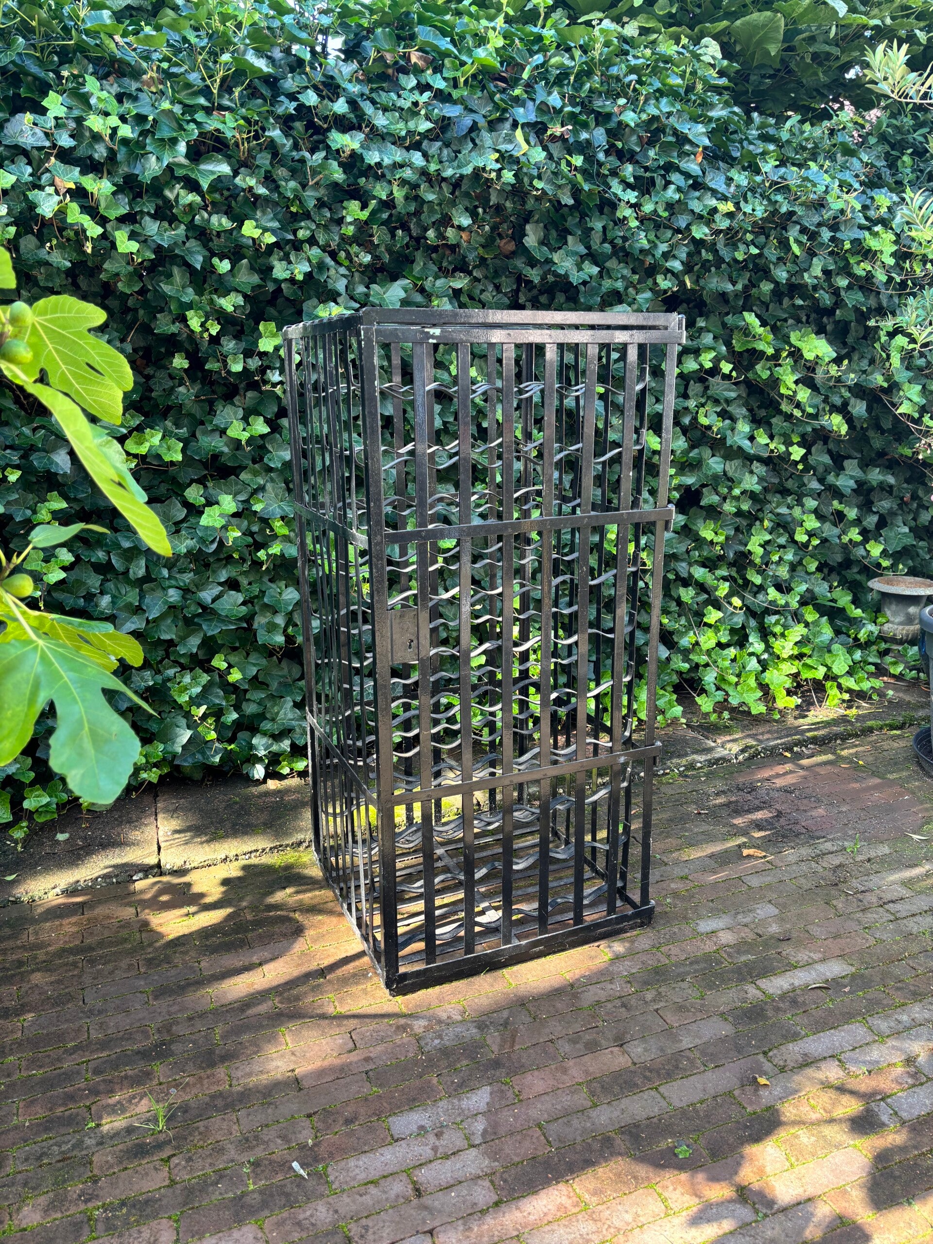 Grote metalen wijnkluis, ideaal voor kelder of als eyecatcher in woonkamer, keuken of bijkeuken. Geschikt voor 100 flessen. Afmetingen: 115 x 56 x 56 cm. Ophalen in Haren (GN), bezorging in NL eventueel mogelijk in overleg.
