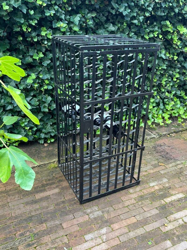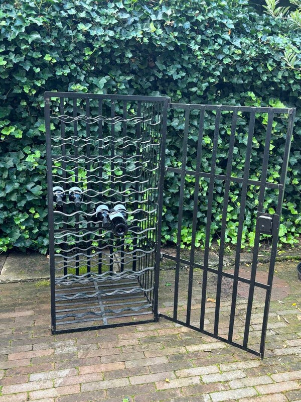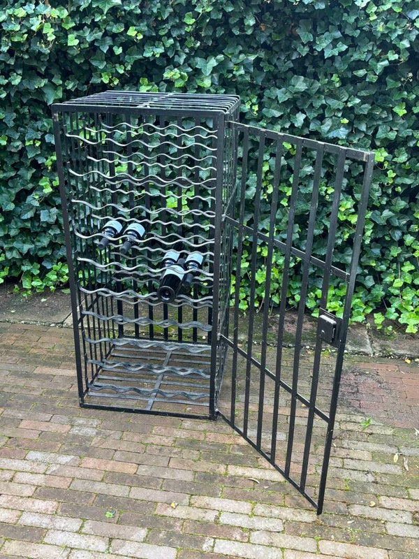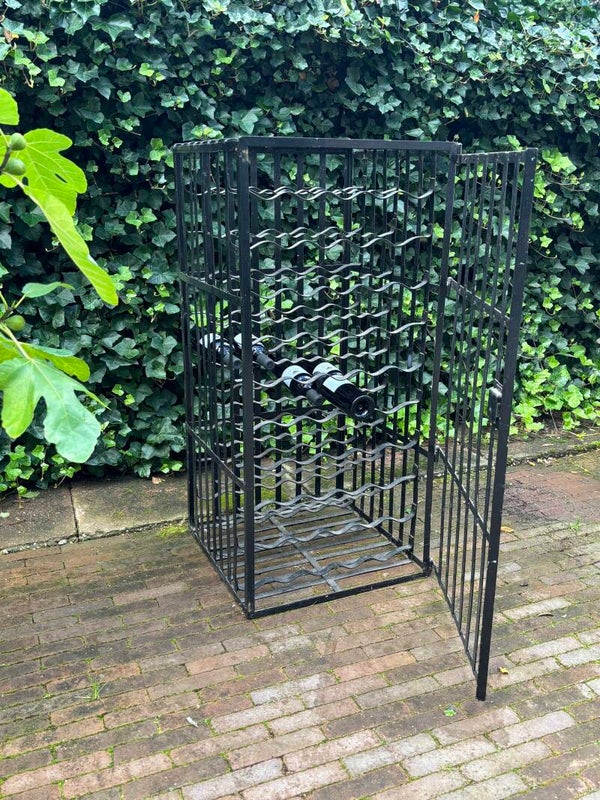 Large metal wine safe, perfect for a cellar or as an eye-catcher in the living room, kitchen, or pantry. Dimensions: 115 x 56 x 56 cm. Pick up in Haren (GN), delivery within NL available upon request.