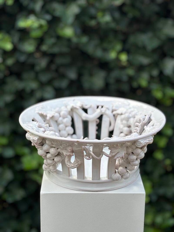 Bijzondere grote geglazuurde schaal 'Malicorne Coupe Blanche' van Émile Tessier (1887–1971), aardewerk, 20e eeuw. Gedecoreerd met druiventrossen en druivenranken. Een ware eyecatcher!