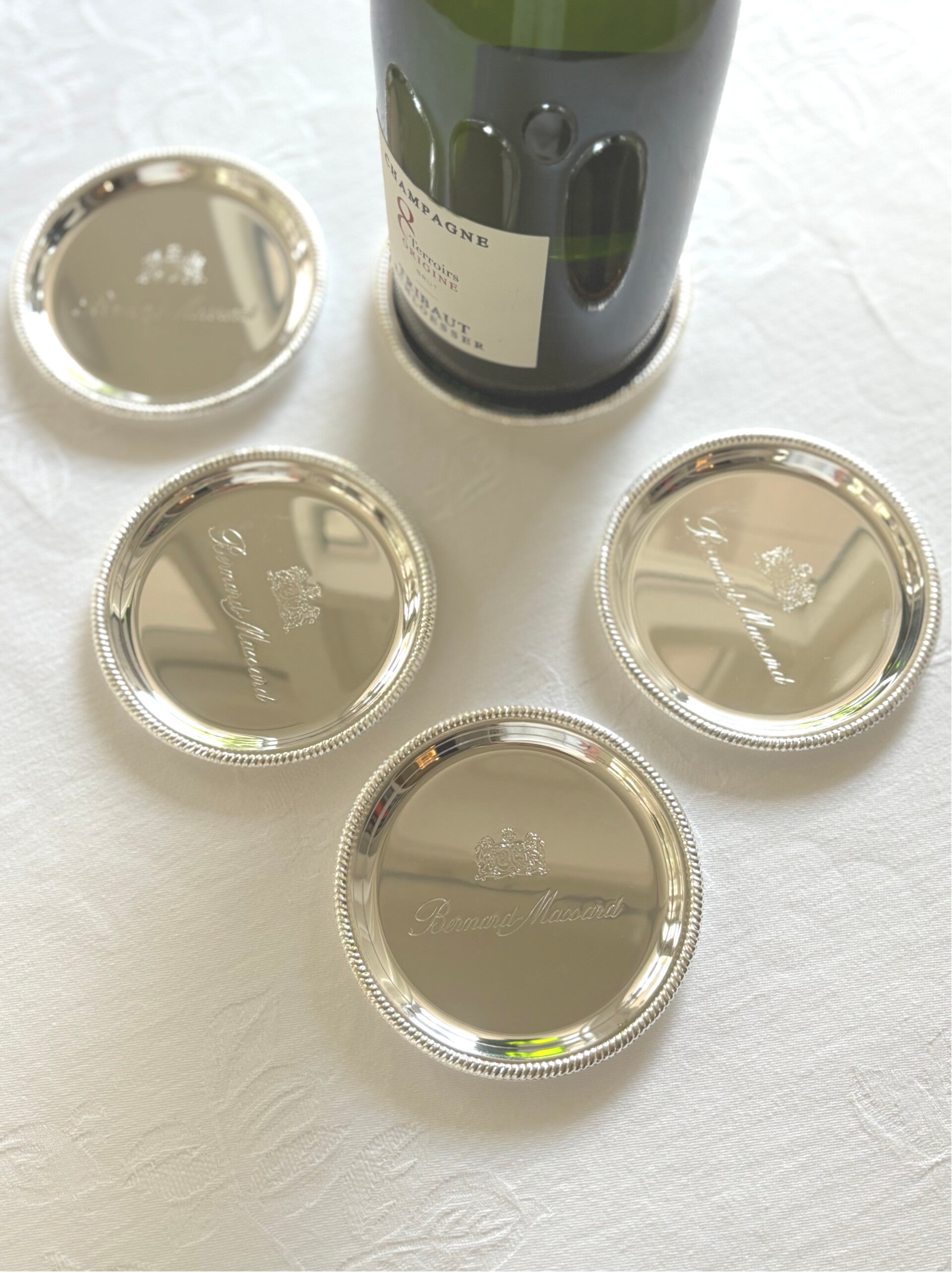 Silver-plated bottle coaster by Bernard Massard in excellent condition. Diameter: 10 cm. Perfect for festive occasions (there are also used pieces available in this webshop).