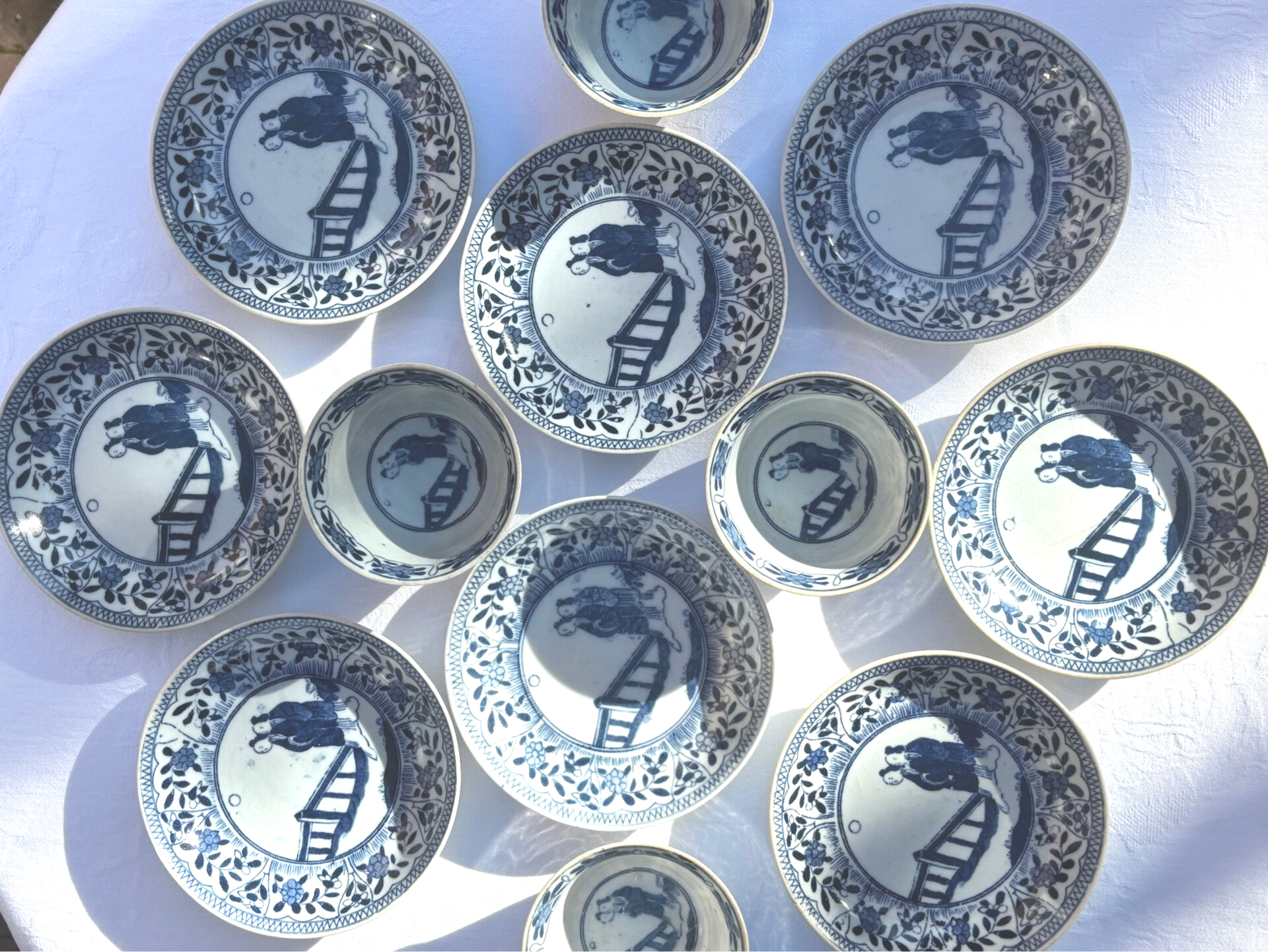 Set van 8 antieke porseleinen schotels en 4 kopjes, geïnspireerd op de KangXi-periode. Diameter schotel: 12 cm, diameter kopje: 8 cm. Sierlijk en verfijnd.