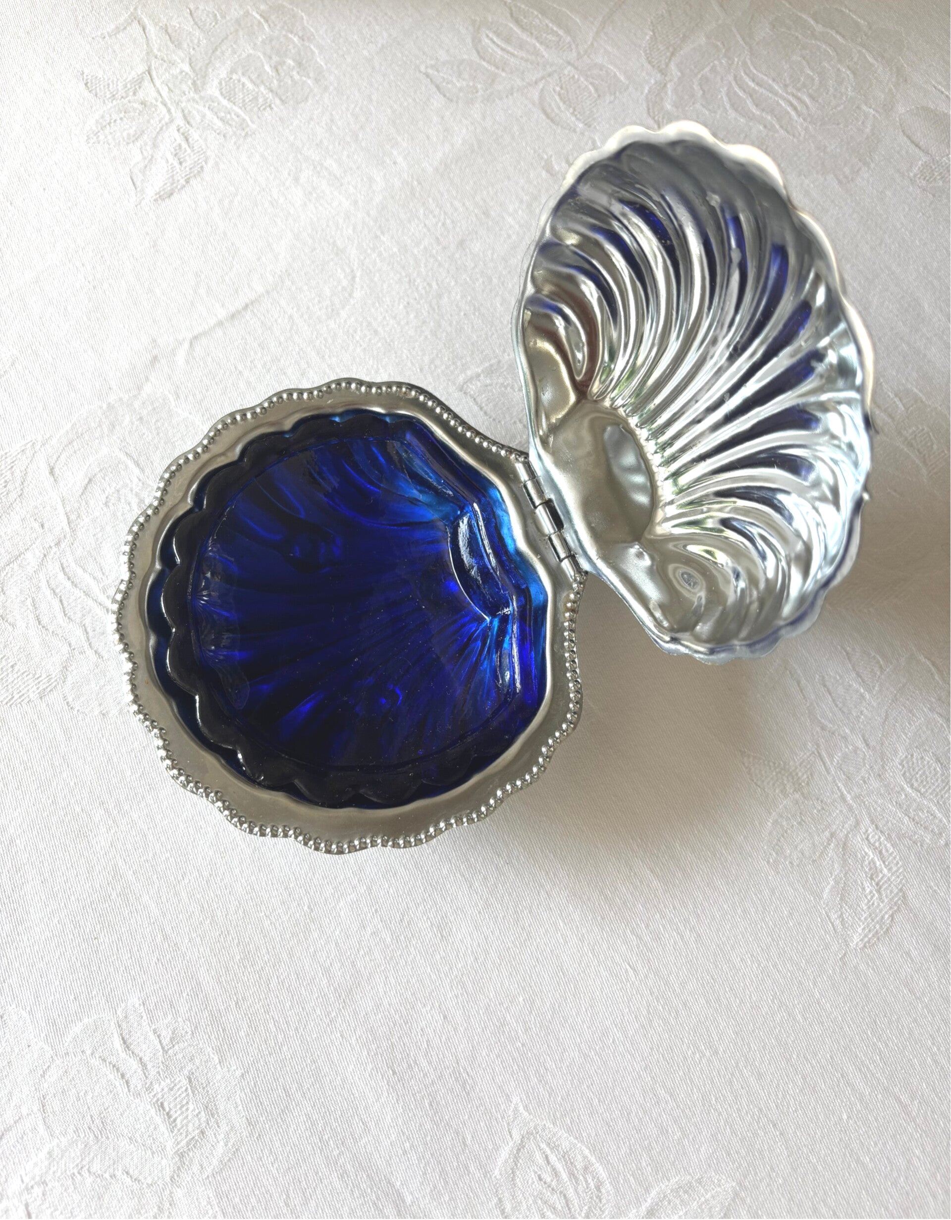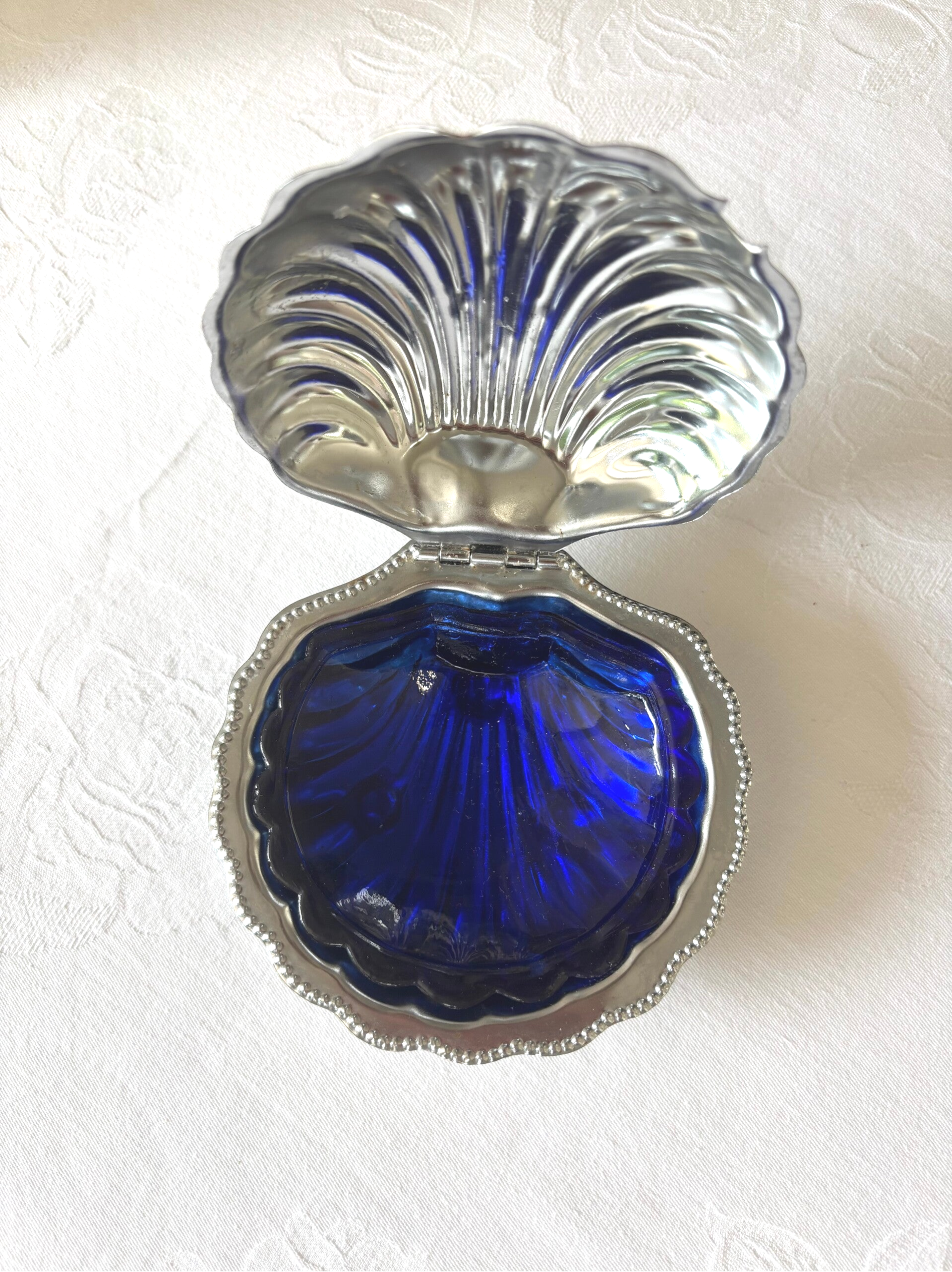 Elegante boterschelp met blauwe glazen inlay. Perfect voor een stijlvol gedekte tafel. Afmetingen: 13 x 13 cm. Klein beschadiging aan de glazen inlay, nauwelijks zichtbaar.