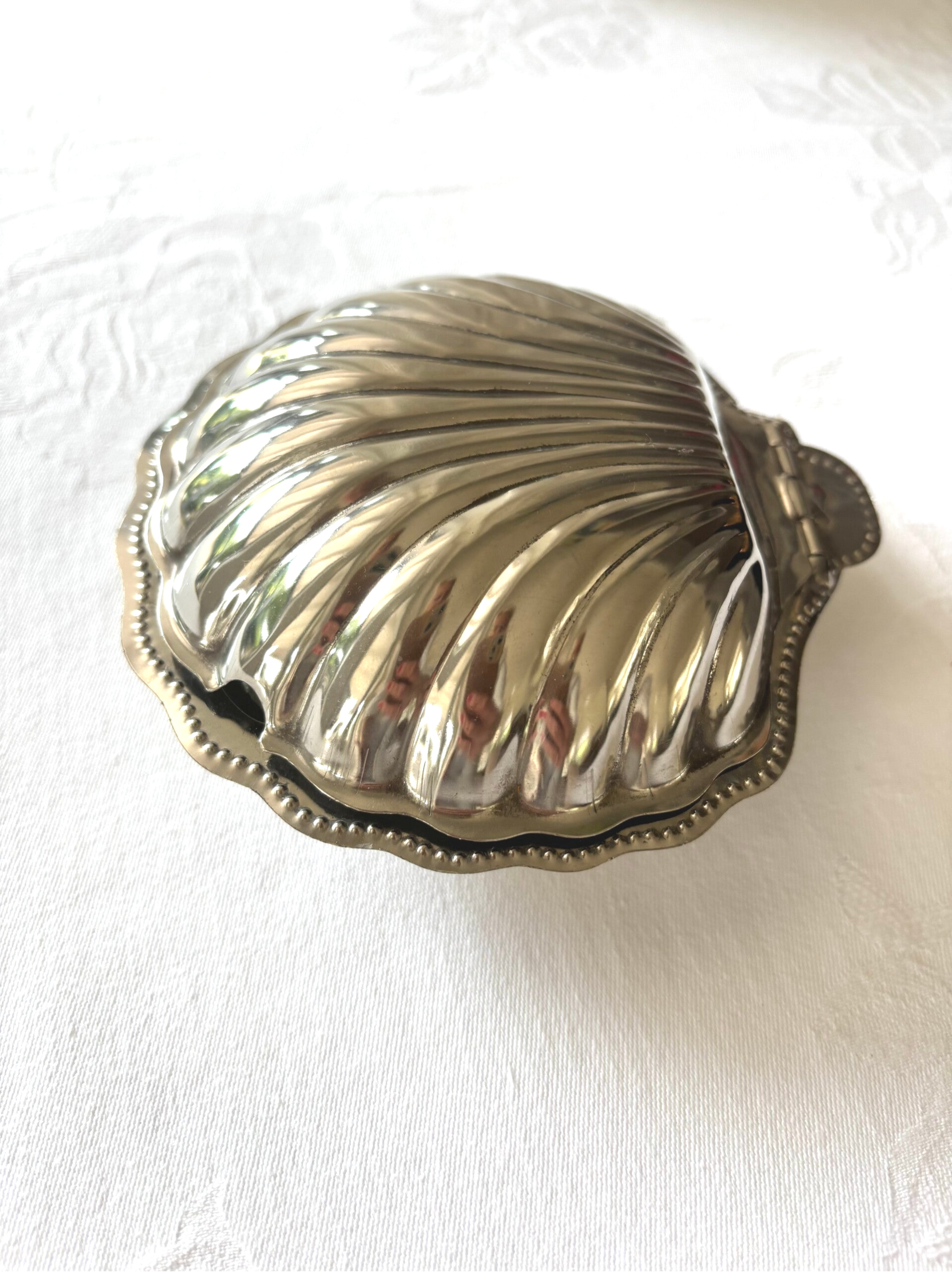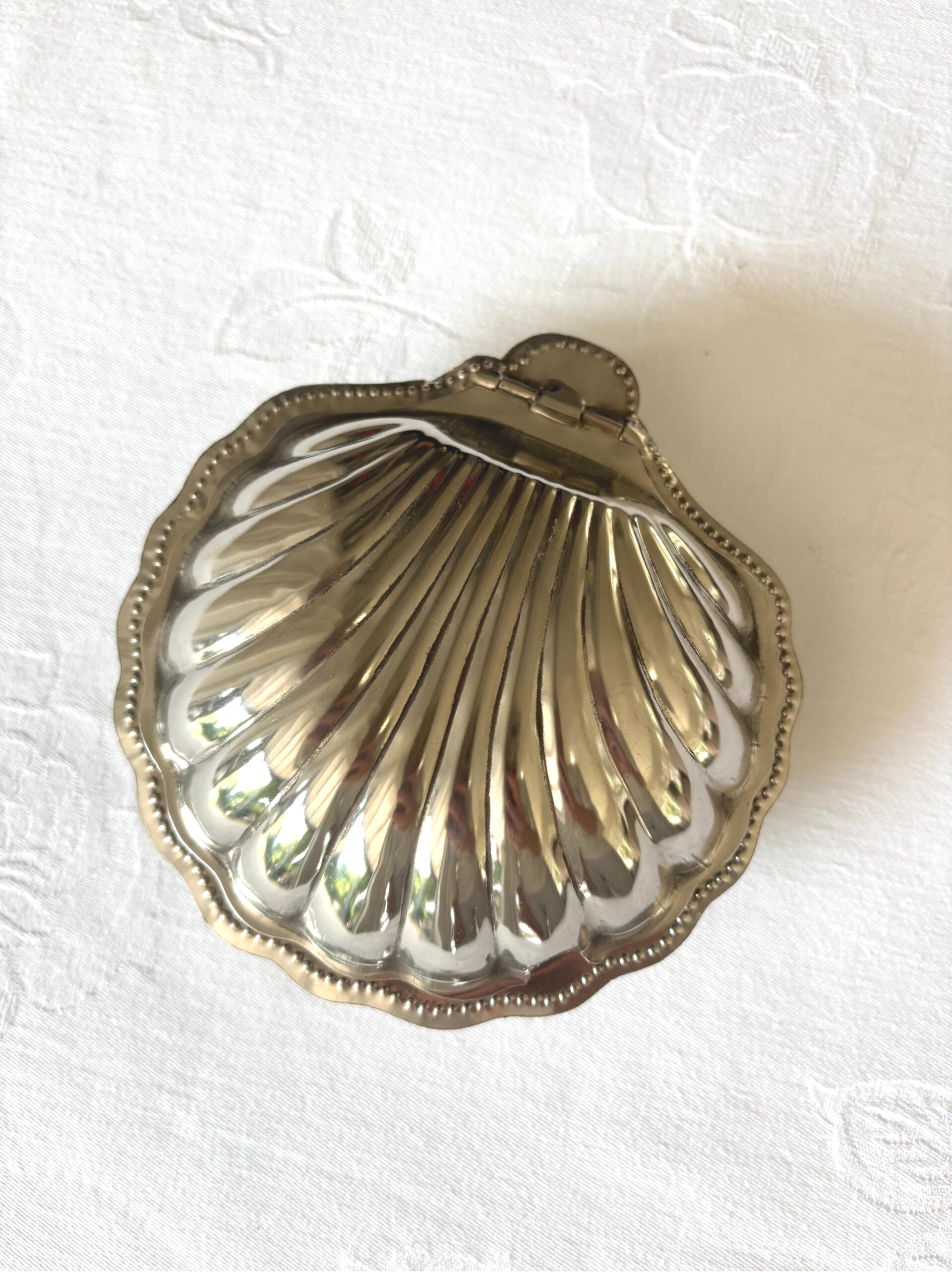 Elegante vintage boterschelp met transparante glazen inlay. Perfect voor een stijlvol gedekte tafel. Afmetingen: 13 x 13 cm.