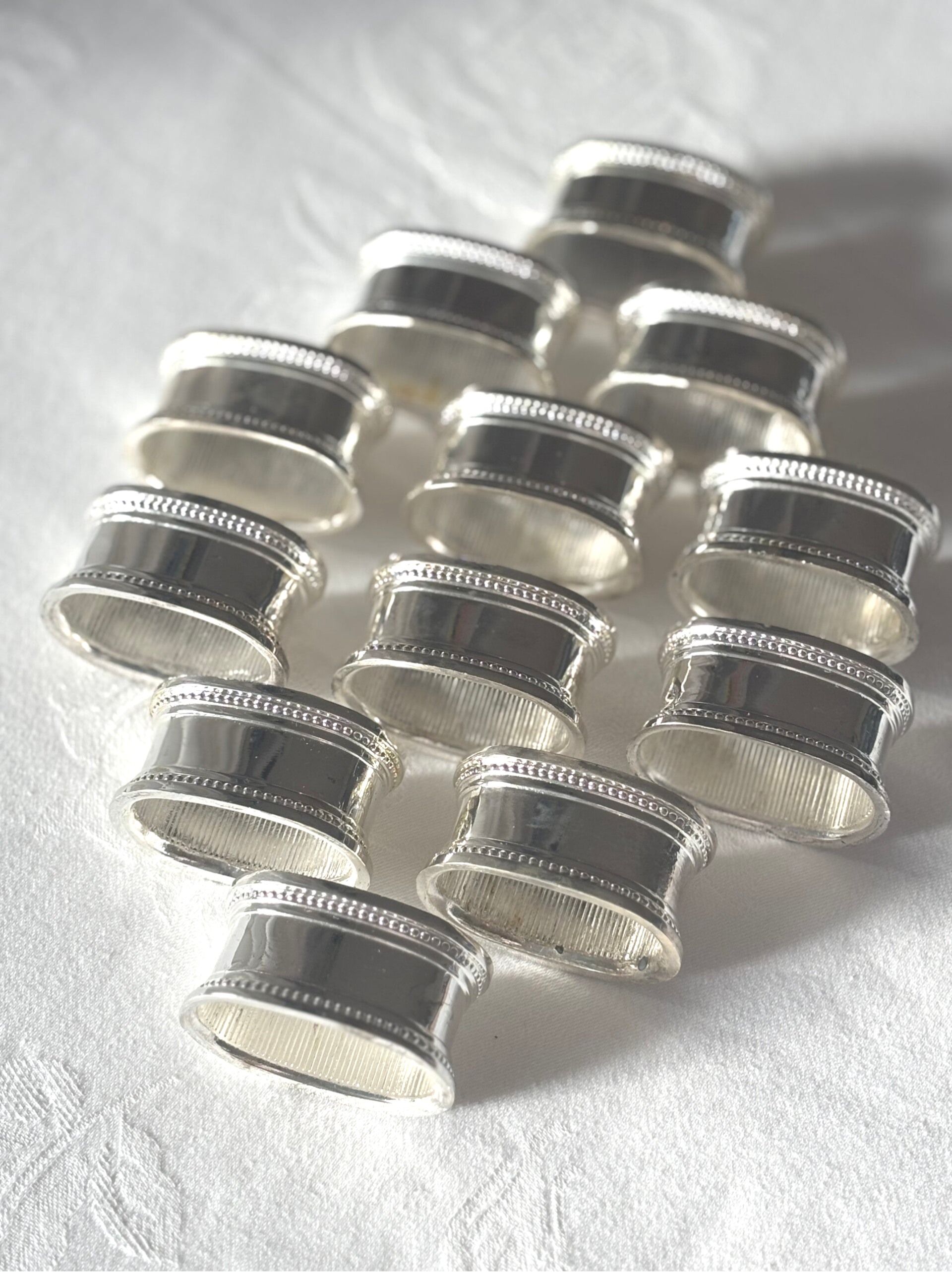 Elegant set of 12 silver-plated napkin rings. Enhance any table setting with this beautiful set of silver-plated napkin rings. Perfect for festive occasions and dinners.