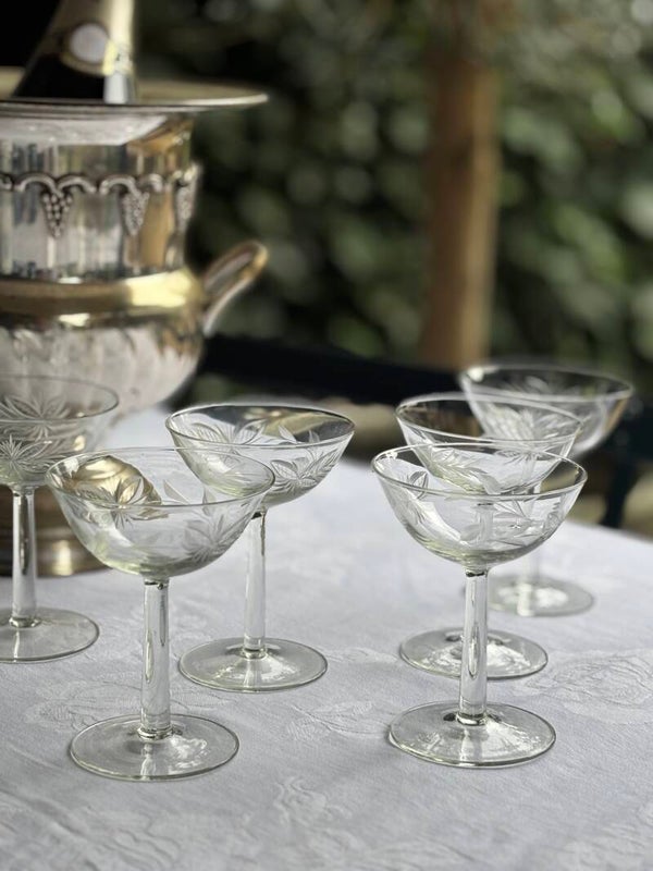 Set of 6 hand-cut coupes with floral motif. Perfect for Champagne, liqueur or aperitif. Height: 11 cm, diameter: 8.3 cm.
