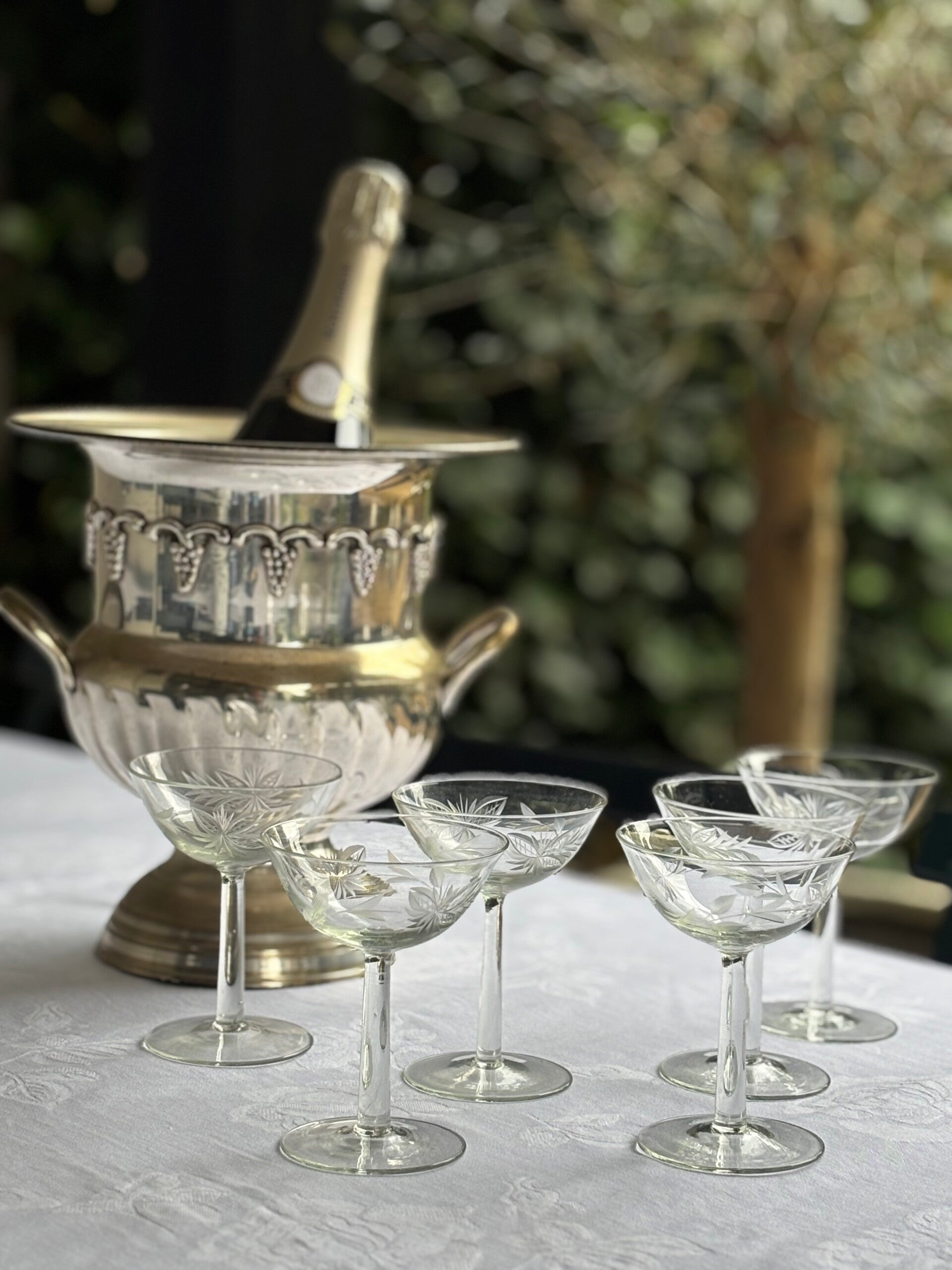 Set van 6 handgeslepen coupes met bloemmotief. Ideaal voor Champagne, likeur of aperitief. Het is een kleiner model. Hoogte: 11 cm, diameter: 8,3 cm.