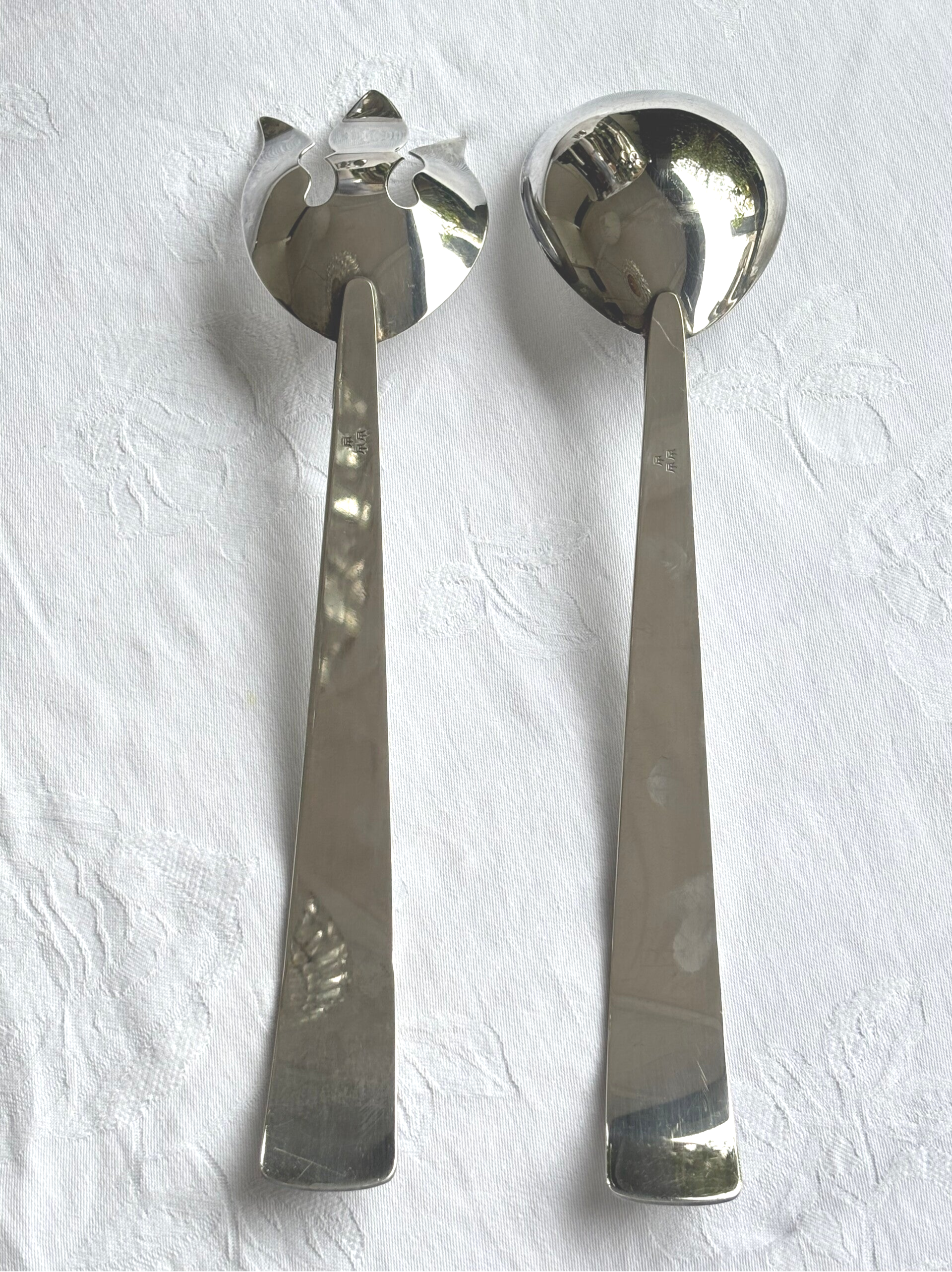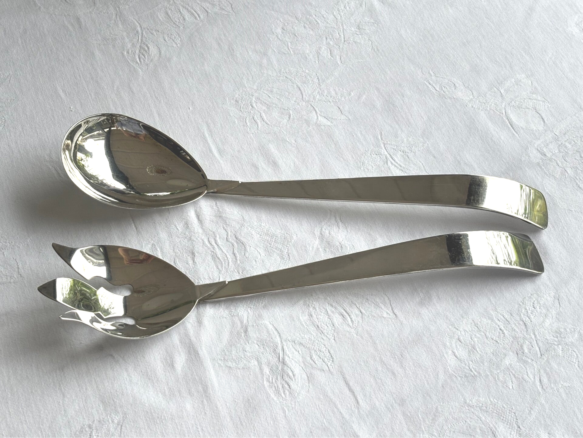 Silver-plated salad serving set by Royal Hickman, marked with three crowns. Length: 31.5 cm.