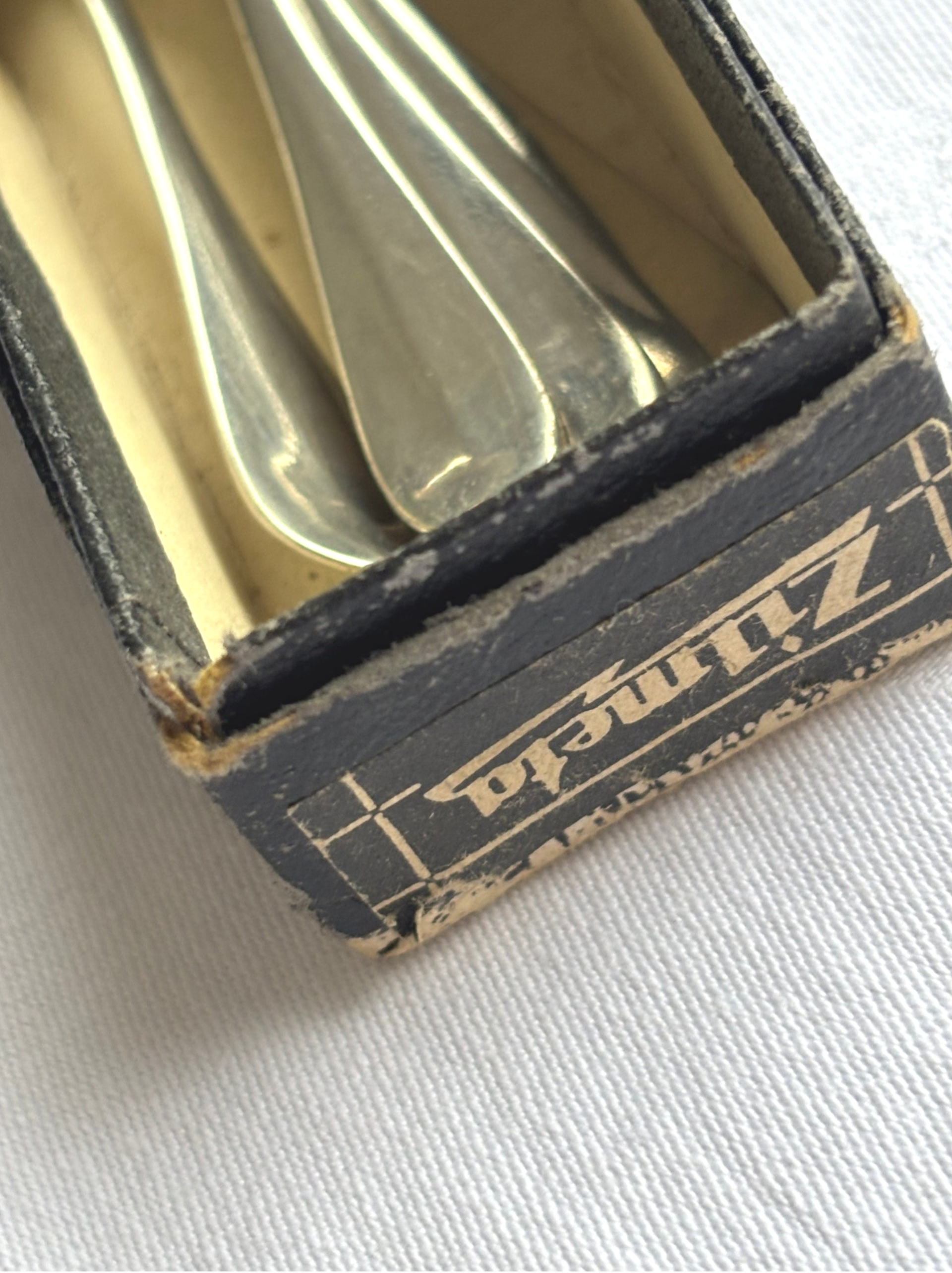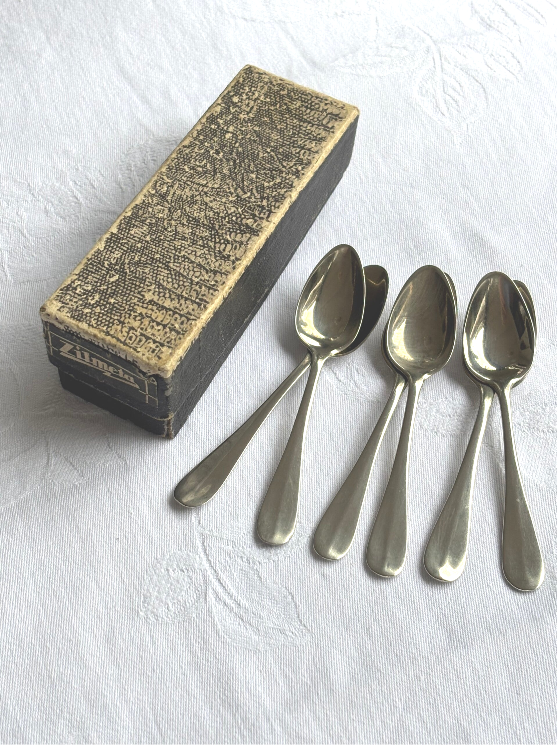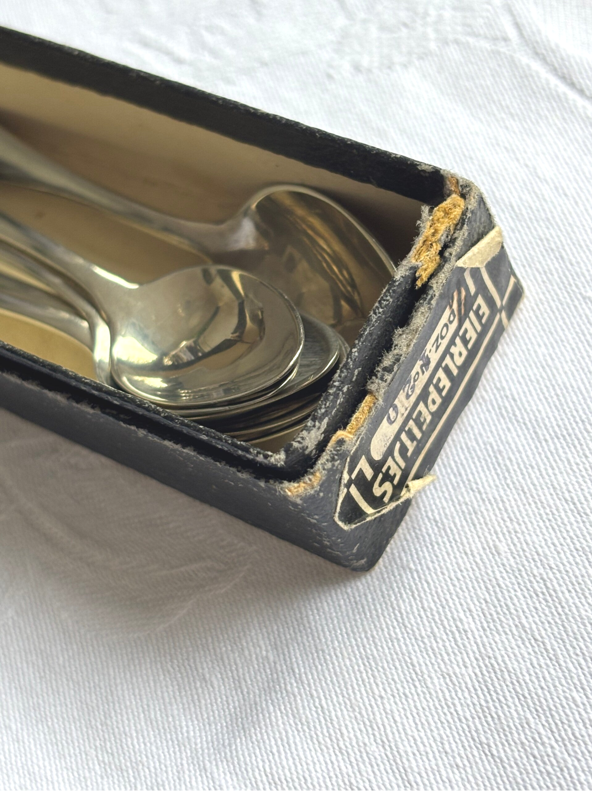 Set van 6 eierlepeltjes in originele doos. Materiaal: Zilmeta, een legering van staal, chroom en nikkel, vergelijkbaar met RVS. Lengte: 10 cm.