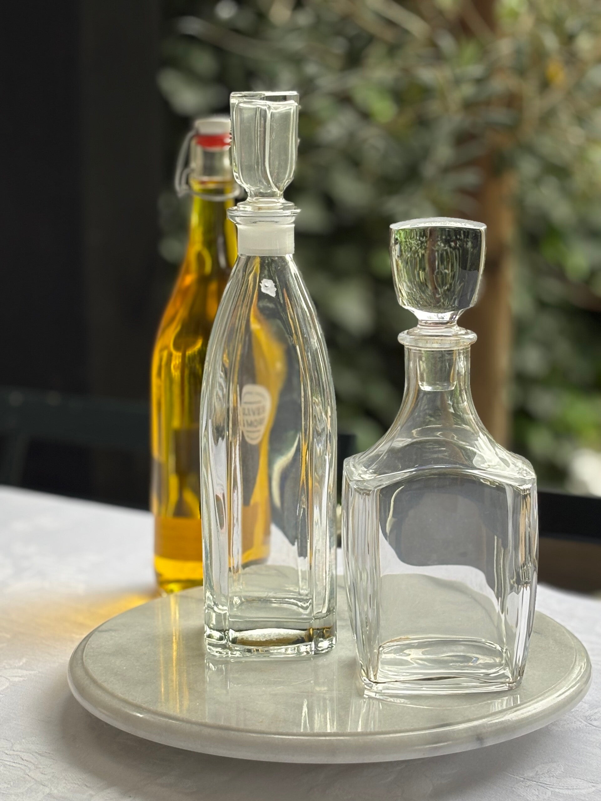 Set of 2 glass wine decanters with sleek design, also suitable for oil. Height: 32 cm and 26 cm.