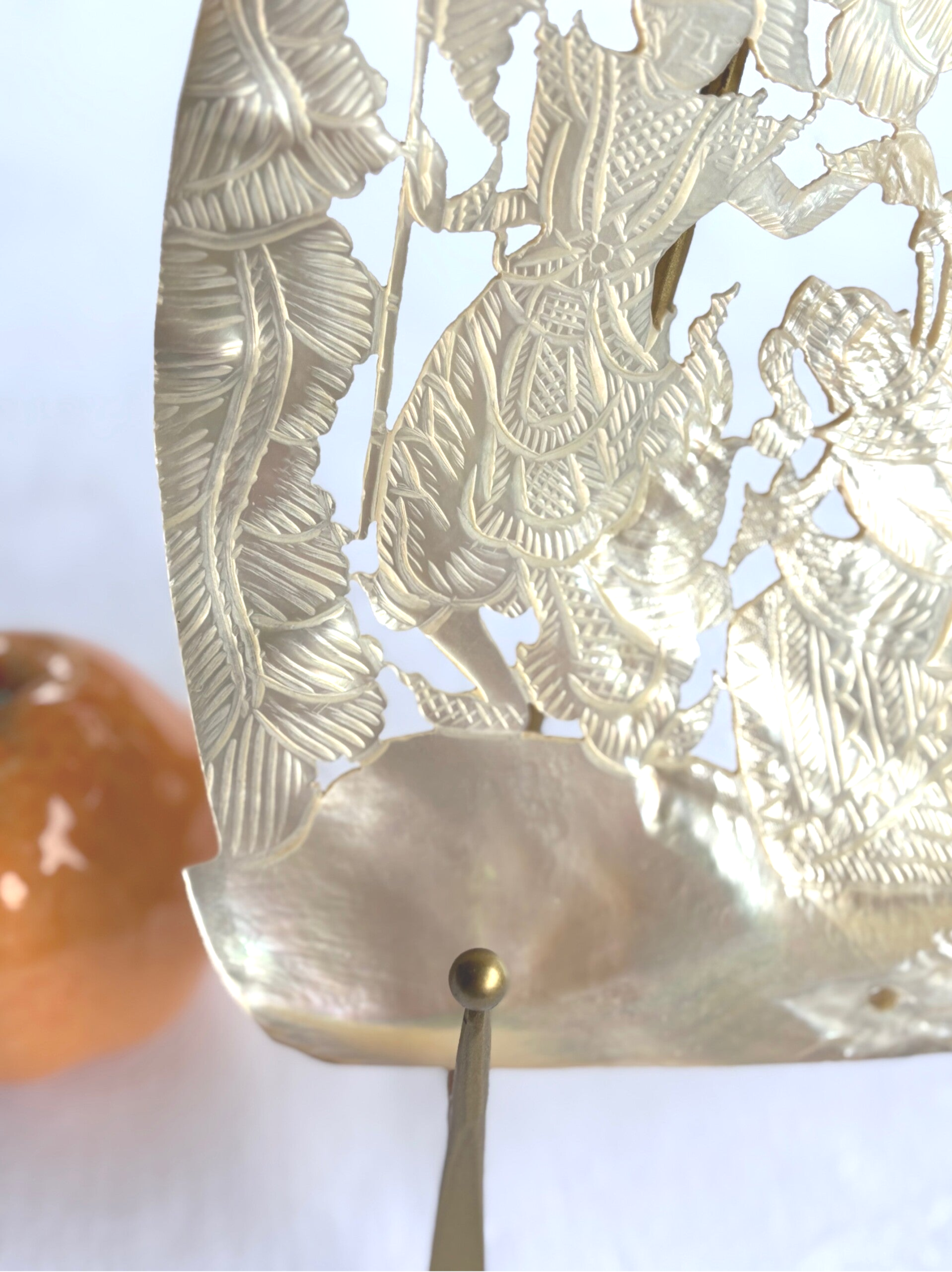 Large antique Chinese mother-of-pearl shell, beautifully carved with fine details. A striking decorative piece. Dimensions: 24,5 x 23 cm.