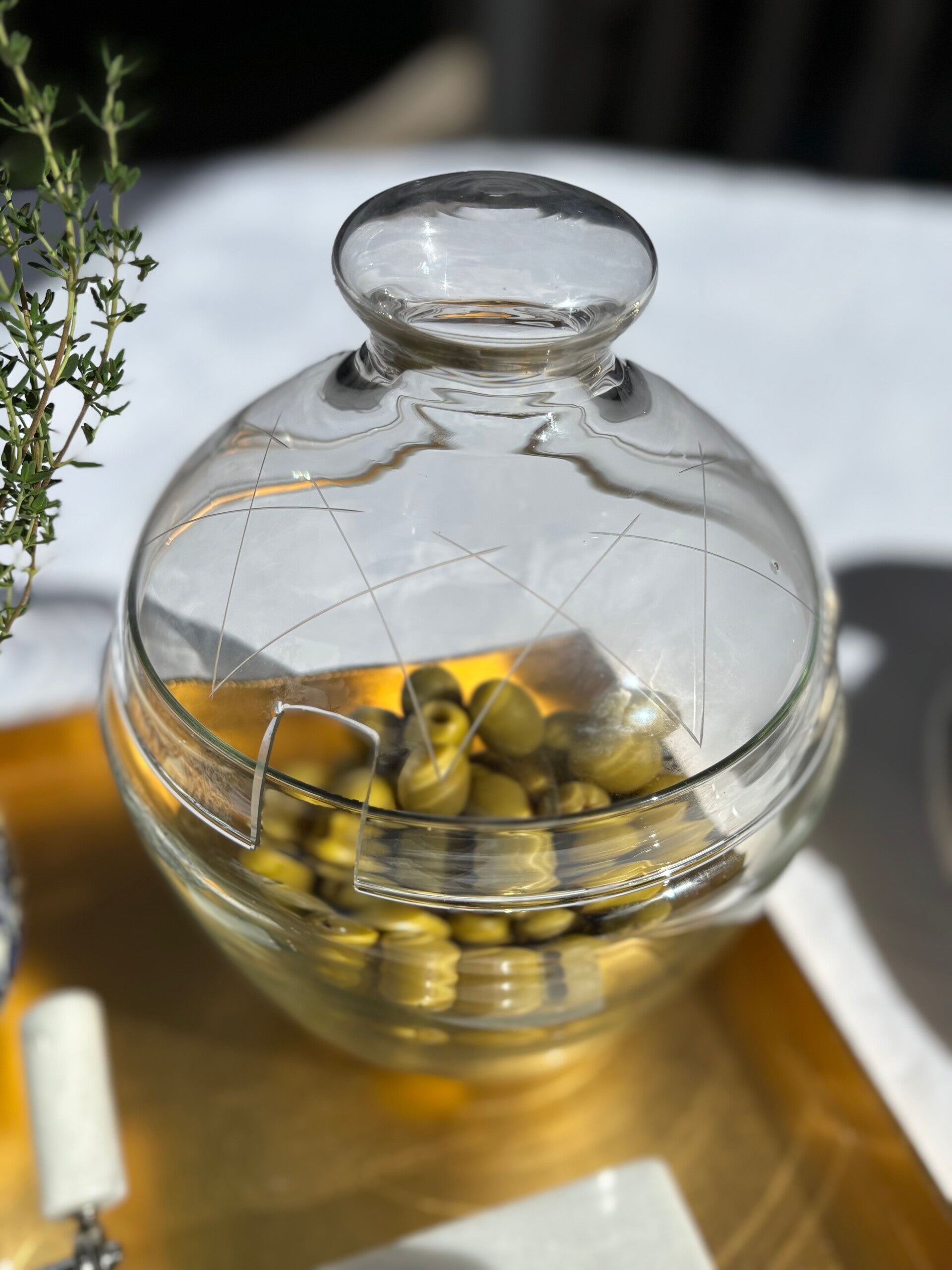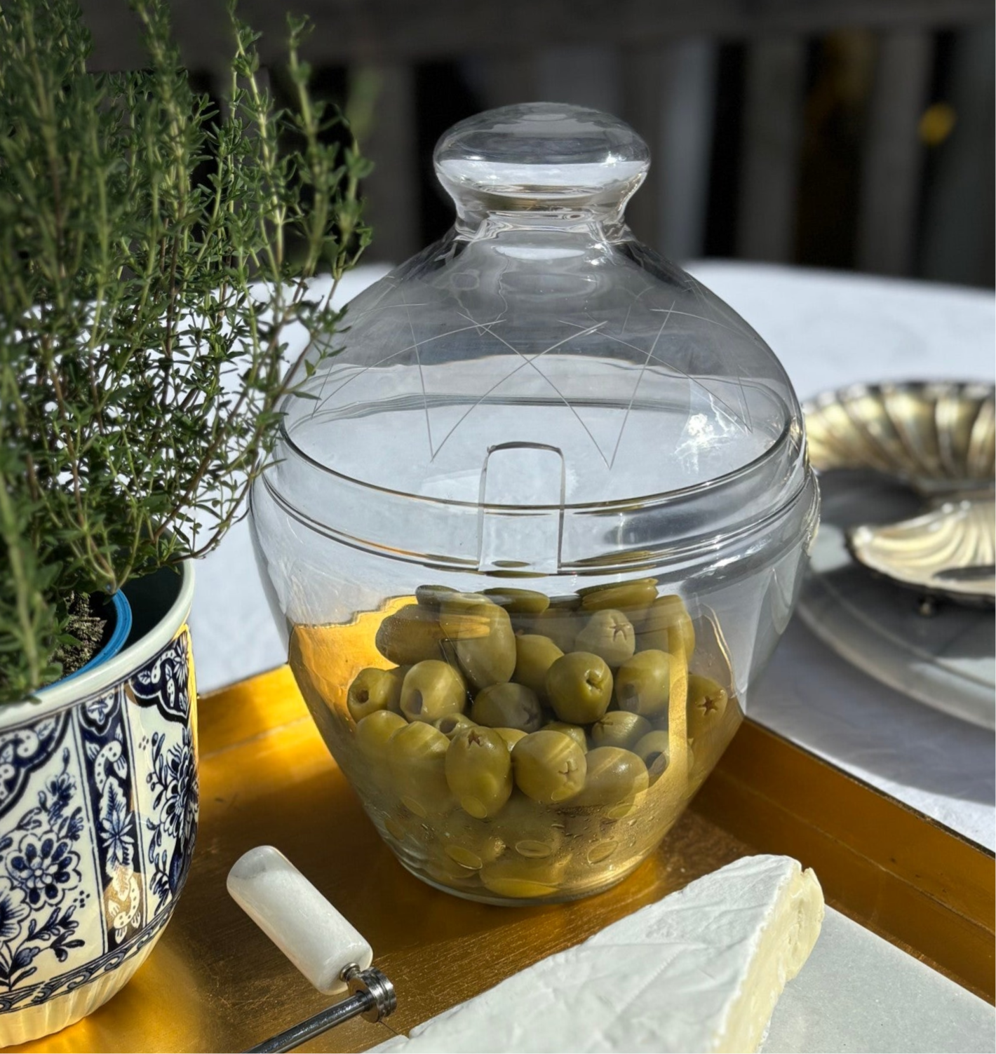 Large old (olive) jar with ornate lid. Decorative and functional. Height: 24 cm, diameter: 18 cm.