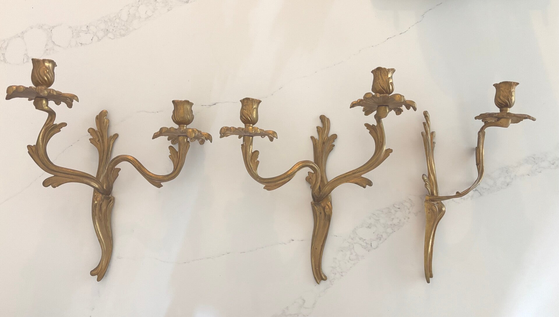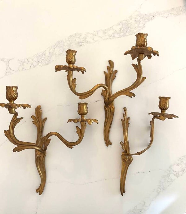 Dubbele Franse wandkandelaar met sierlijke details. Twee stuks beschikbaar, daarnaast ook een enkele. Afmetingen: 31 x 28 cm.