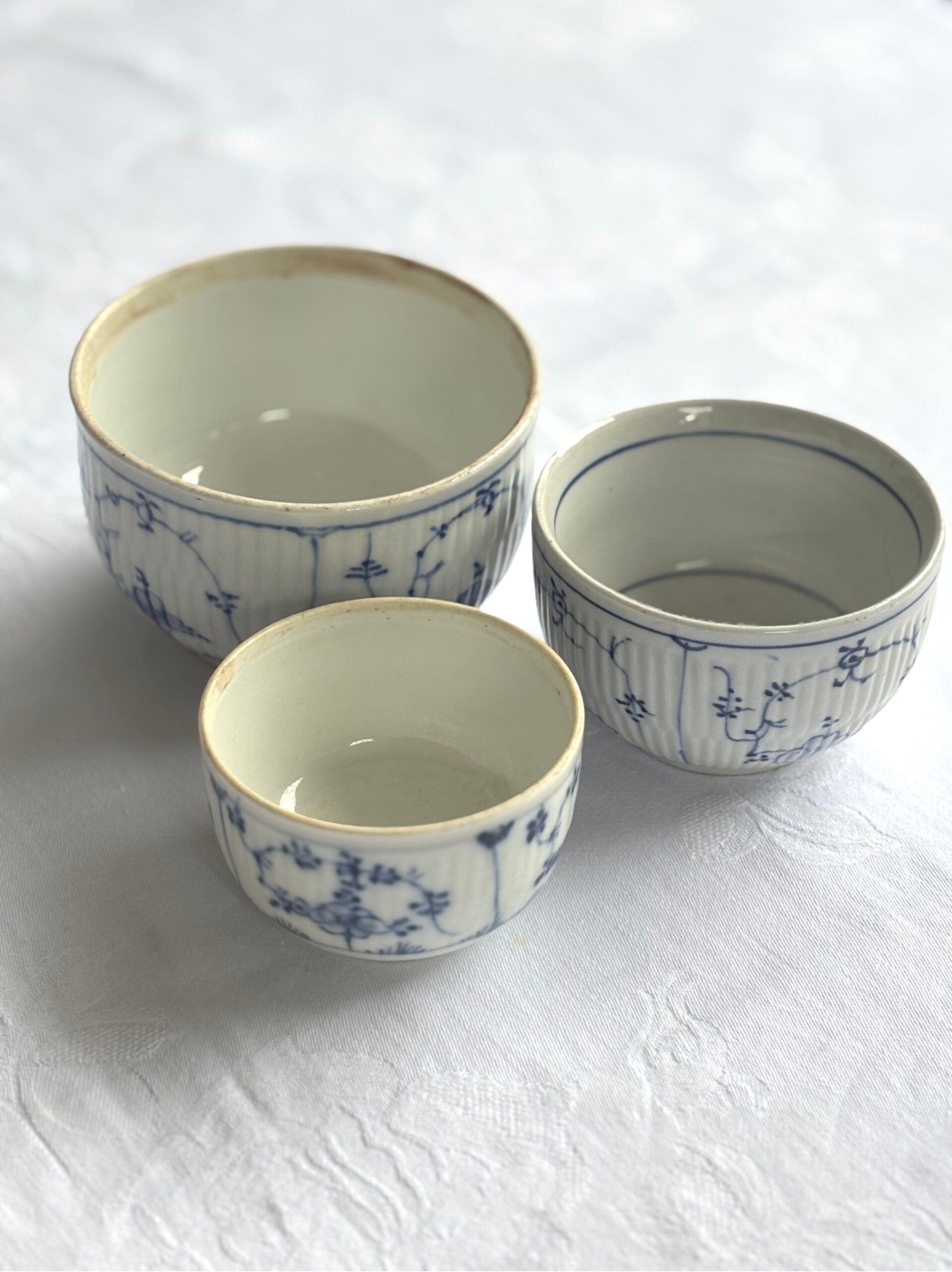 Set of 3 antique bowls with strawflower motif. Includes a rinsing bowl (ca. 11 cm), a Rauenstein Strawflower bowl (ca. 9 cm), and a small bowl likely from Limbach (ca. 8 cm).