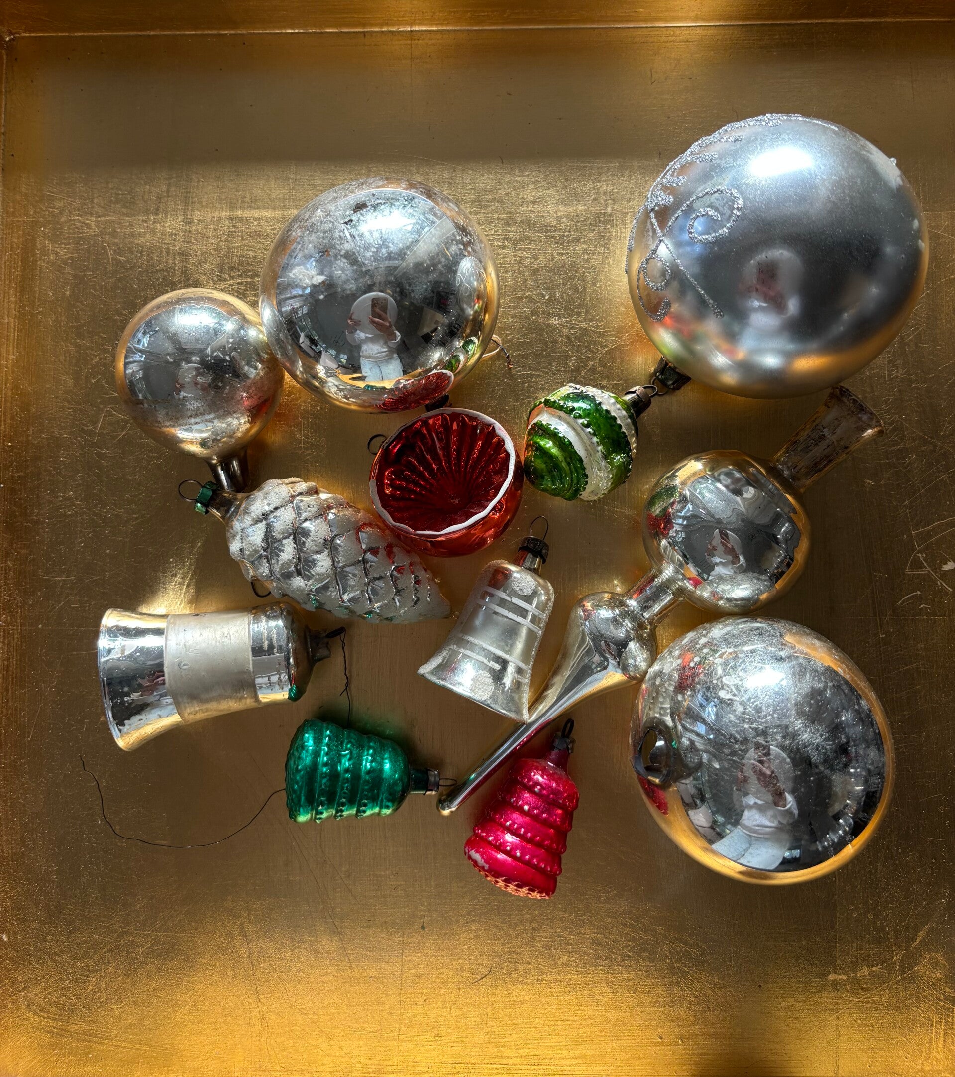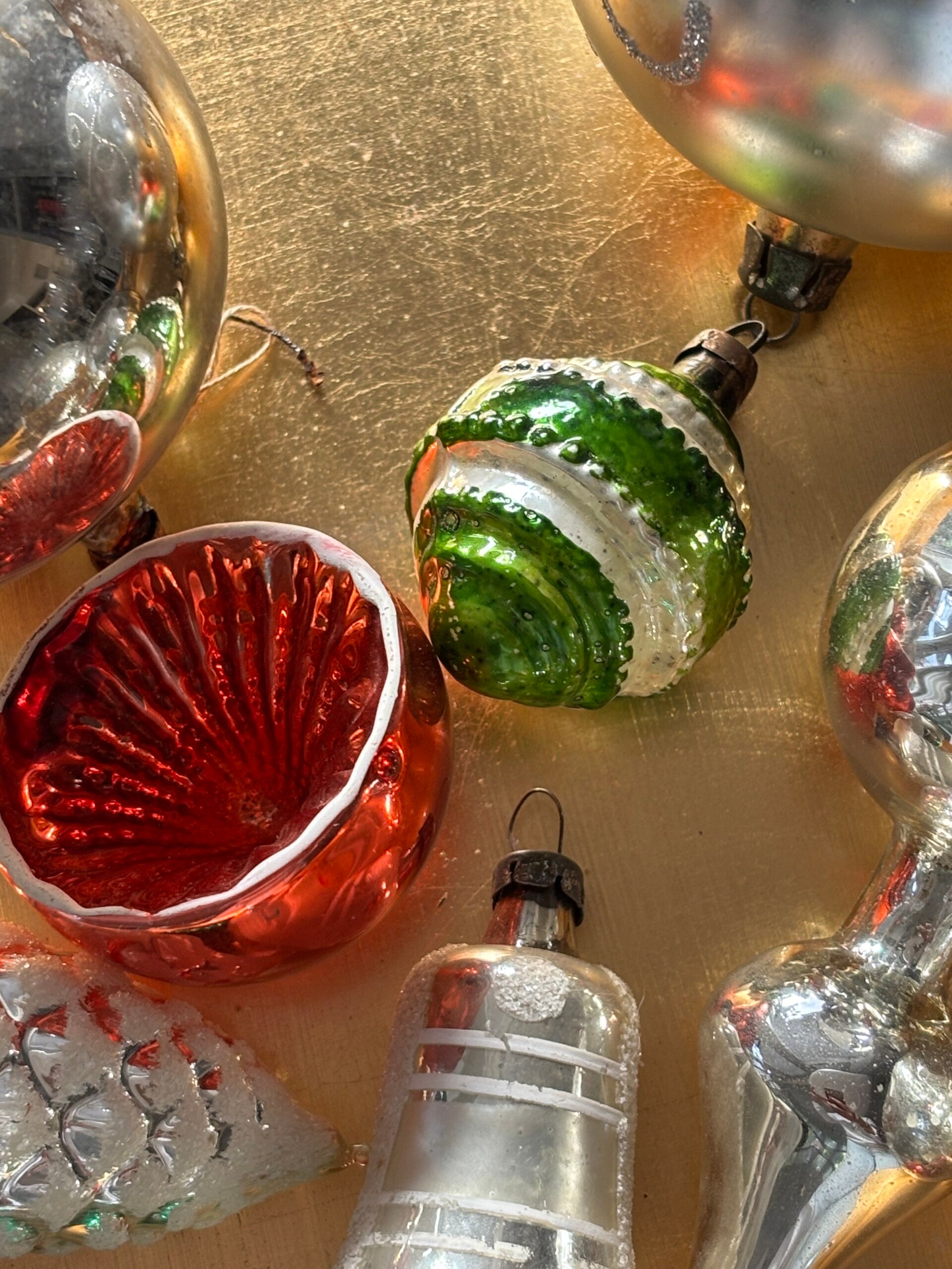 Set of 12 antique glass christmas ornaments. Add vintage charm to your holiday decor with this beautiful collection of original, hand-blown glass ornaments. A variety of shapes and colors, each piece is unique! Perfect for collectors or as eye-catching accents in your tree.