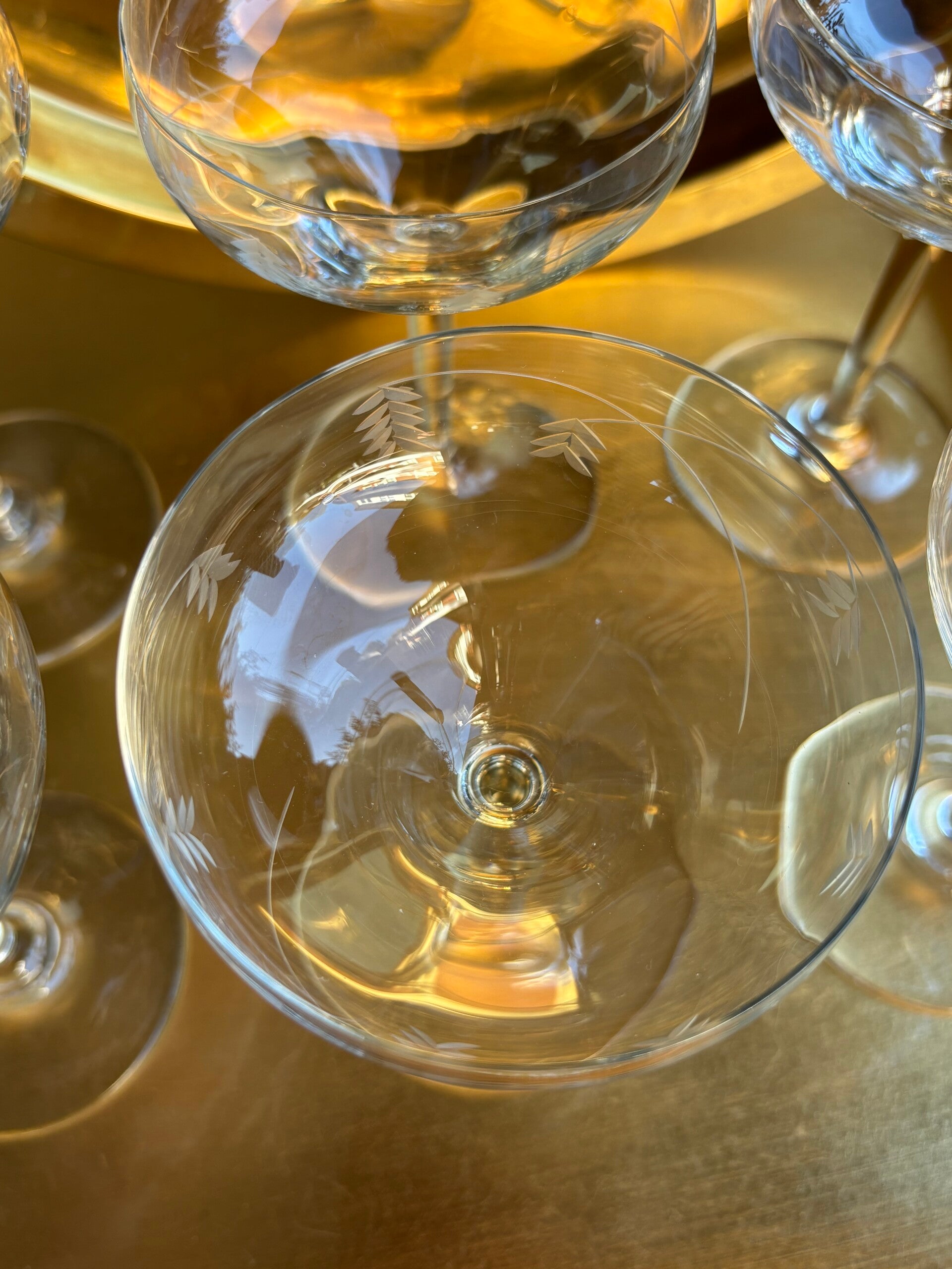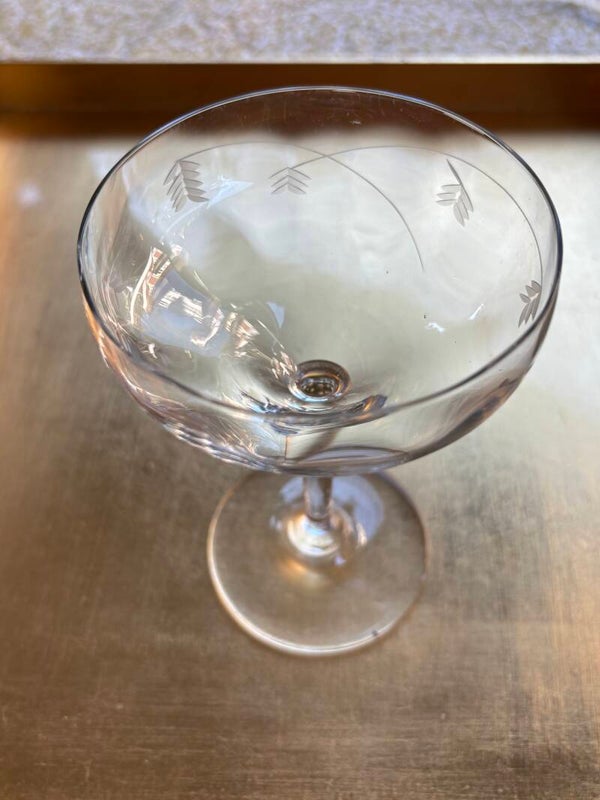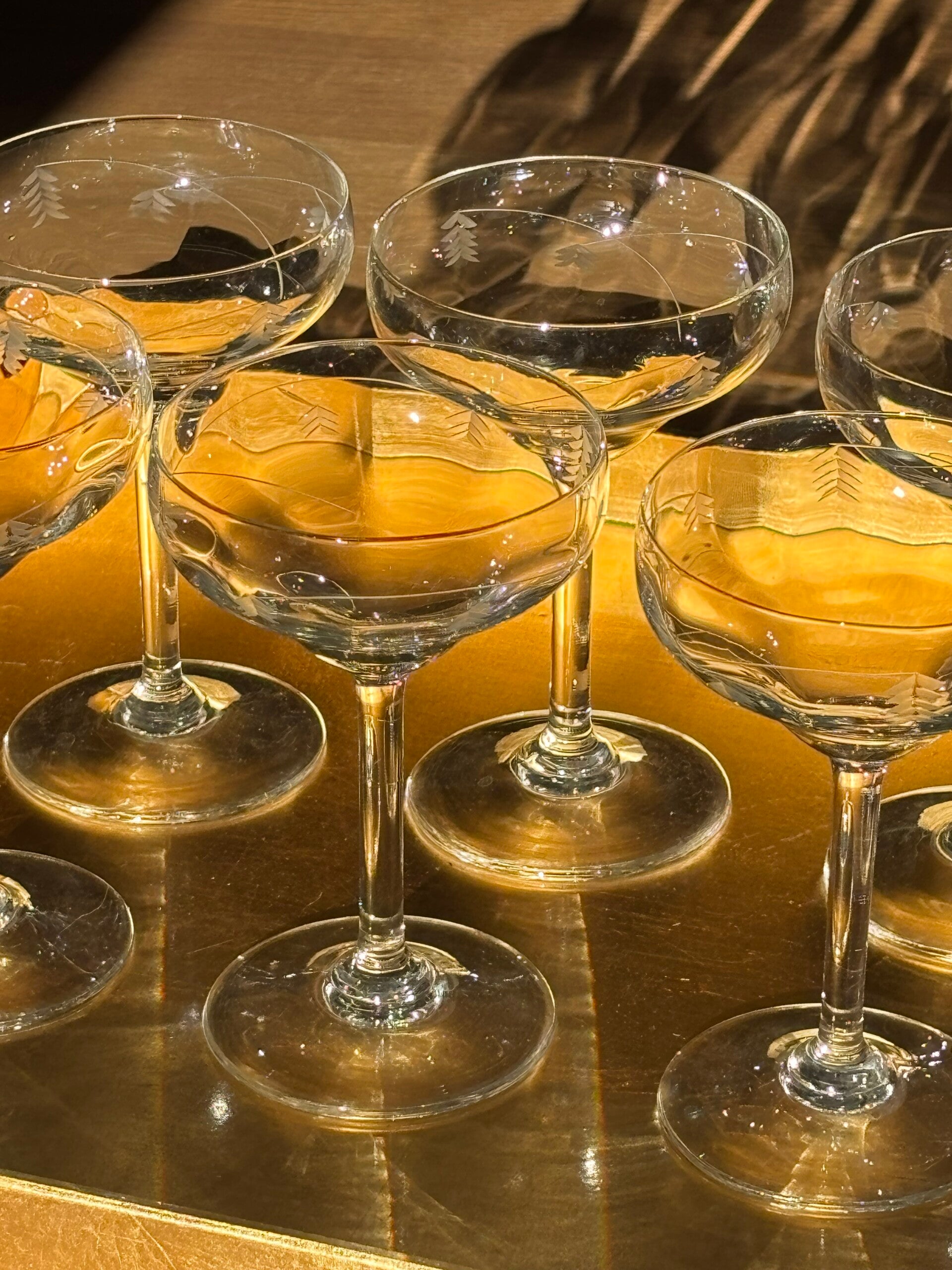 Festive set of 6 refined Champagne coupes with elegant floral pattern.