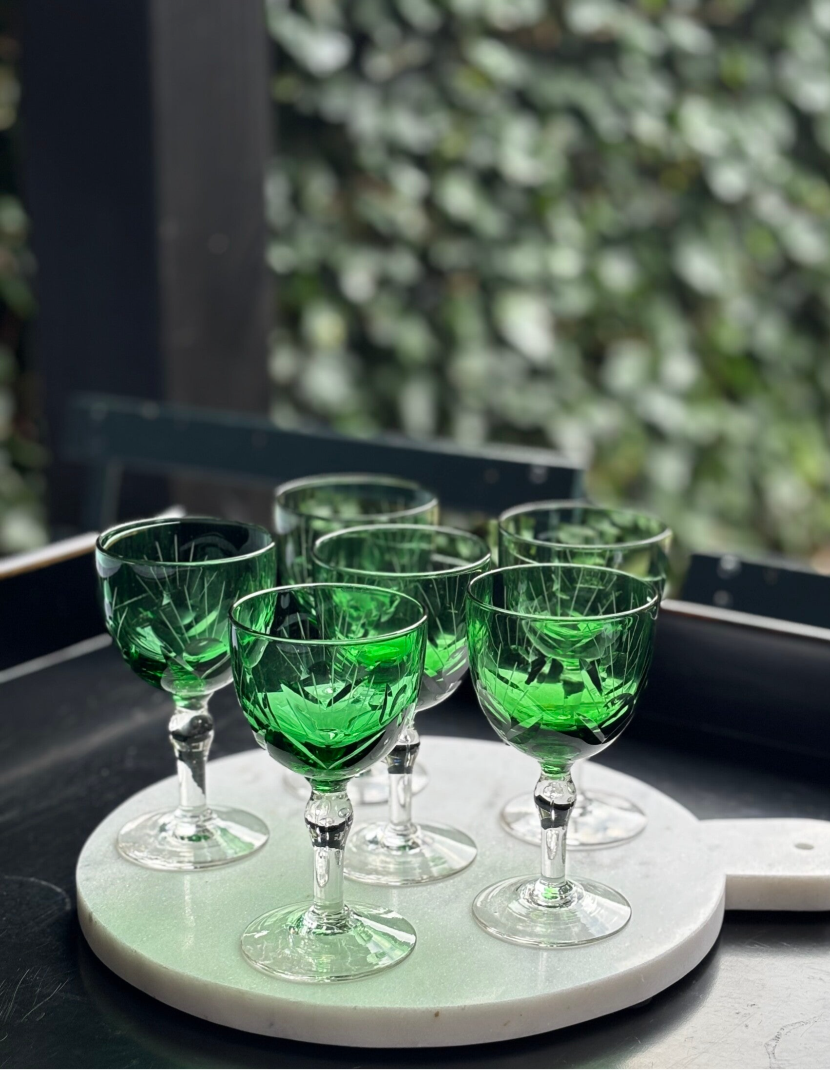 6 Antieke kristallen glazen in diepgroen. Mooi gegraveerd en vol elegantie, perfect voor liefhebbers van karaktervolle tafeldecoratie. H: 12,7 cm. D: 7 cm. Herkomst: Frankrijk.