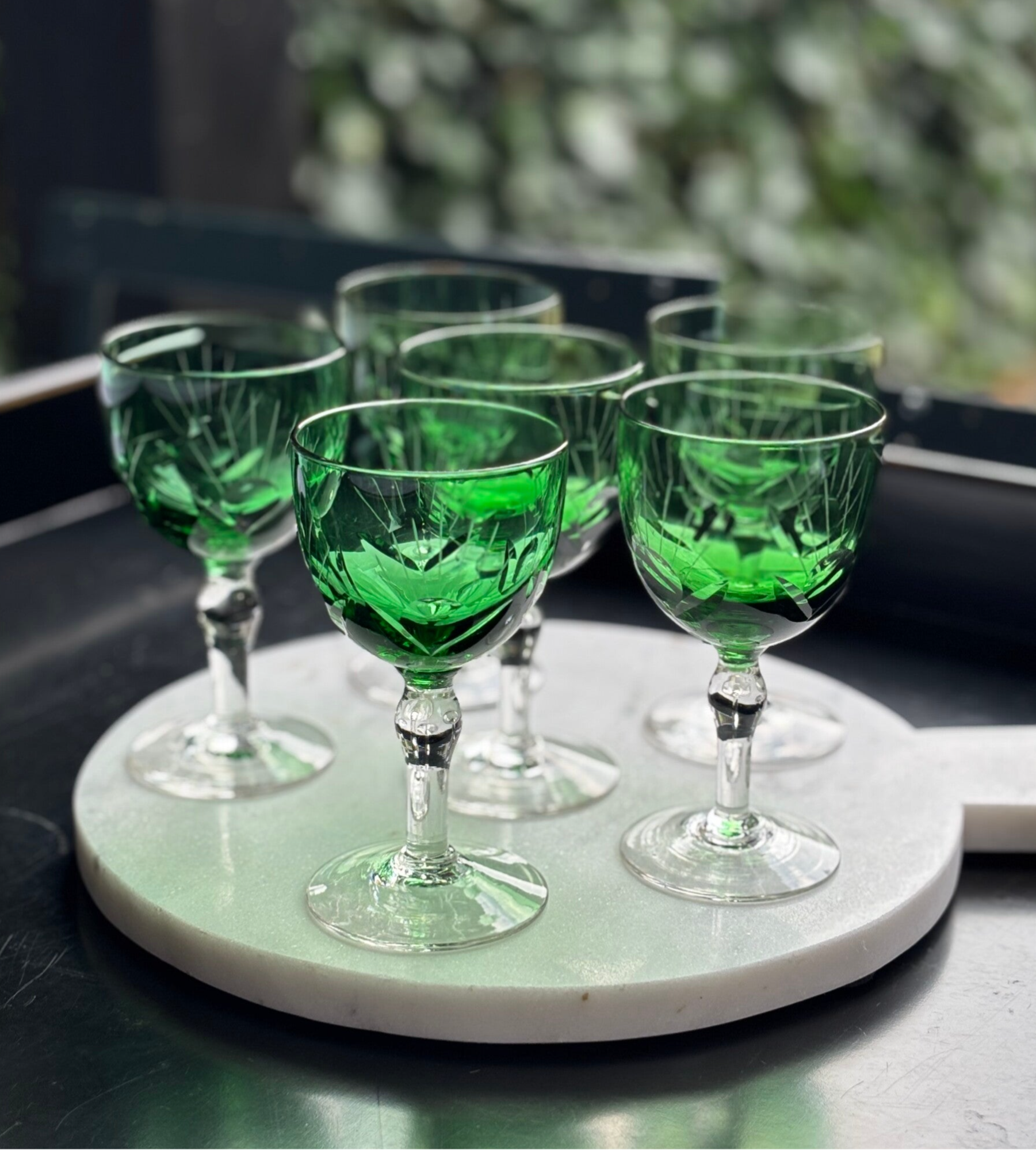 Set of 6 French antique deep green crystal glasses. Beautifully engraved, full of elegance, ideal for those who appreciate timeless tableware. H: 12,7 cm. D: 7 cm.