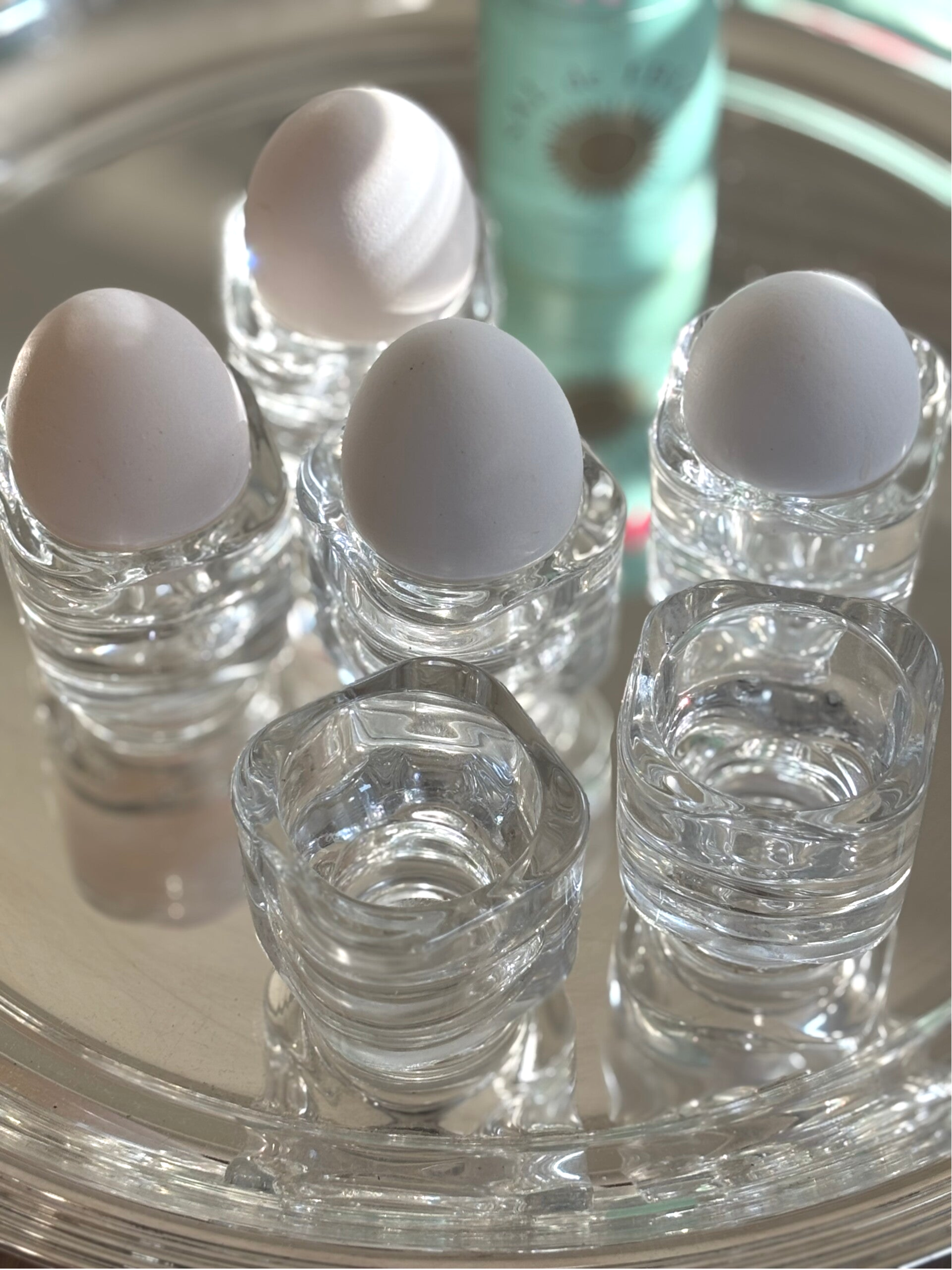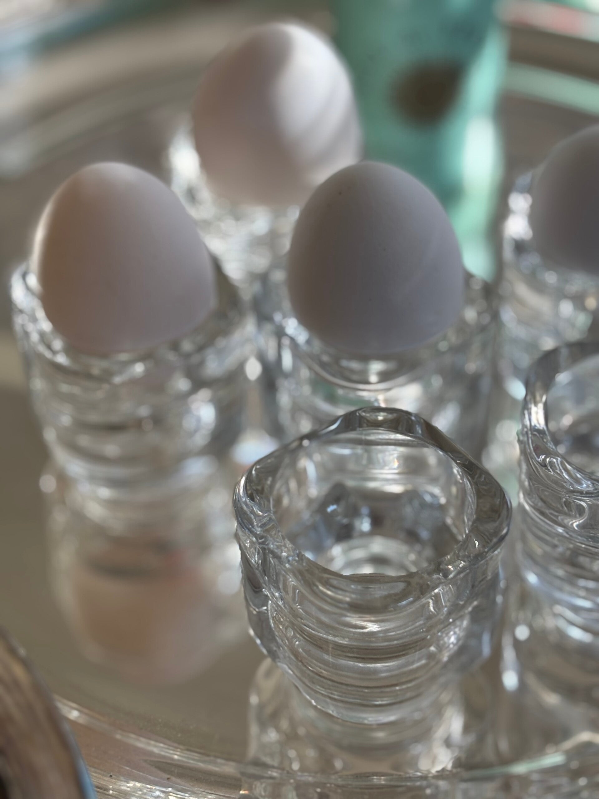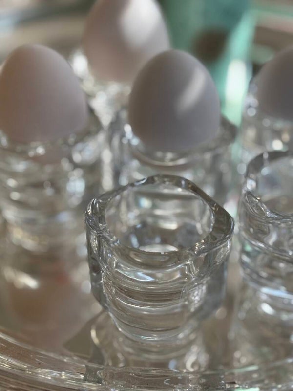 6 Italian crystal egg cups by ItalCrystal. Elegant and timeless design, perfect for a stylish breakfast table.