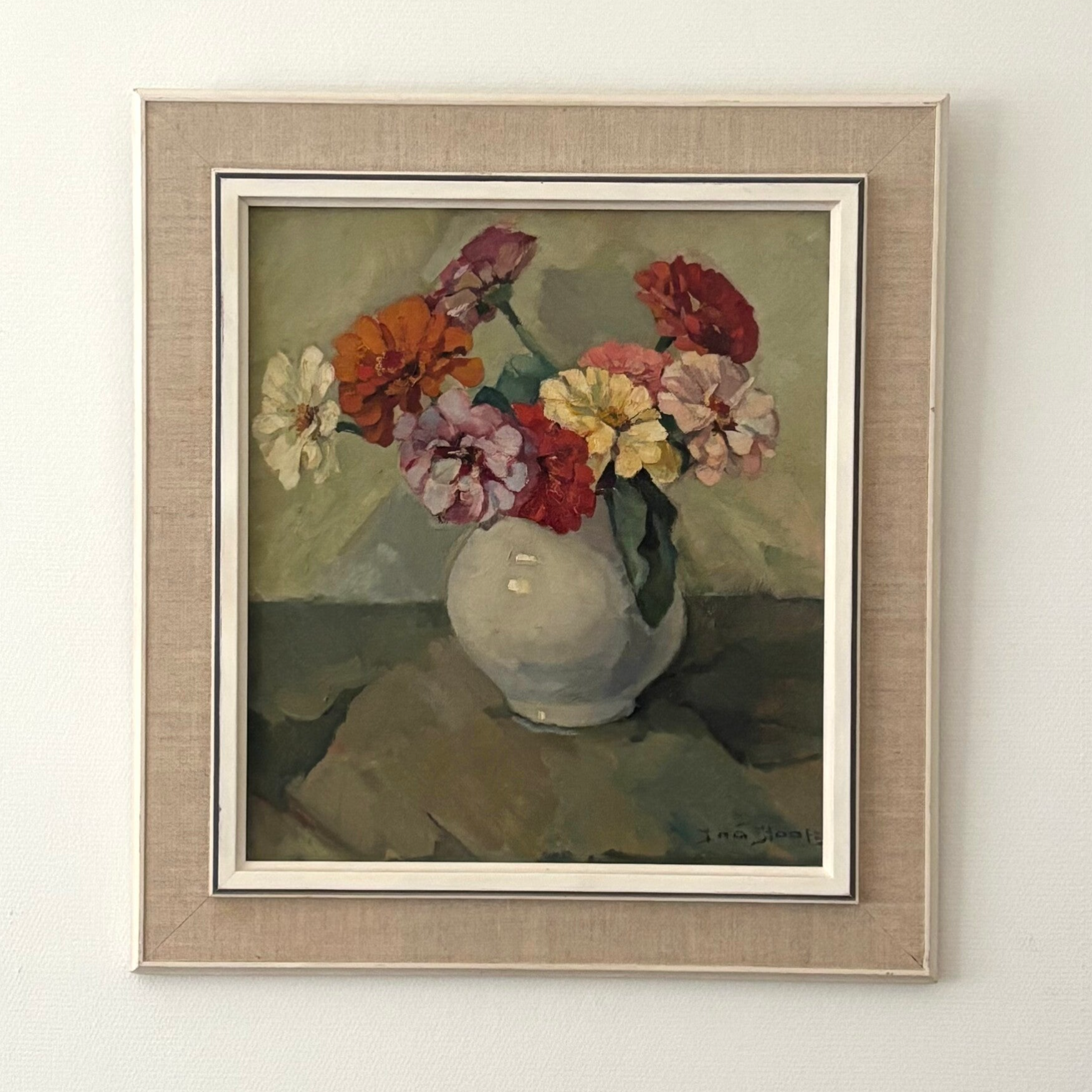 Antique oil painting of a charming still life, signed by A.A.M. Hooft (b. 1894). Beautiful use of color and well-balanced composition. In good condition. Dimensions: 44 x 39 cm.