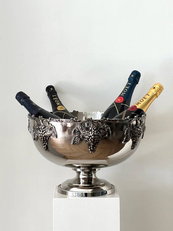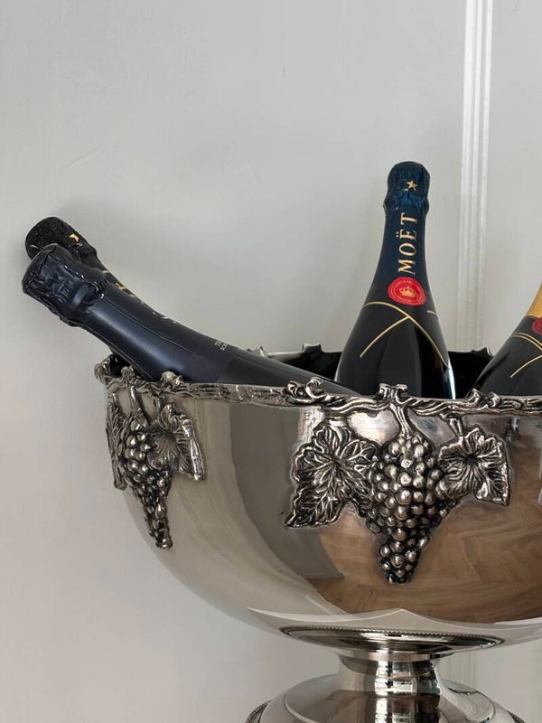 Schitterende XL Champagnekoeler op voet, rijk gedecoreerd met druivenranken. Geschikt voor circa 4-6 flessen. Een echte eyecatcher op tafel!