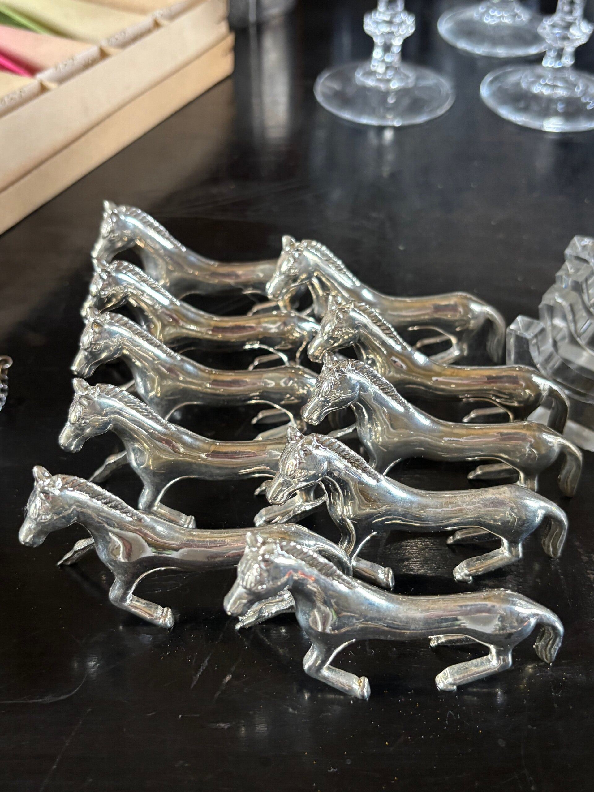 Set of 10 silver-plated knife rests shaped like horses. A stylish and playful touch for an elegant table setting.