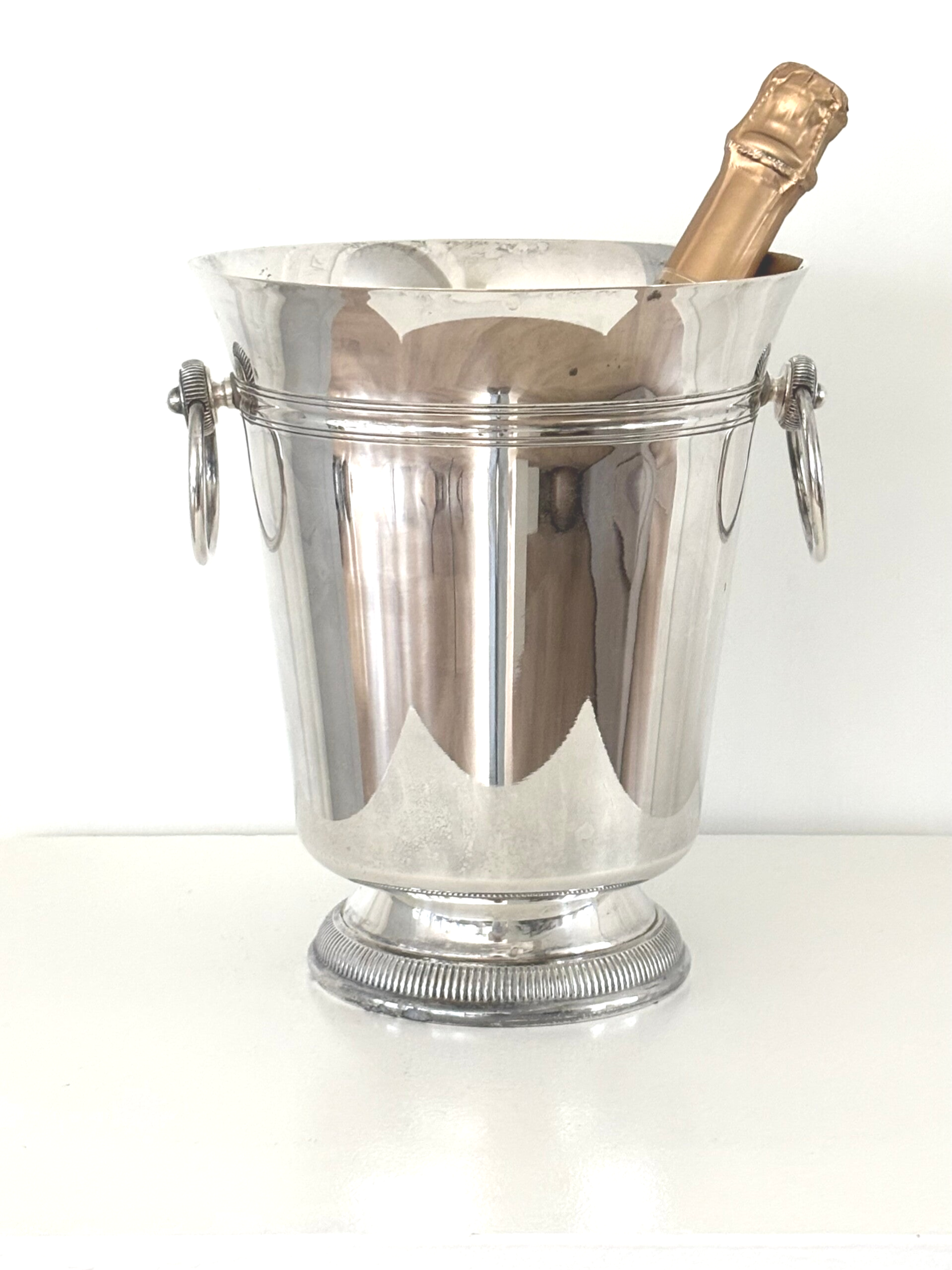 Beautiful classic silver-plated French Champagne cooler with timeless elegance. Subtle age marks add to its character. Marked on the underside. Height: 23.5 cm.