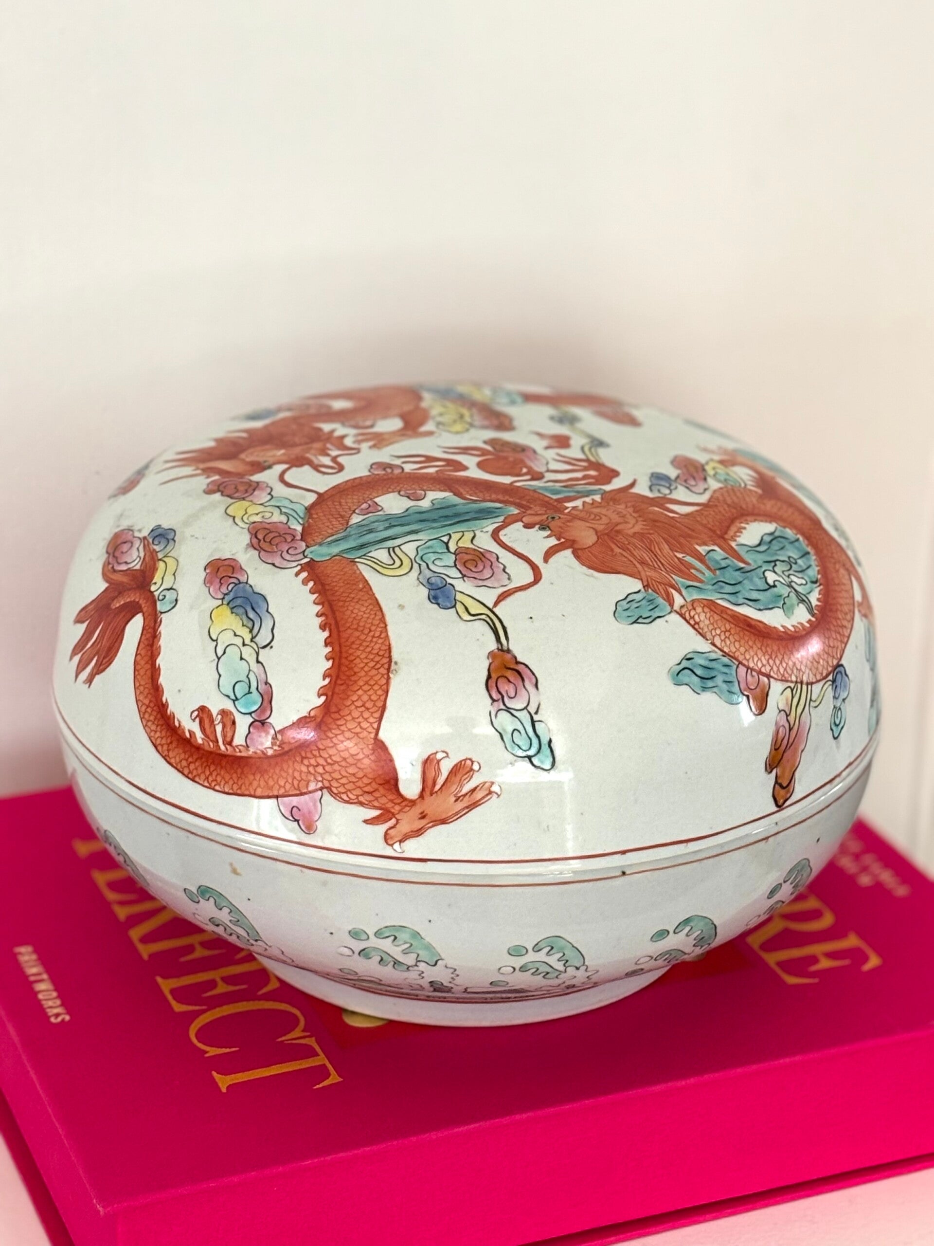 Grote Chinese ronde dekselpot met prachtig drakendecor. Een ware eyecatcher in elk interieur. Afmetingen: 17 x 27,5 cm.
