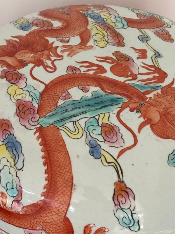 Large Chinese round lidded jar with exquisite dragon motif. A true eye-catcher in any interior. Dimensions: 17 x 27.5 cm.