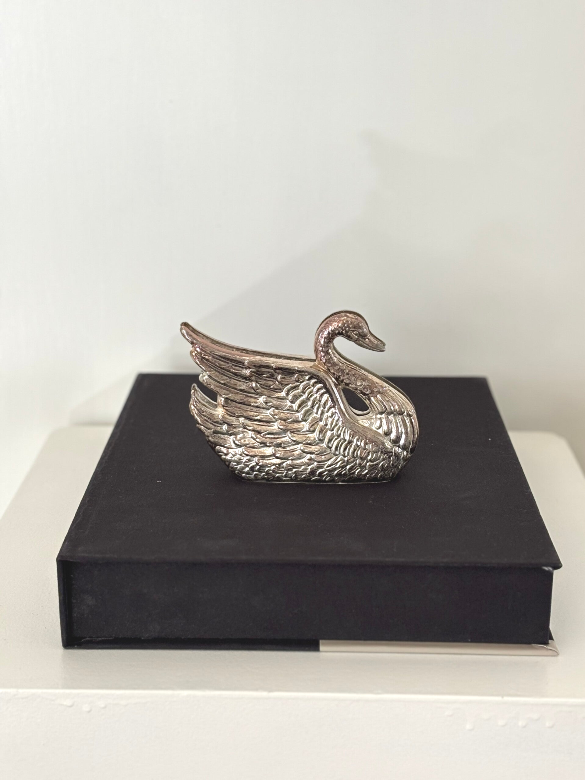 Silver-plated napkin holder in the shape of an elegant swan. A refined accent for any table. Dimensions: 15 x 11 cm.