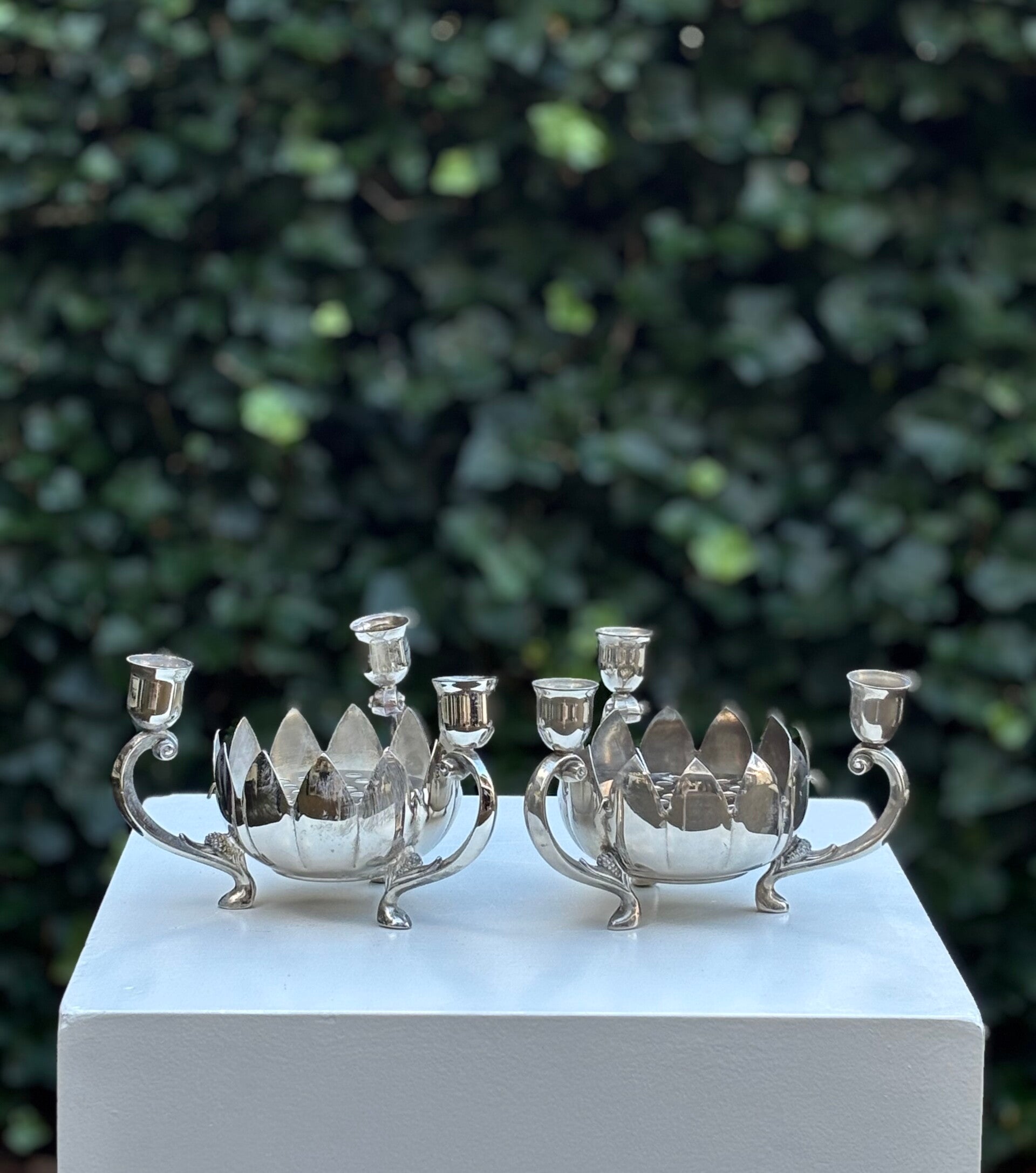 Verzilverde kaarsenhouders ‘Lotus’ met pique-fleur. Een verfijnd en sculpturaal ontwerp.