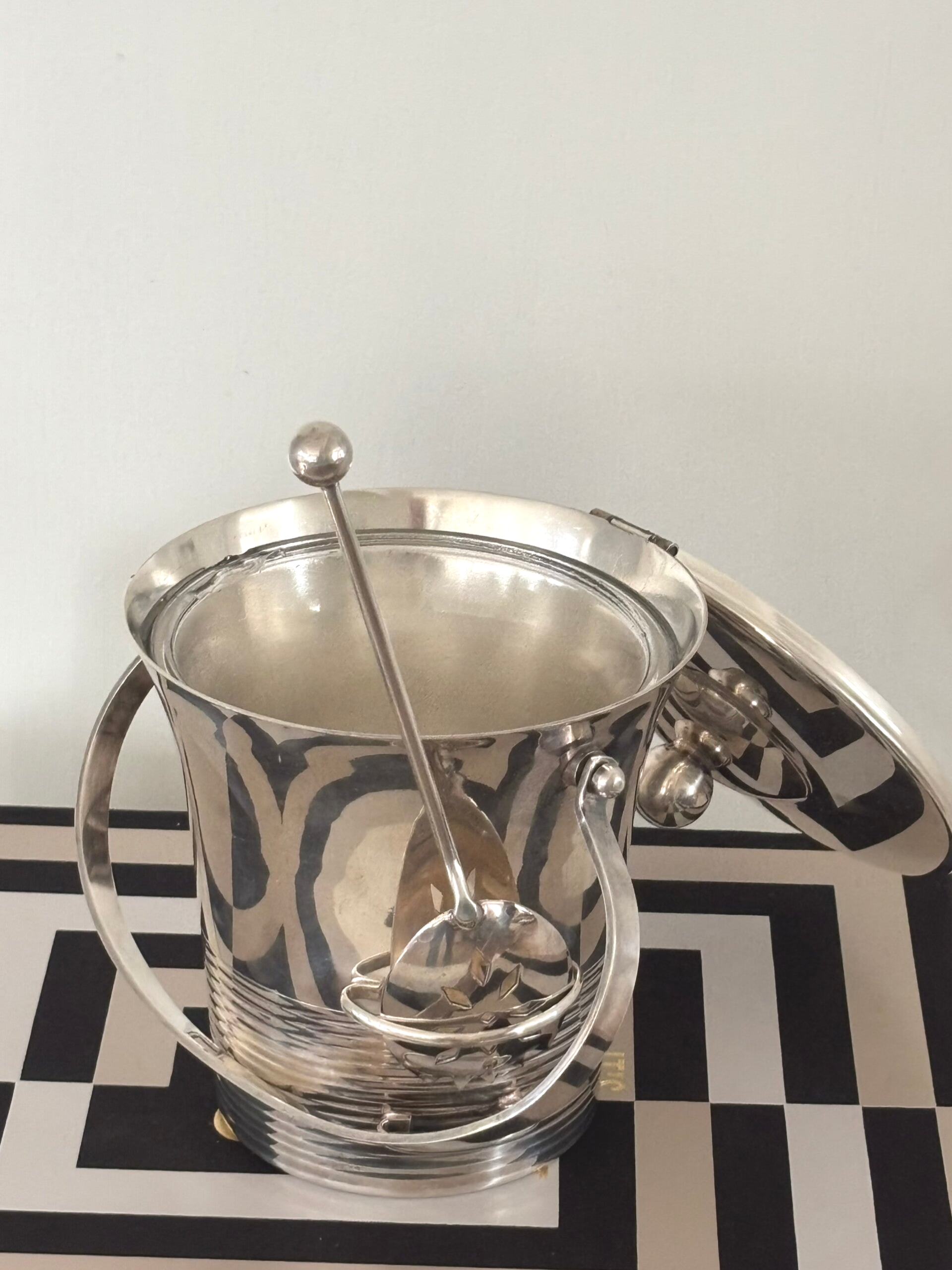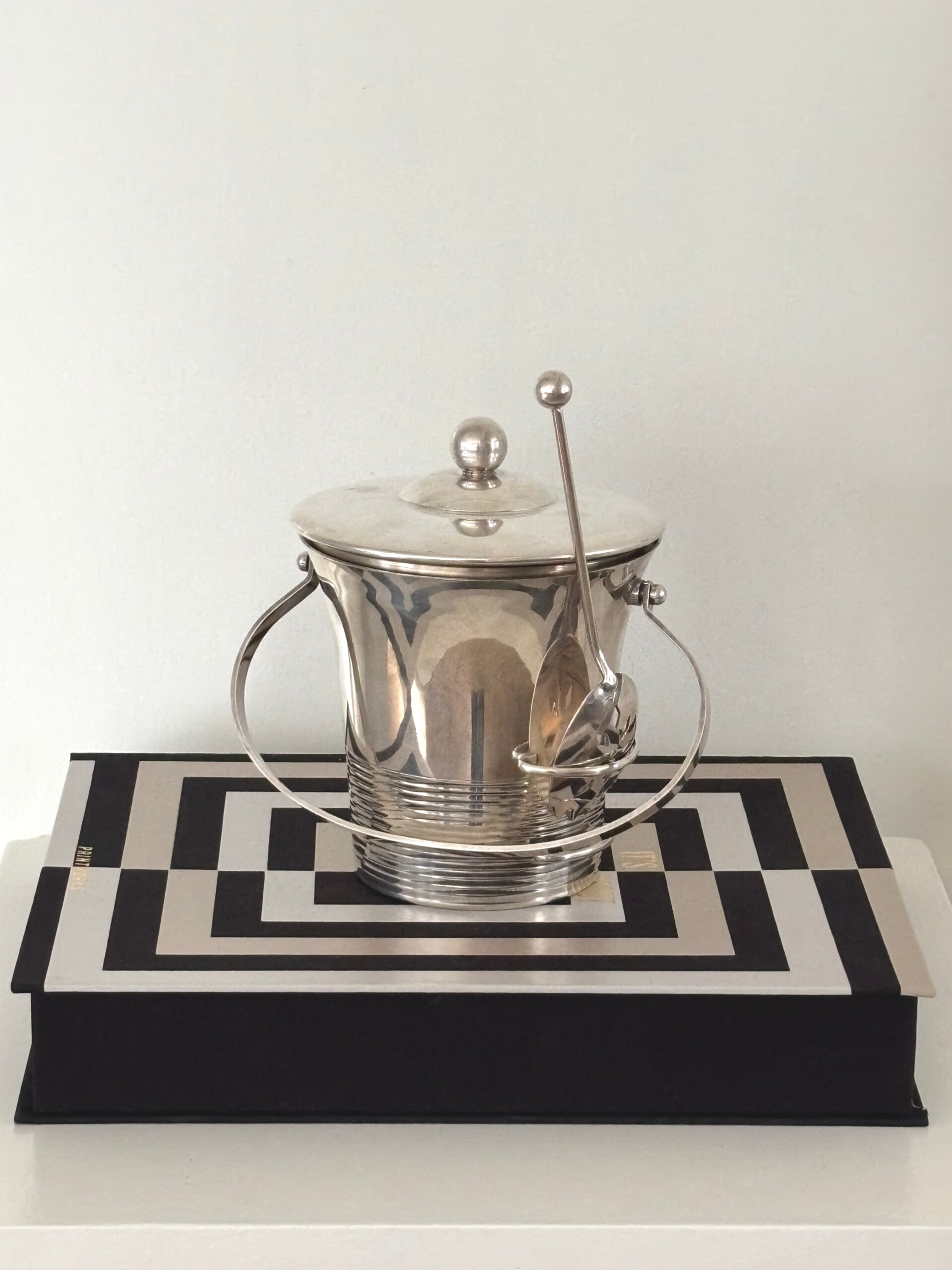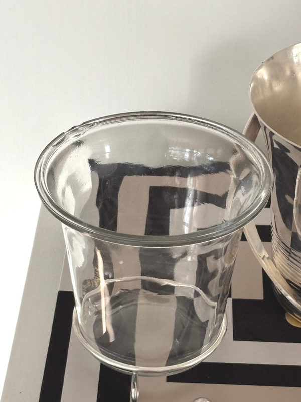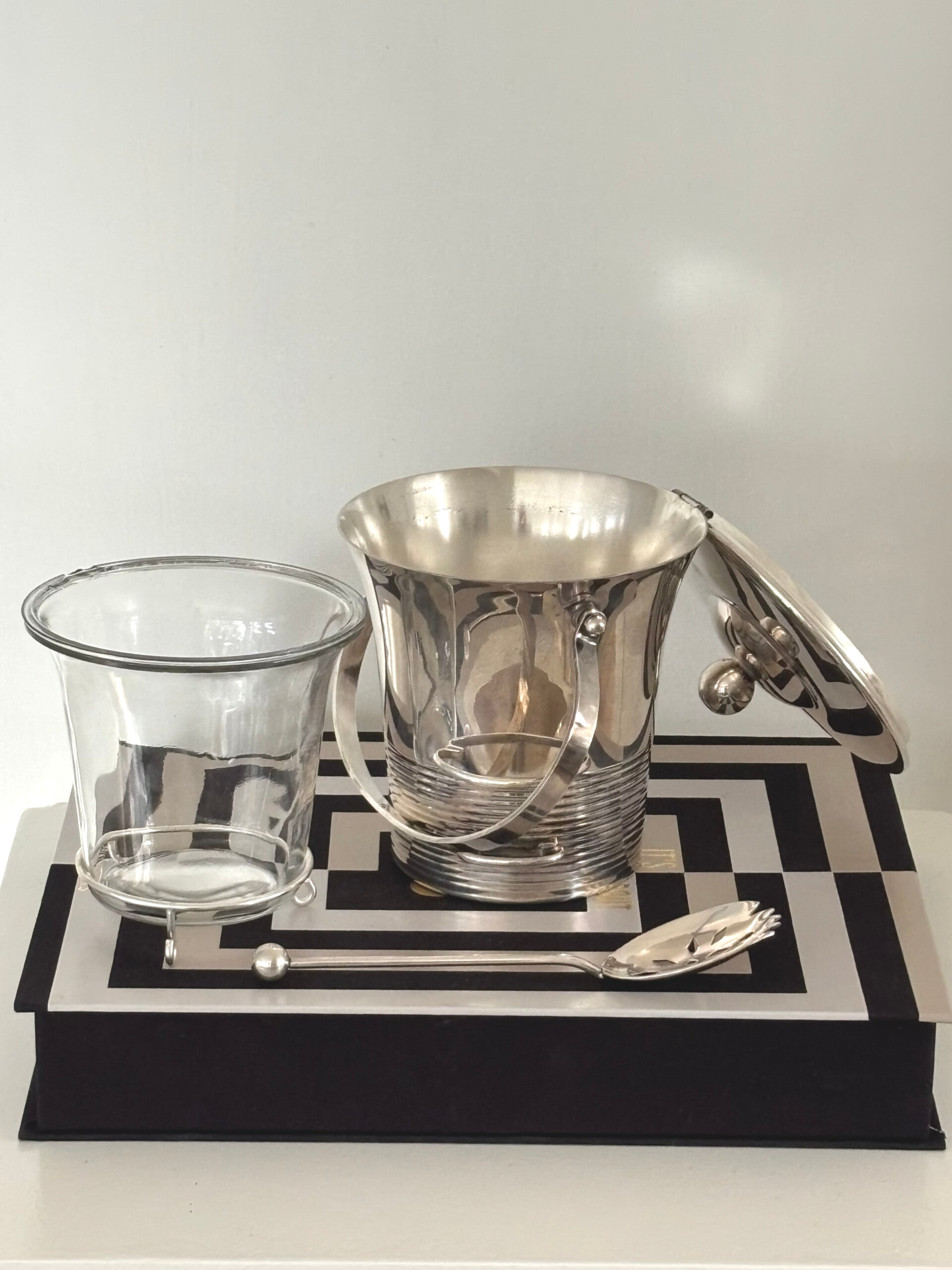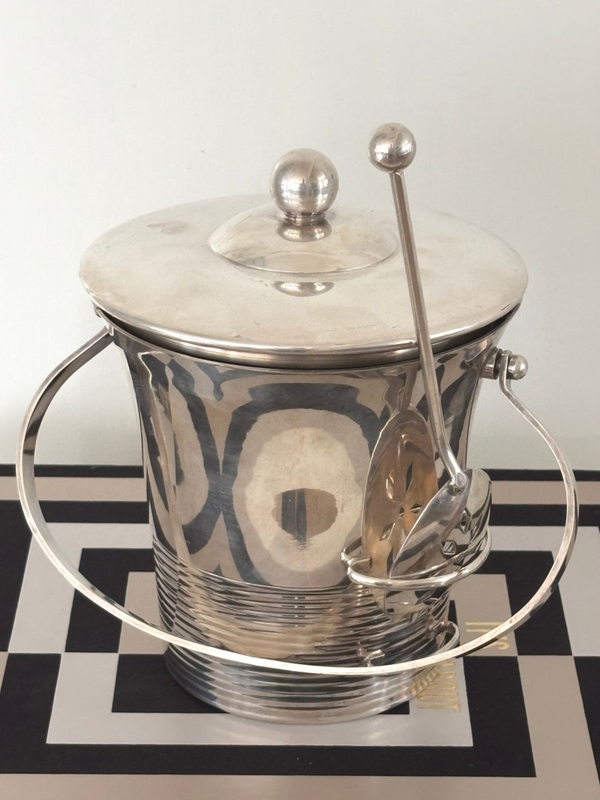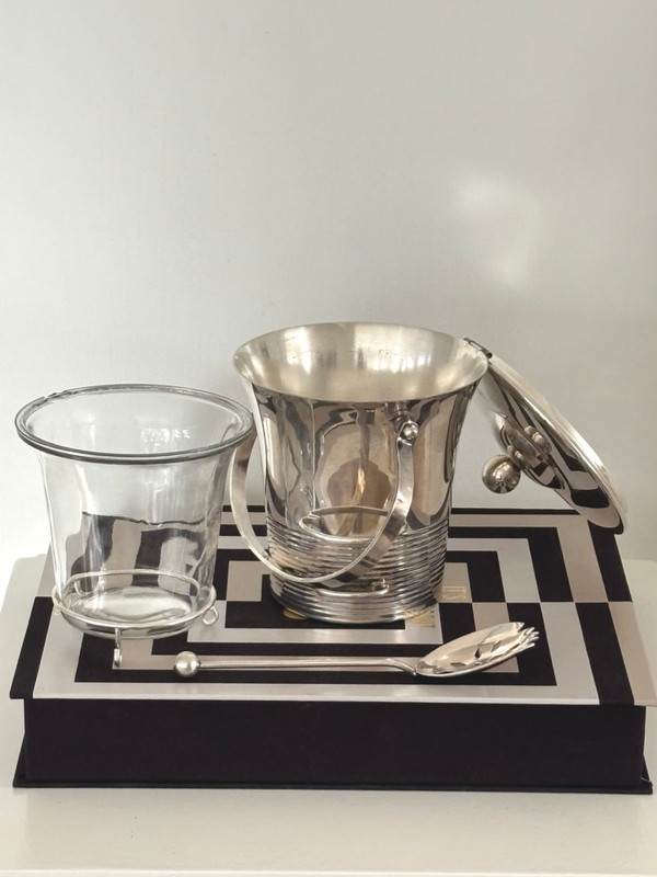 Silver-plated ice bucket with removable glass inlay and ice scoop by Maison Deschamps. Marked on the underside ‘Glacego Déposé, Made in France’. Dimensions: approx. 16 x 14.4 cm. A stylish piece for the bar, in beautiful vintage condition.