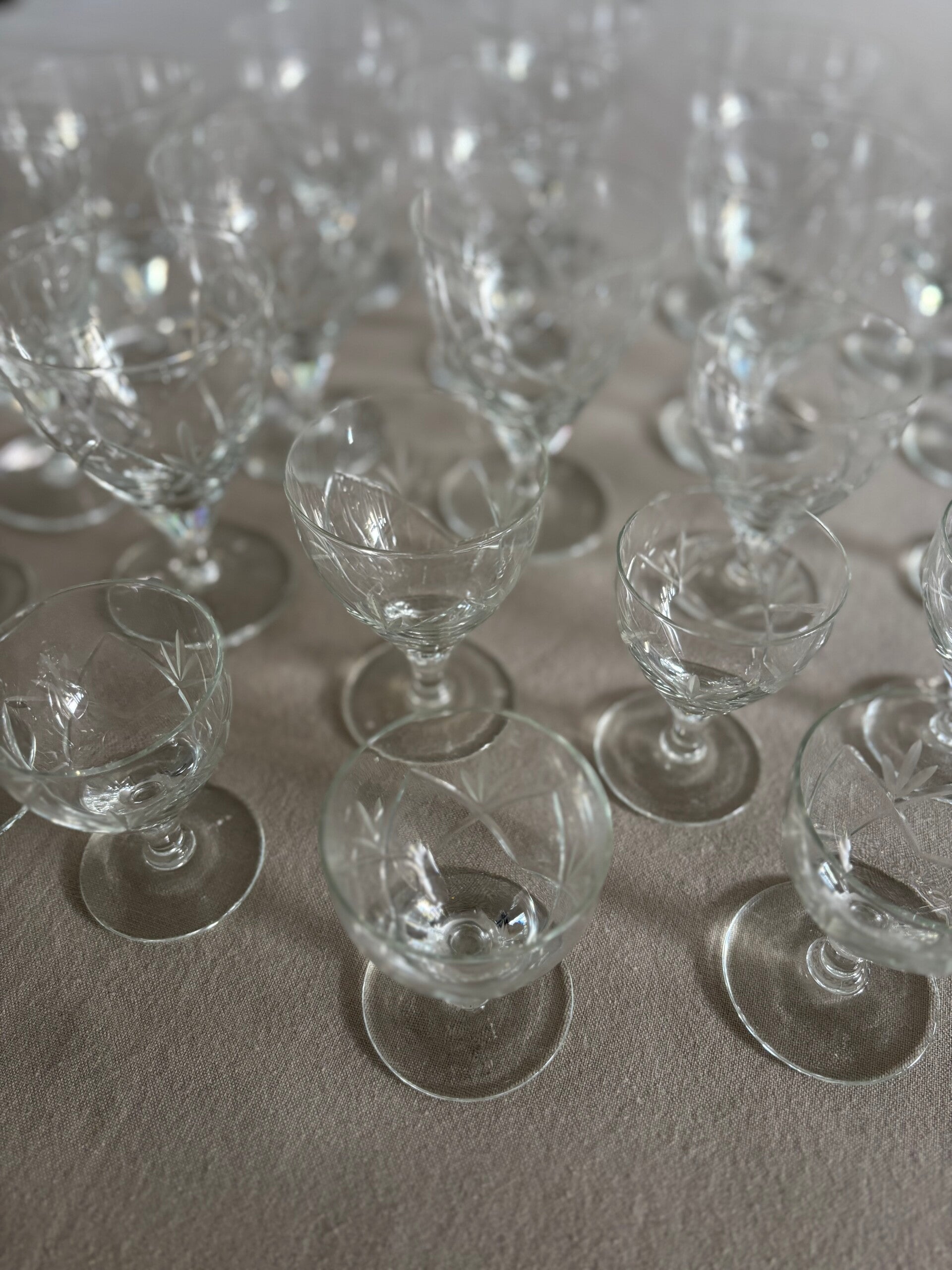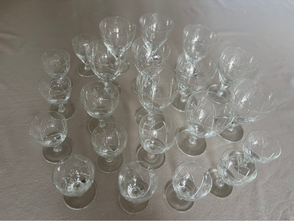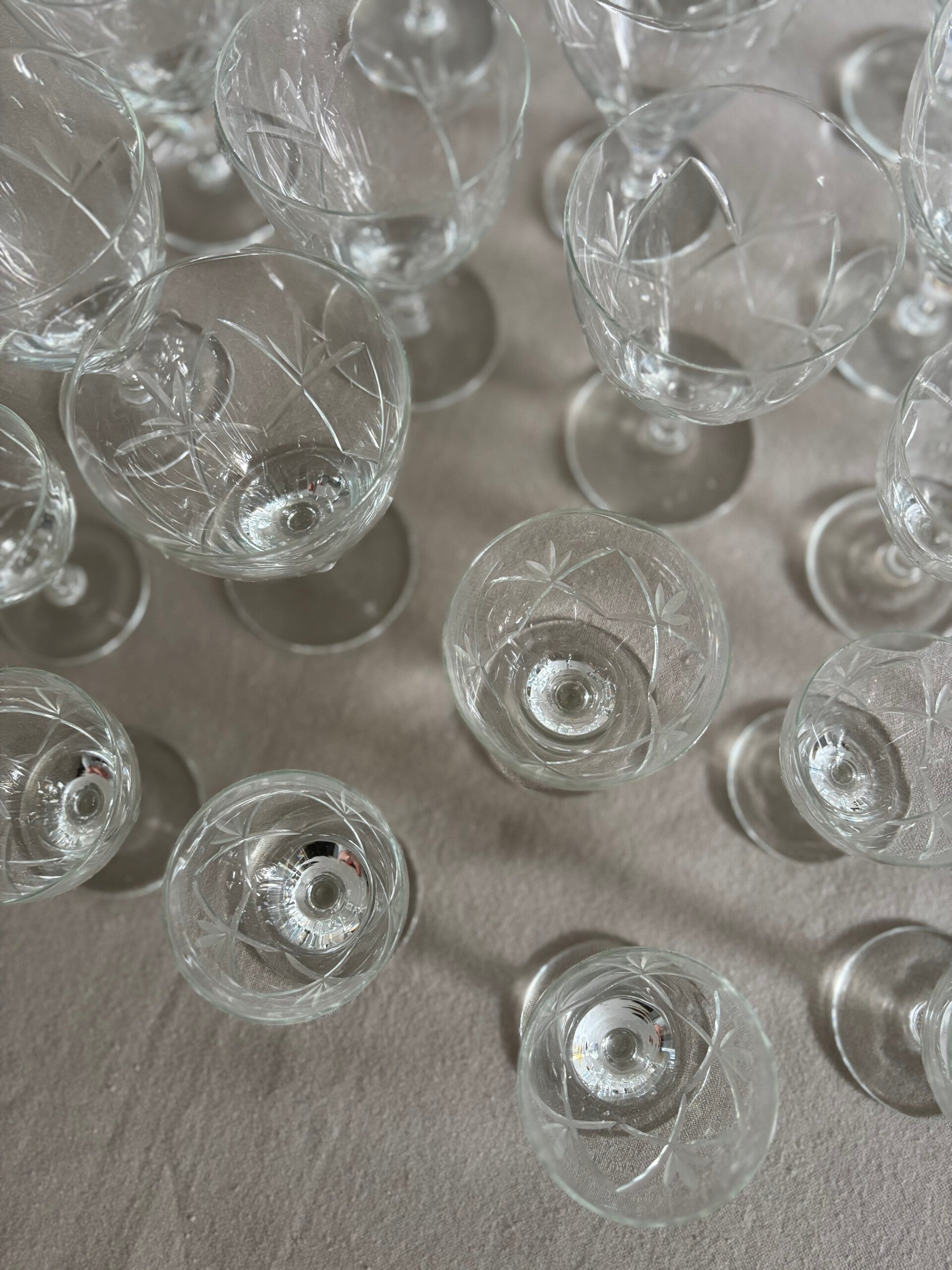 22-piece set of crystal glasses with goblet shape and short stem, beautifully cut in a refined pattern (see detail photos). The set includes 10 large, 2 medium, and 10 smaller glasses. Perfect for a festive occasion.