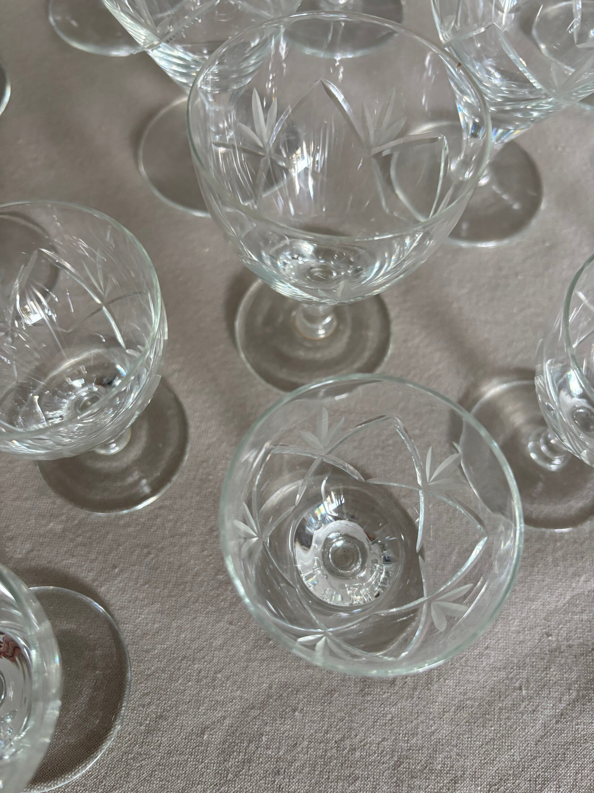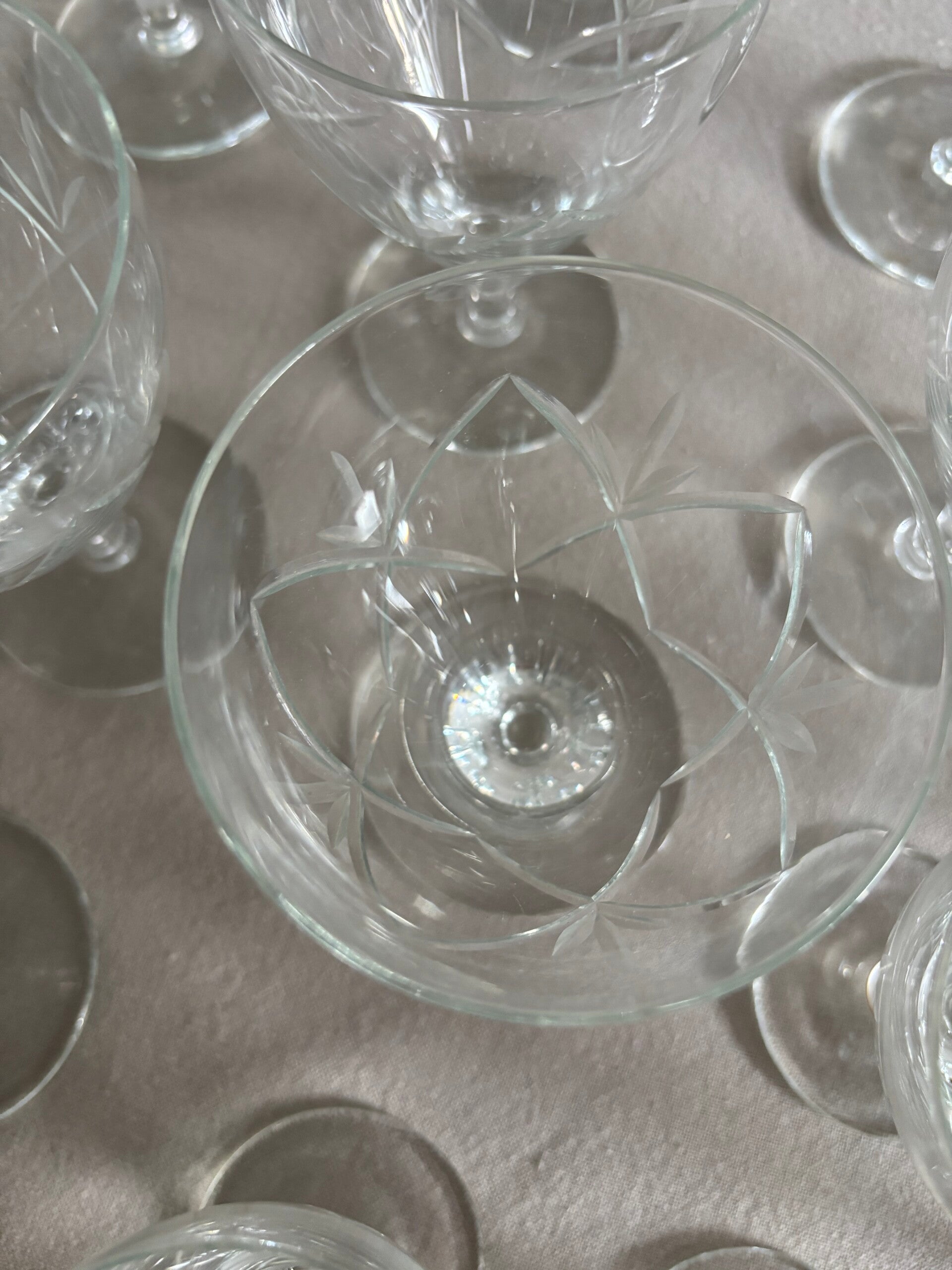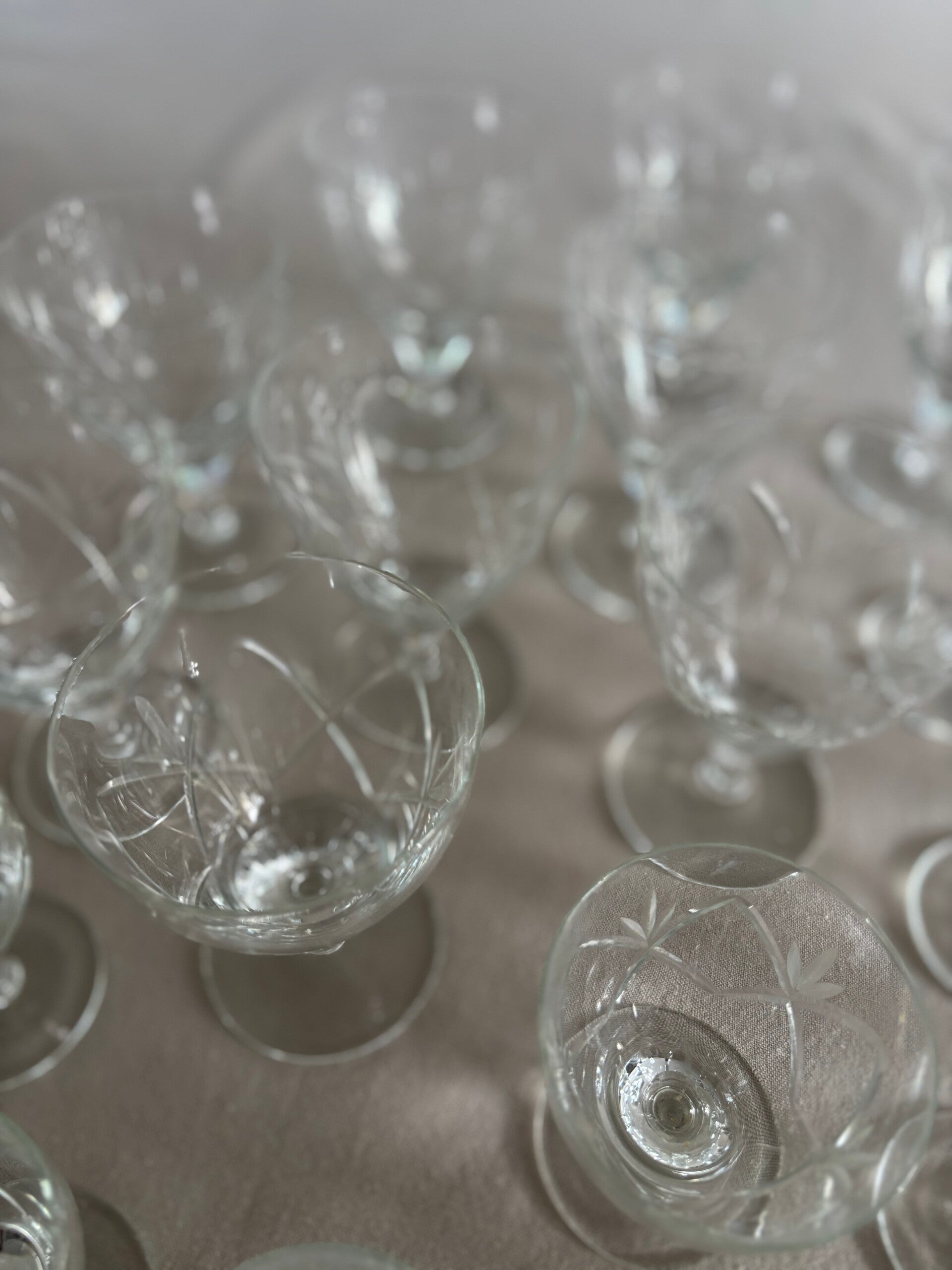 22-delige set kristallen glazen met kelkvorm en kort voetje, prachtig geslepen in een verfijnd patroon (zie detailfoto’s). De set omvat 10 grote, 2 middelgrote en 10 kleinere glazen. Perfect voor een feestelijk moment.