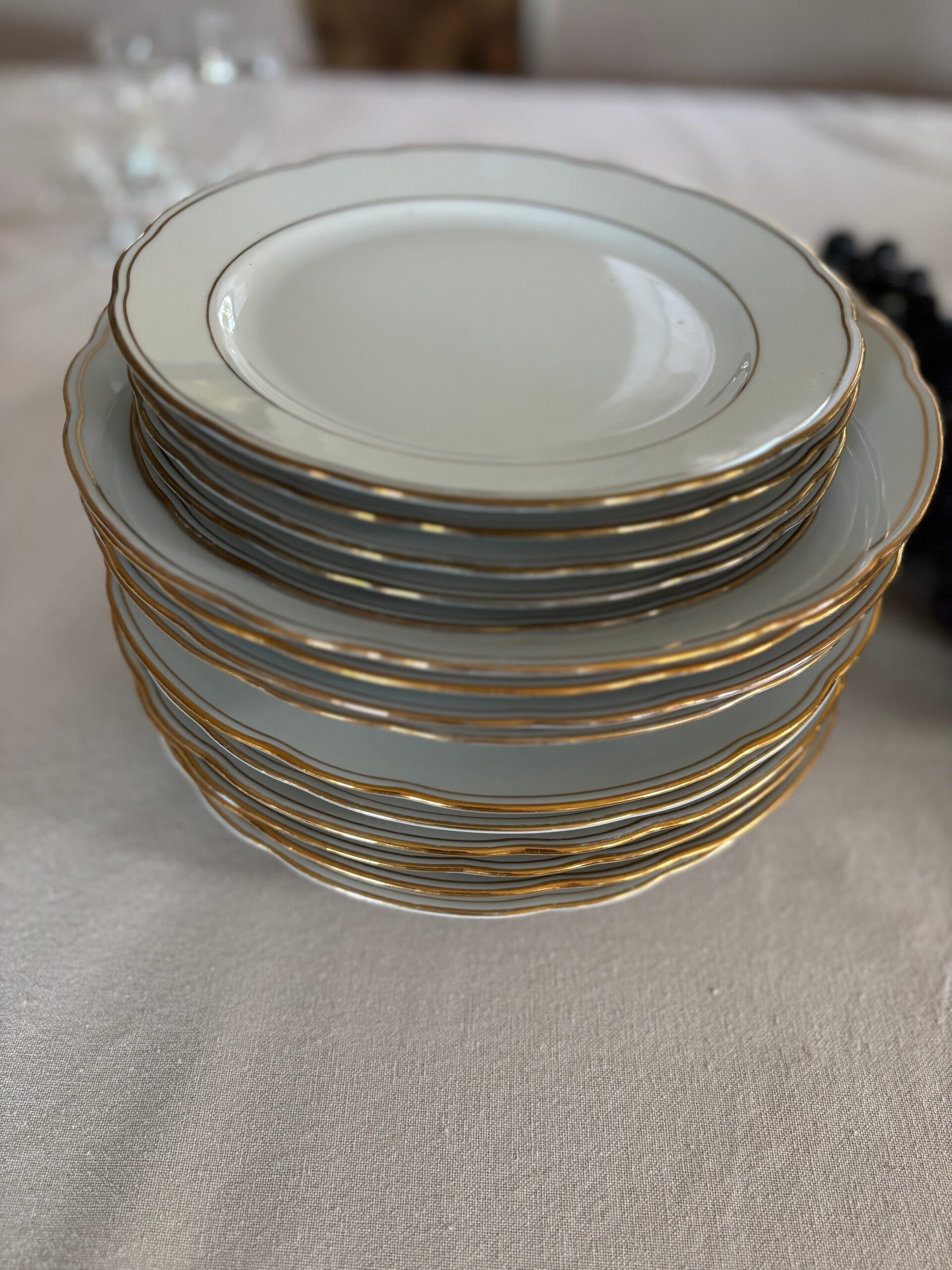 19-piece plate set Feston by Schirnding Bavaria, featuring an elegant and timeless design. The set includes 8 dinner plates, 6 deep plates, and 5 small plates. Diameter: 24, 23.5, and 19.5 cm.