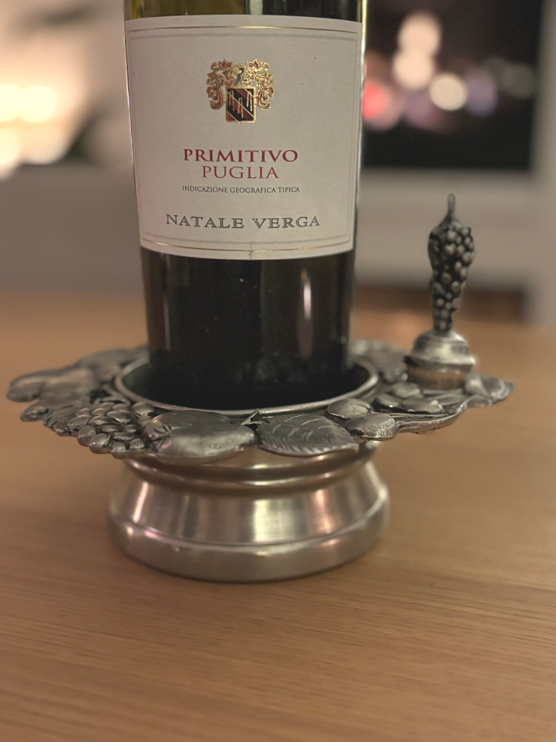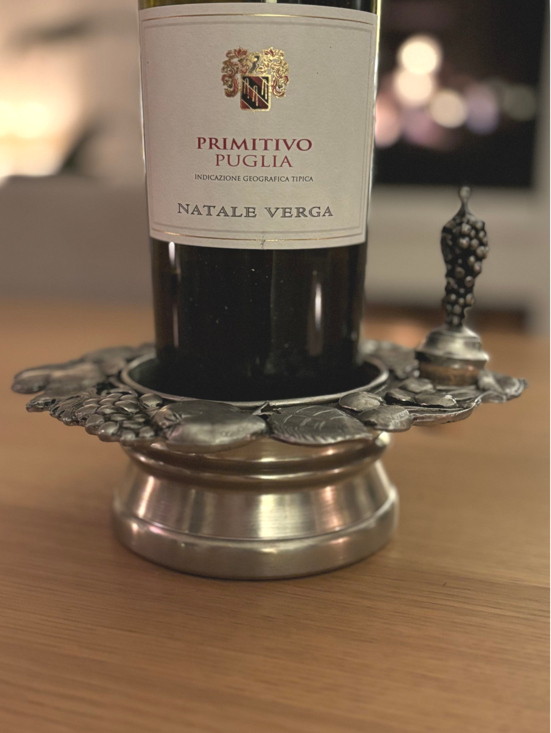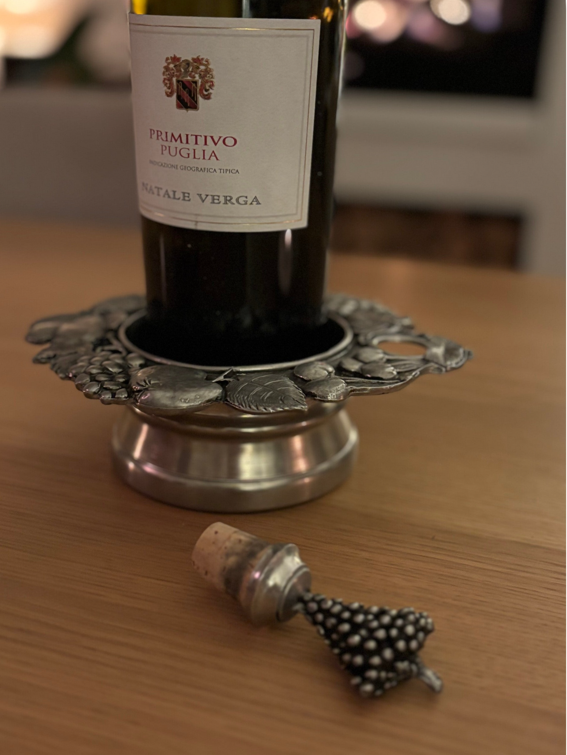 Beautifully decorated bottle coaster with matching loose stopper. A true eye-catcher on the table and a refined gift idea.