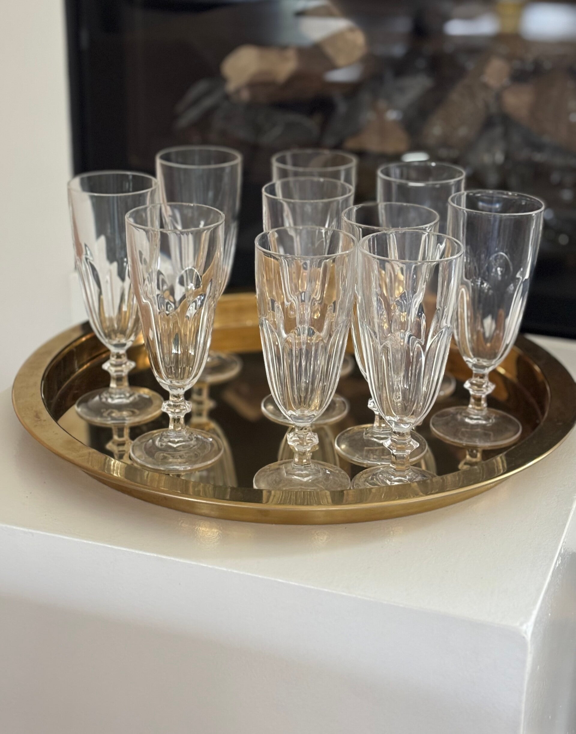 Beautiful set of 10 crystal Champagne glasses by Cristal d’Arques Durand, model Rambouillet. Festive and elegant. Dimensions: 15.5 x 6 cm.