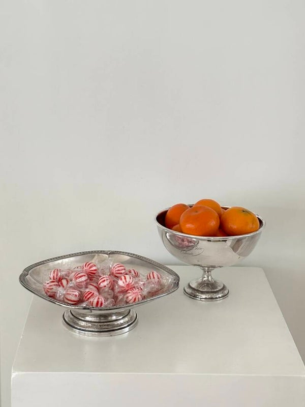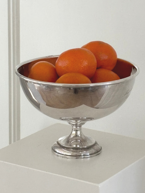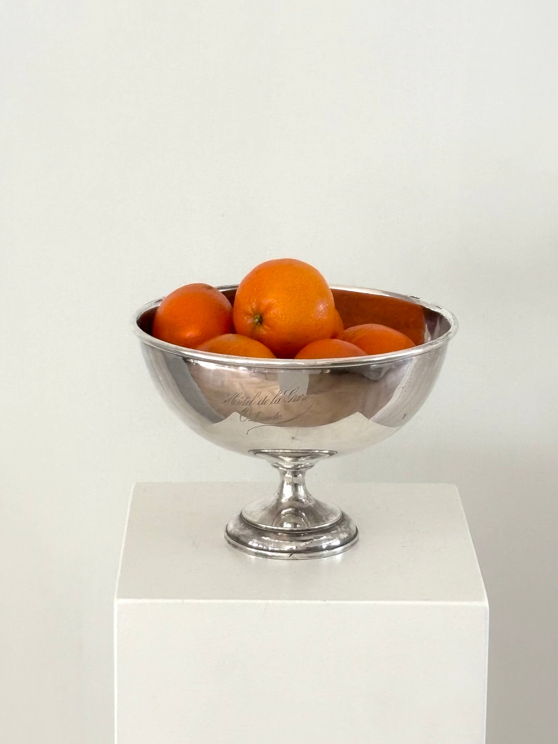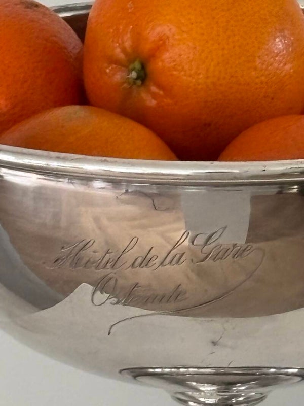 Silver-plated pedestal bowl engraved with ‘Hotel de la Gare Ostende’. An elegant and characterful piece with history. Dimensions: 18 x 13 cm.