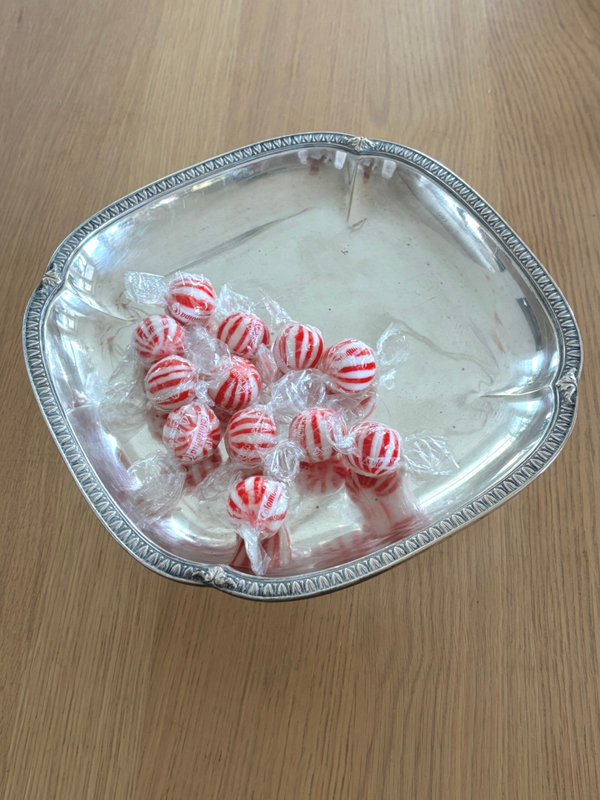 Verzilverde schaal op voet met zilvermerk ‘PM’ (Pieter Mourits, 1732–1789?). Een stijlvol en bijzonder stuk. Afmetingen: 22,5 x 22,5 cm, hoogte 7 cm.