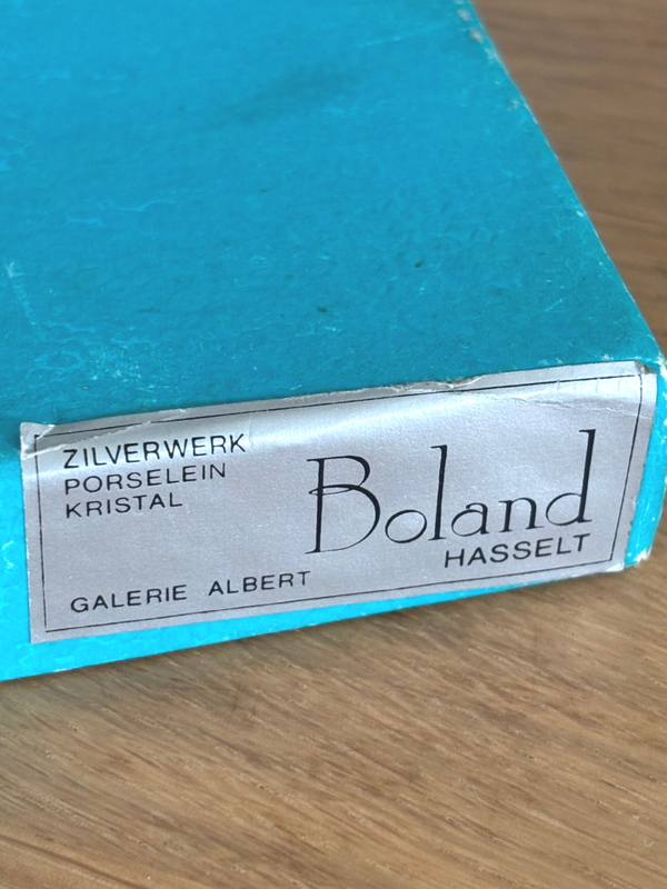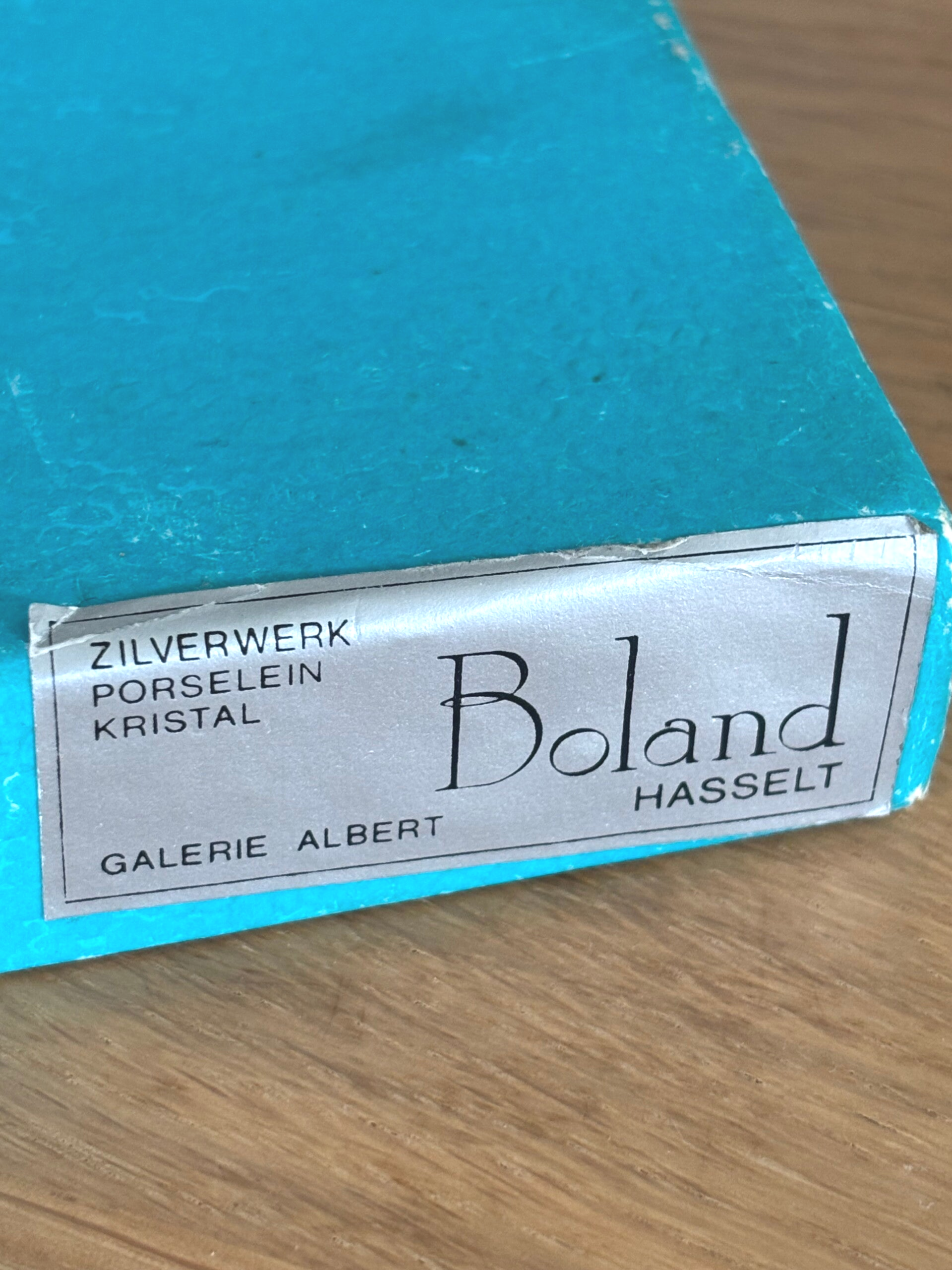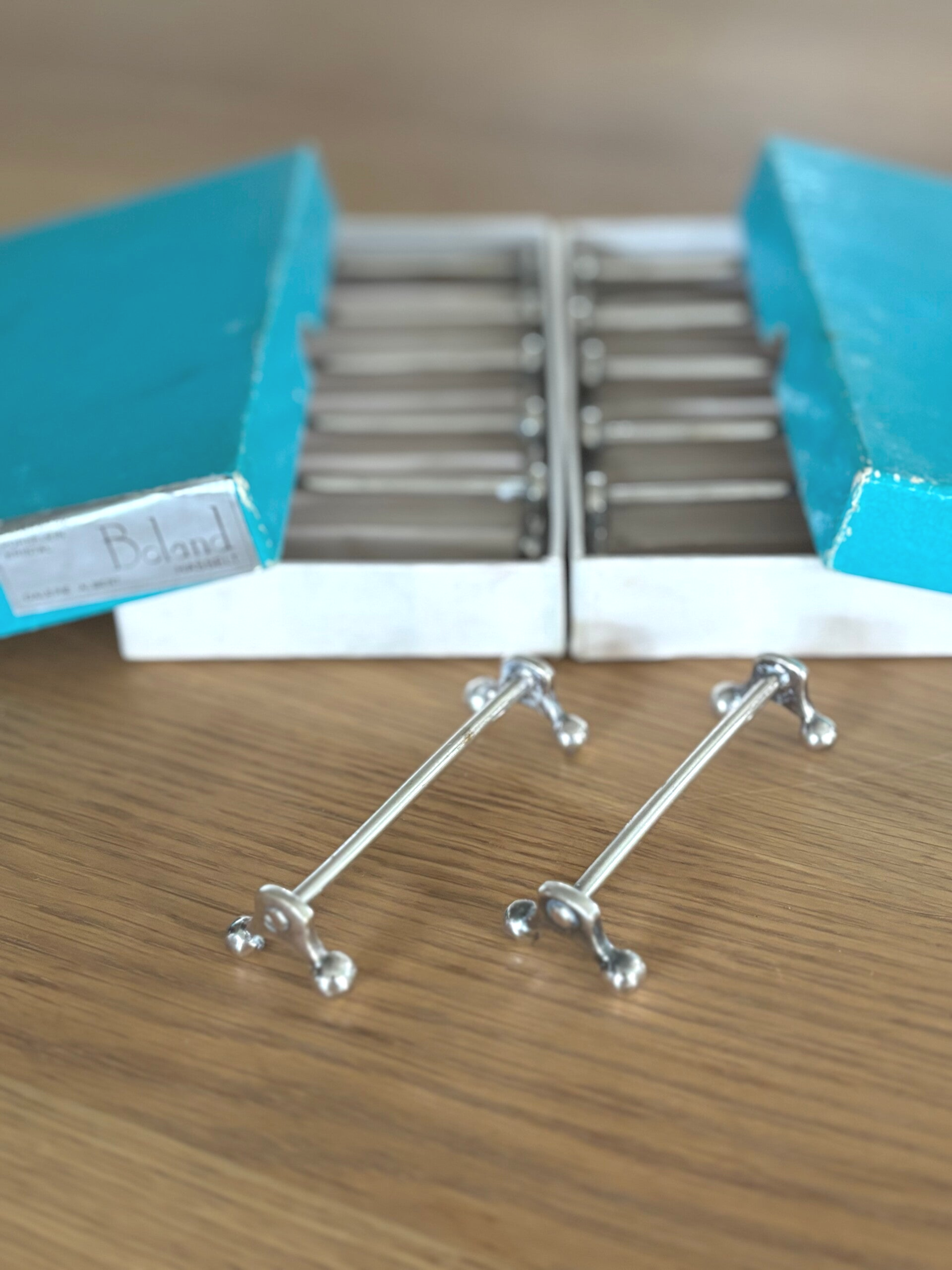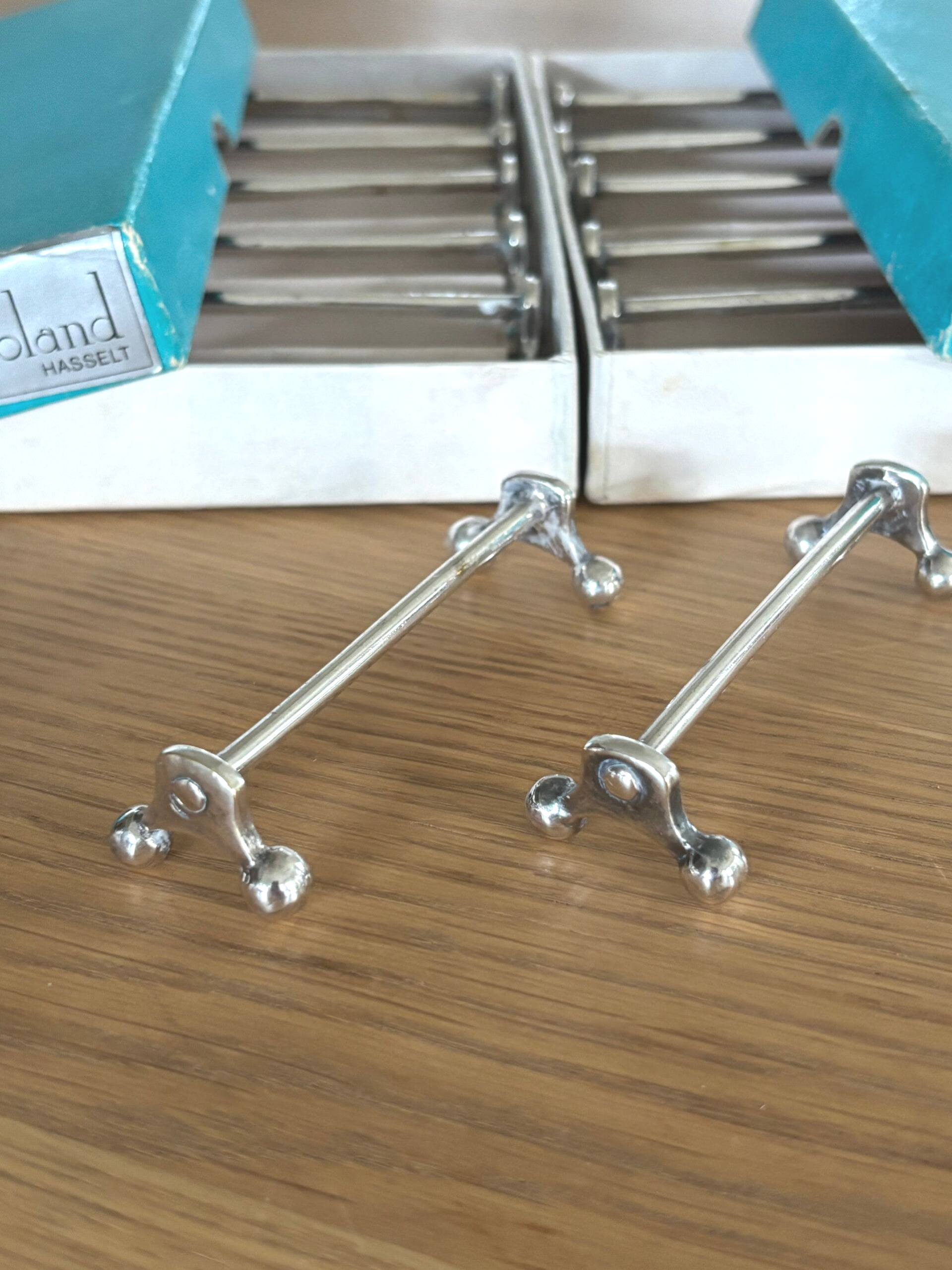 Set van 12 klassieke verzilverde messenleggers van 7,5 cm lang, ooit verkocht door Boland, destijds gevestigd in Galerie Albert te Hasselt. Een elegante toevoeging aan een stijlvol gedekte tafel.