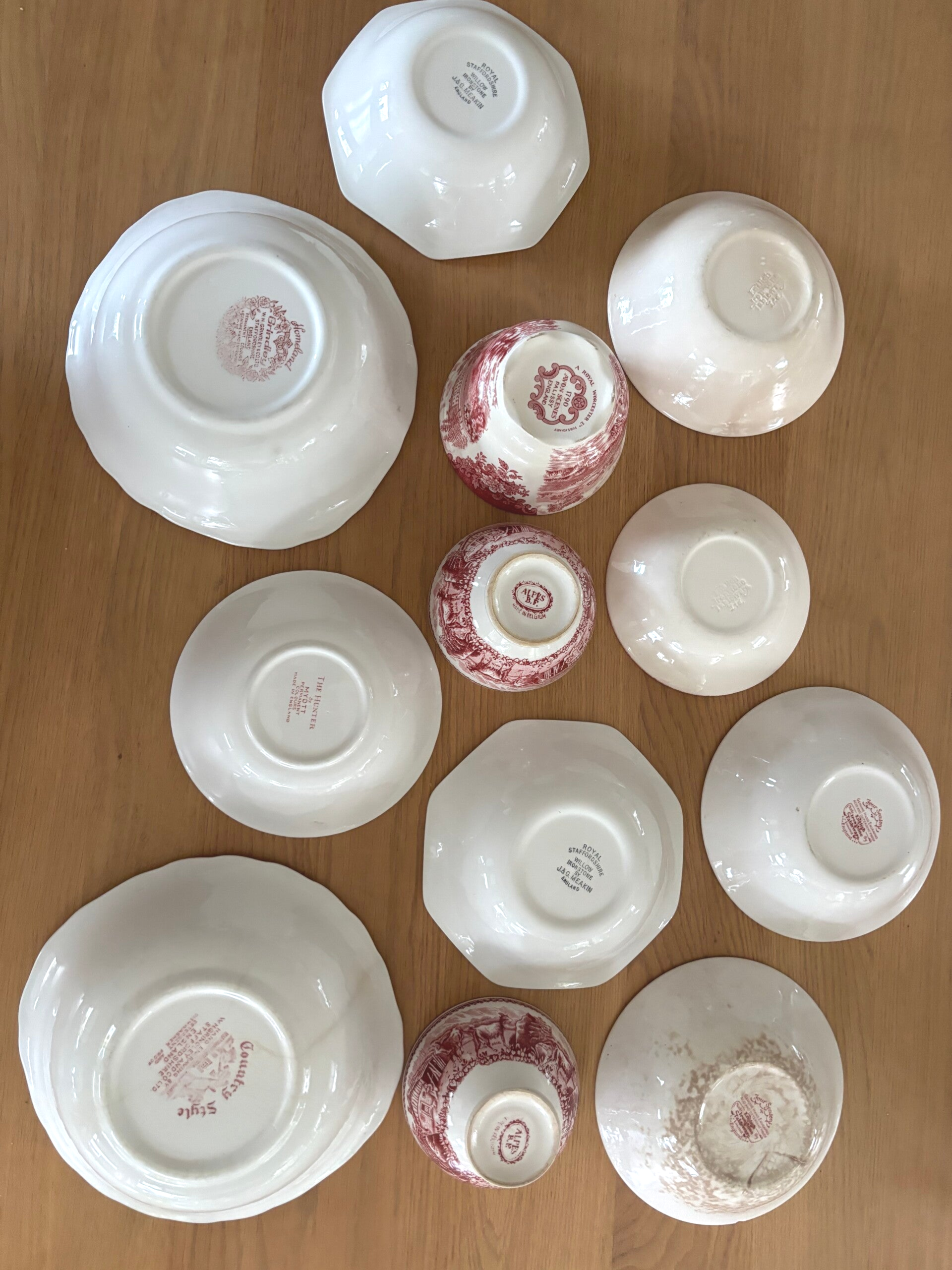 12-piece mix & match set of red English tableware, including English Ironstone, Myott, Palissy England, and J. & C. Meakin England. A charming combination of bowls and dishes.