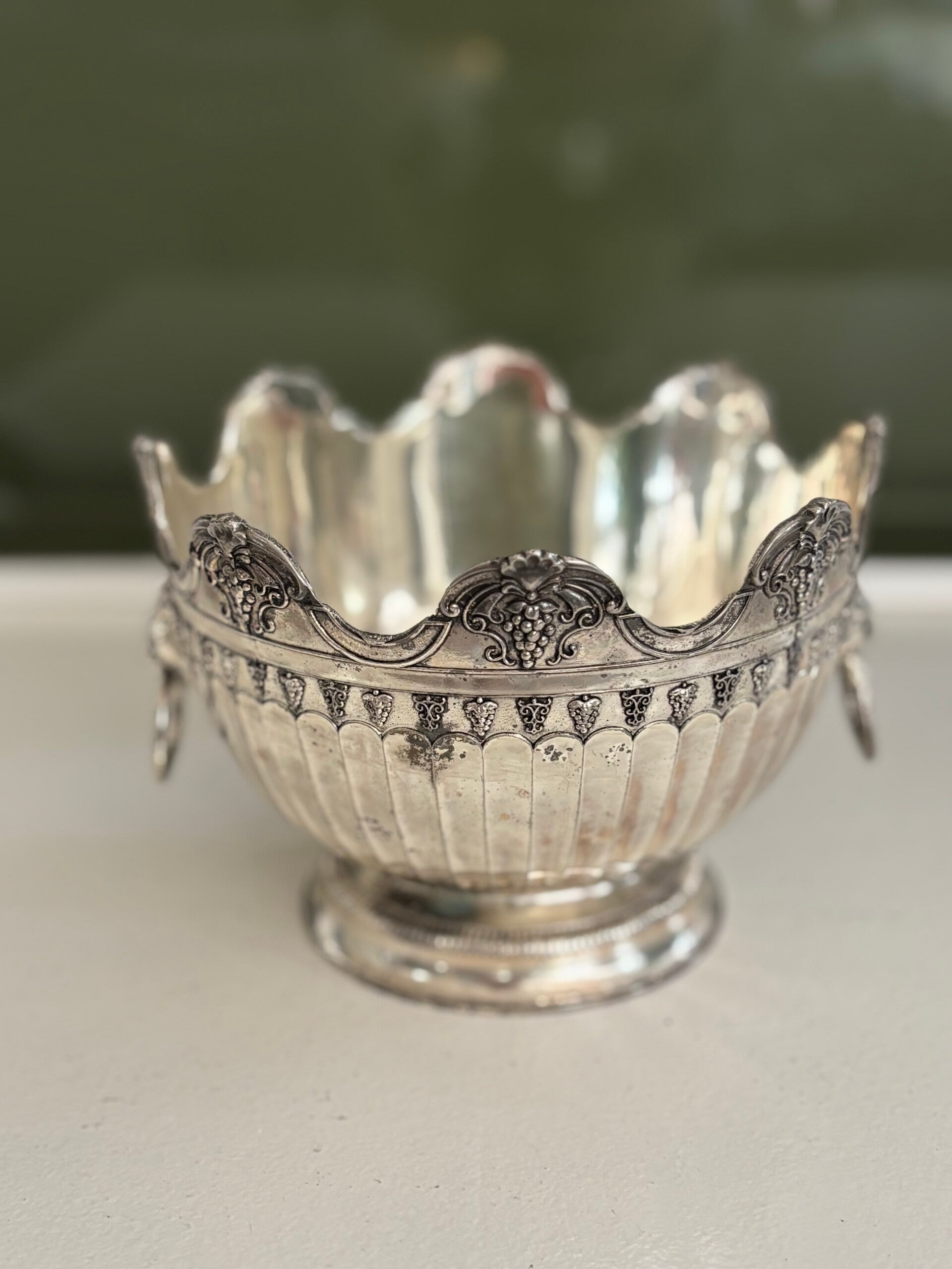 Verzilverd oud schaaltje met druivenranken decor en elegante leeuwenkop-handvatten. Afmetingen: 13 x 9,5 cm.