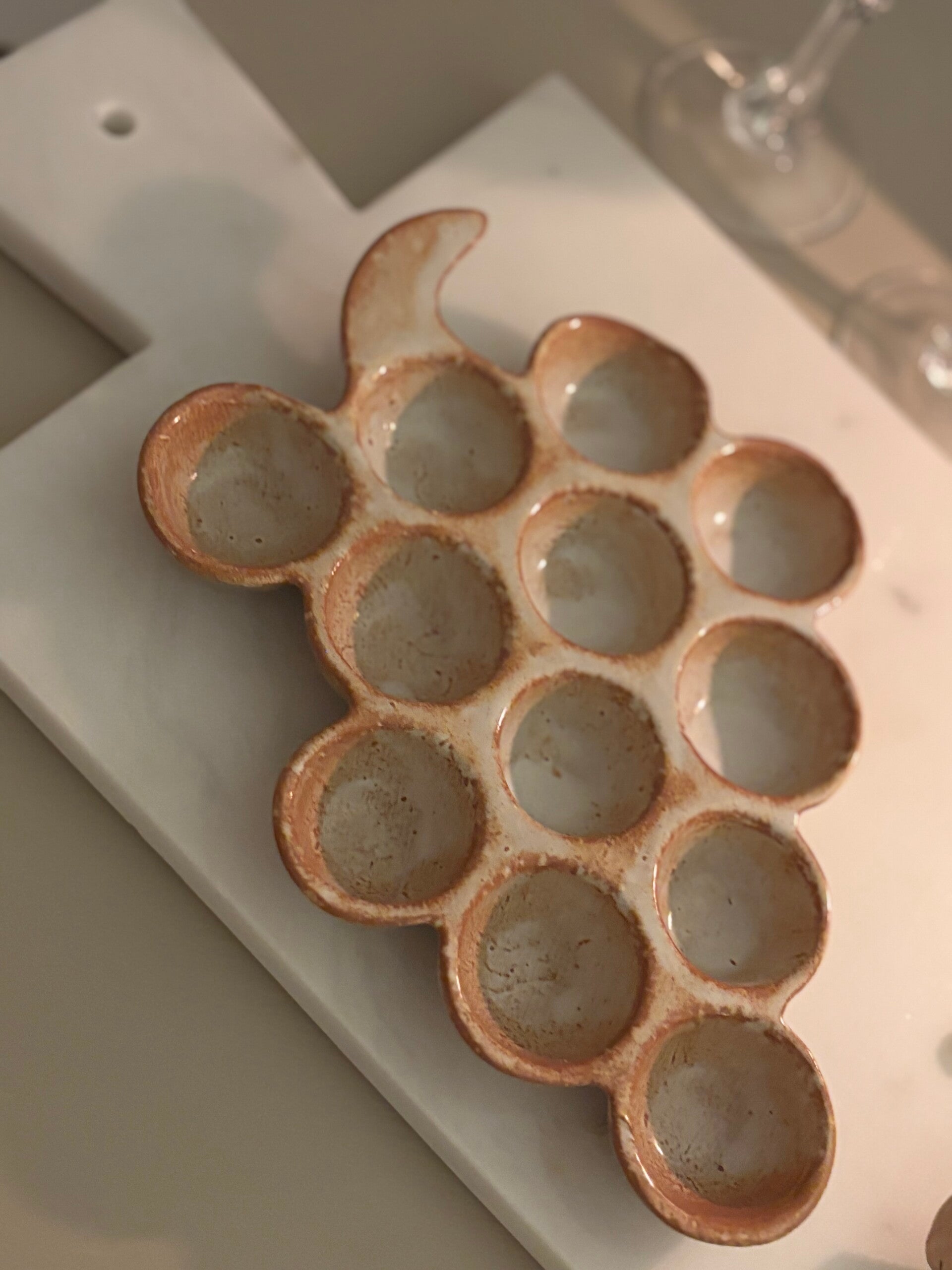 1970s ceramic dish shaped like a grape cluster. Ideal for tapas, small bites or escargots. Dimensions: 22 x 15.5 cm. A rare piece.
