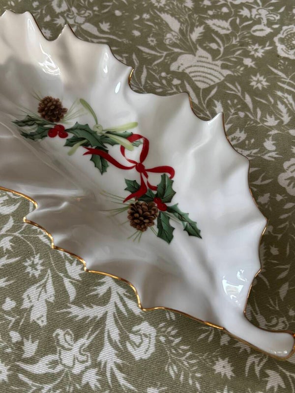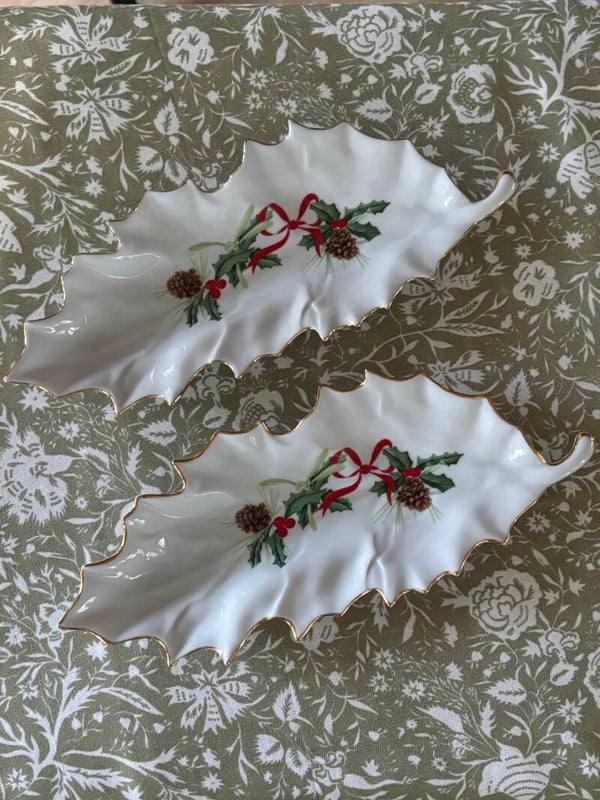 Set of two porcelain dishes with festive Christmas décor by Les Floralies Porcelaine de Limoges. Size 27 x 11 cm. Charming as a table centerpiece, perfect for presenting chocolates.