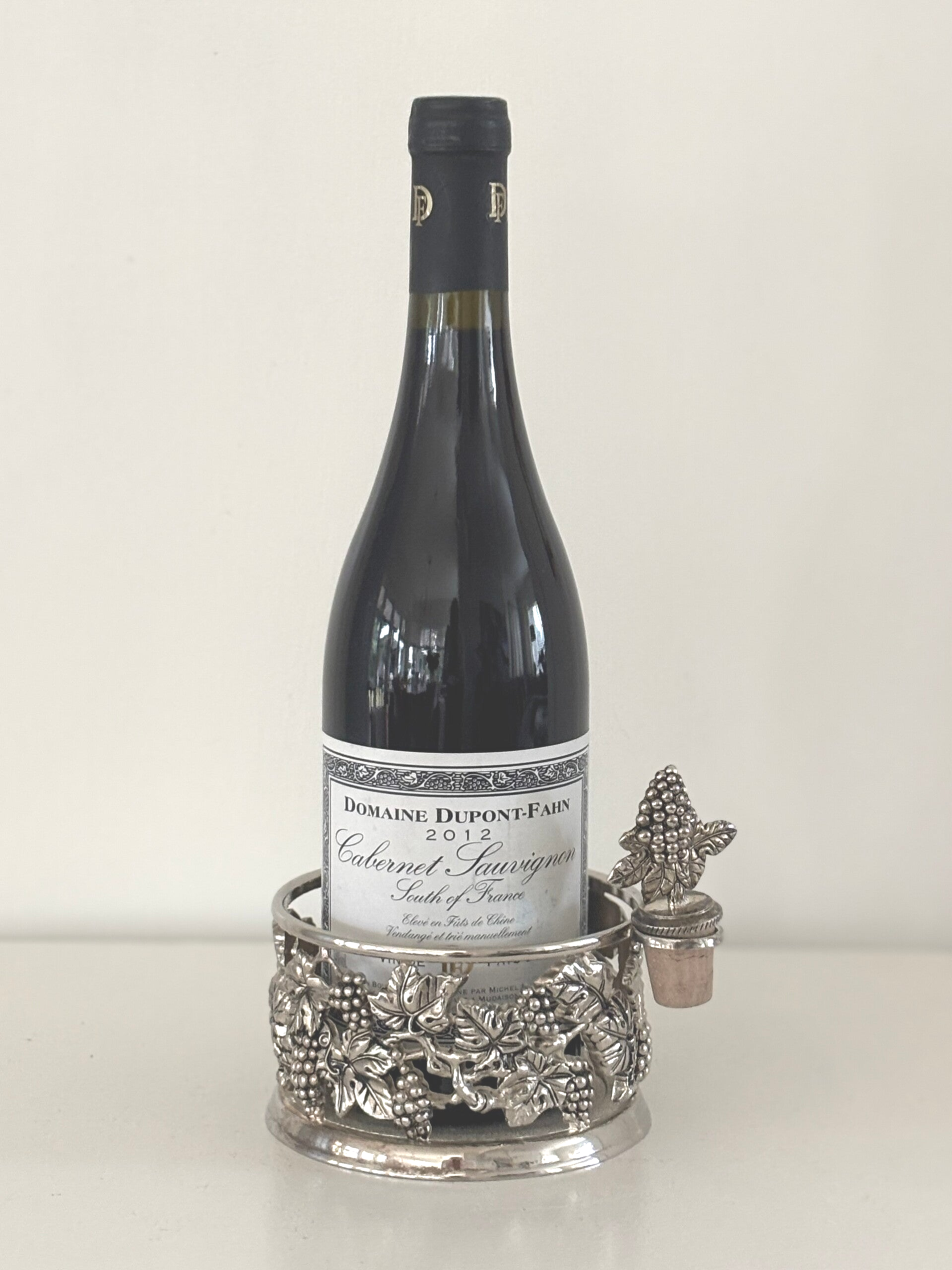 Sierlijke flesonderzetter met losse flessenstop, gedecoreerd met verfijnde druivenranken. Een elegant detail voor een stijlvol gedekte tafel of bar.