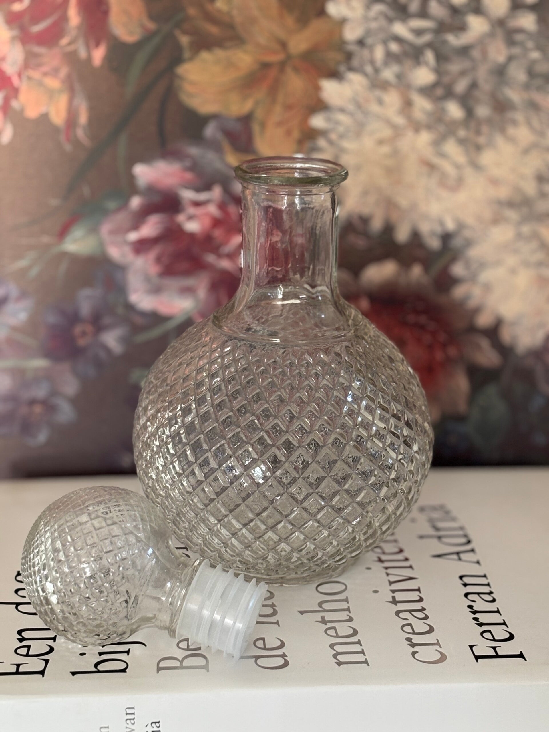 Glazen karaf met dop, verfijnd uitgevoerd met een ruitgeslepen reliëf. Een elegant detail op tafel of bar. Hoogte: 27 cm.