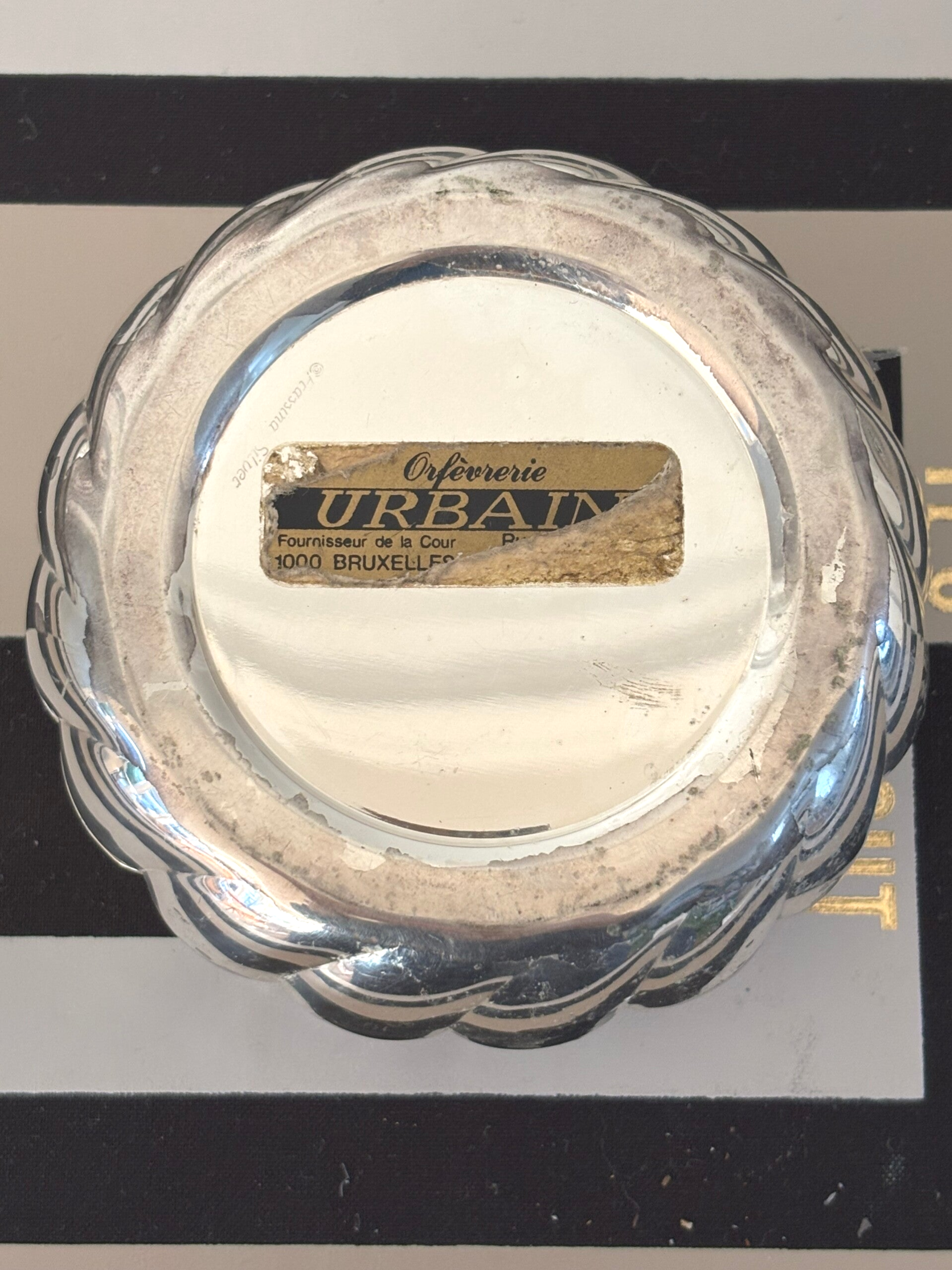Elegant vintage verzilverd doosje met deksel, afkomstig van Orfèvrerie Urbain, hofleverancier uit Brussel. Een fijn en stijlvol object met karakter. Afmetingen: 10,5 x 4,5 cm.