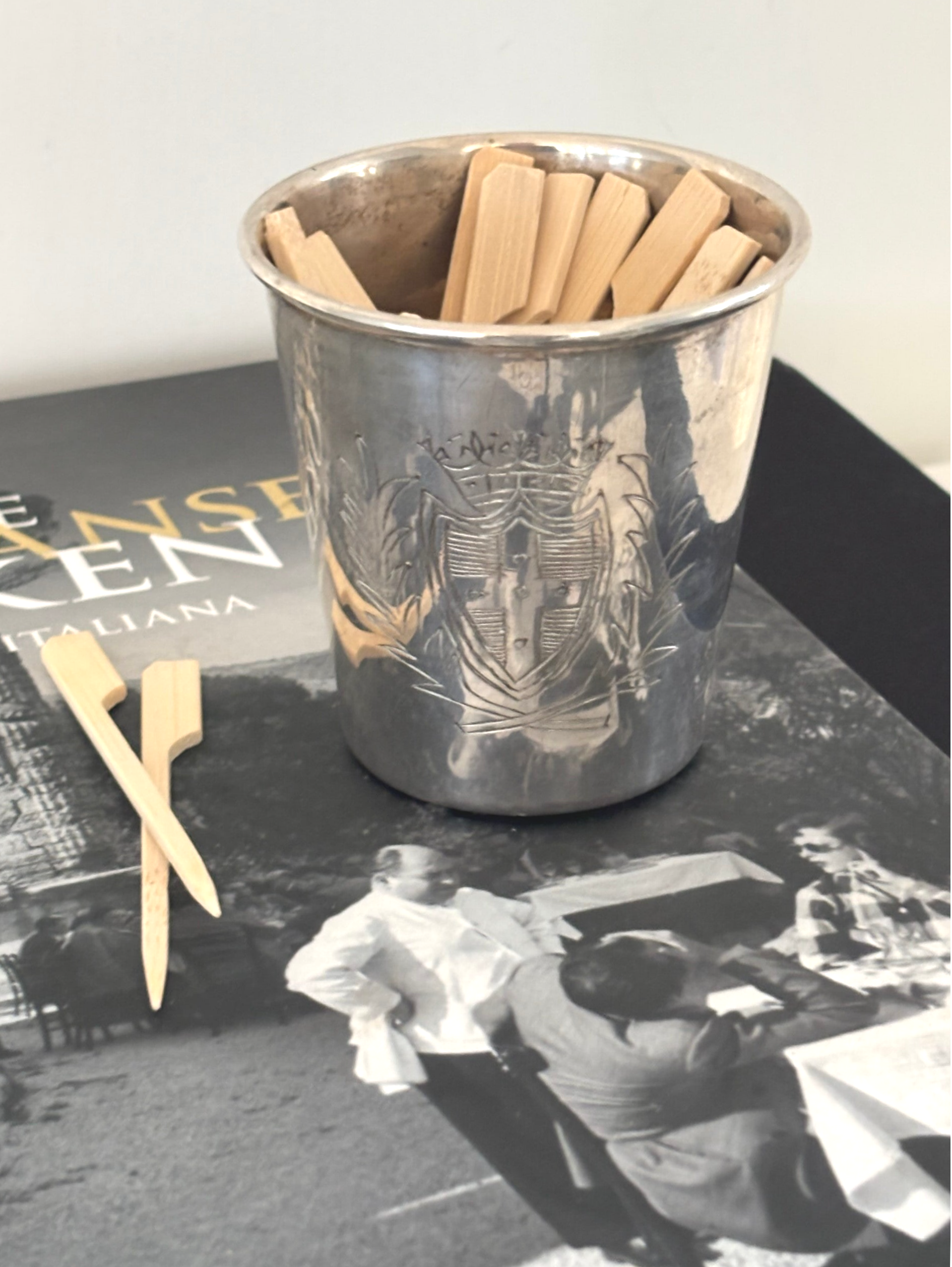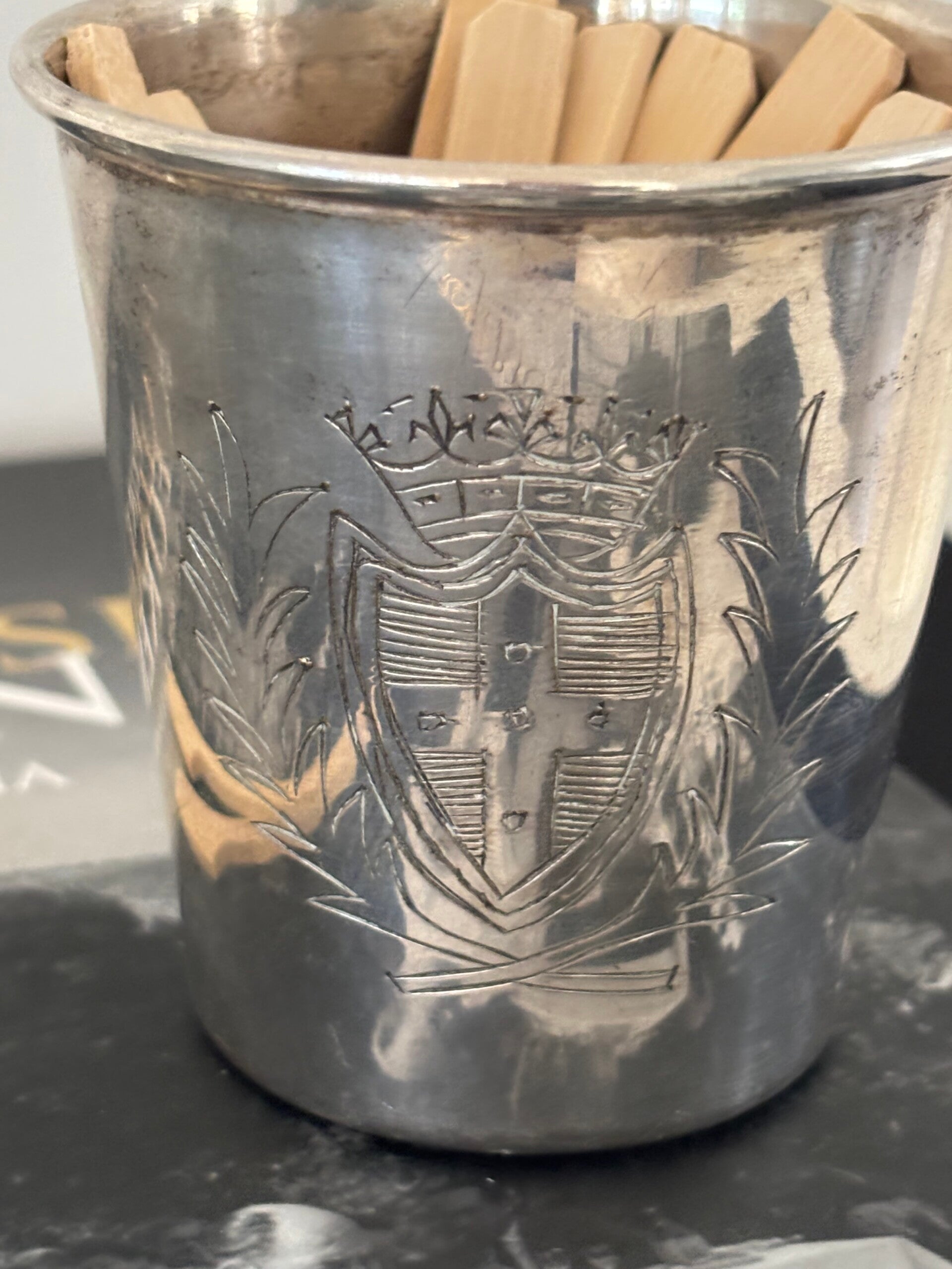 Silver-plated cup with an engraved family crest, an elegant accent perfect alongside a stylish grazing board. Dimensions: 7.5 x 7.5 cm.