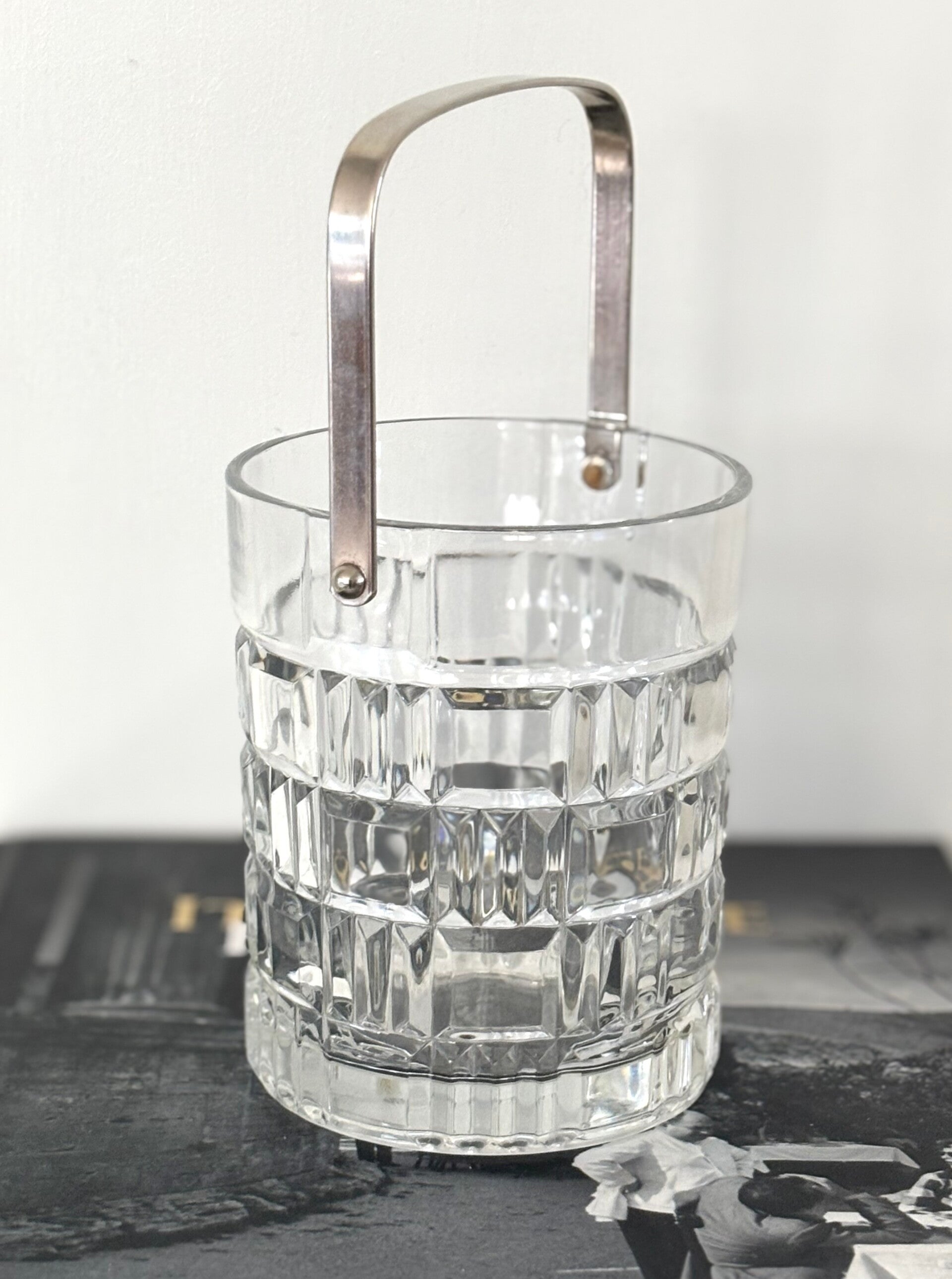 Elegant crystal ice bucket with a finely cut design. A beautiful detail for any festive table setting. Dimensions: 13 x 11 cm.