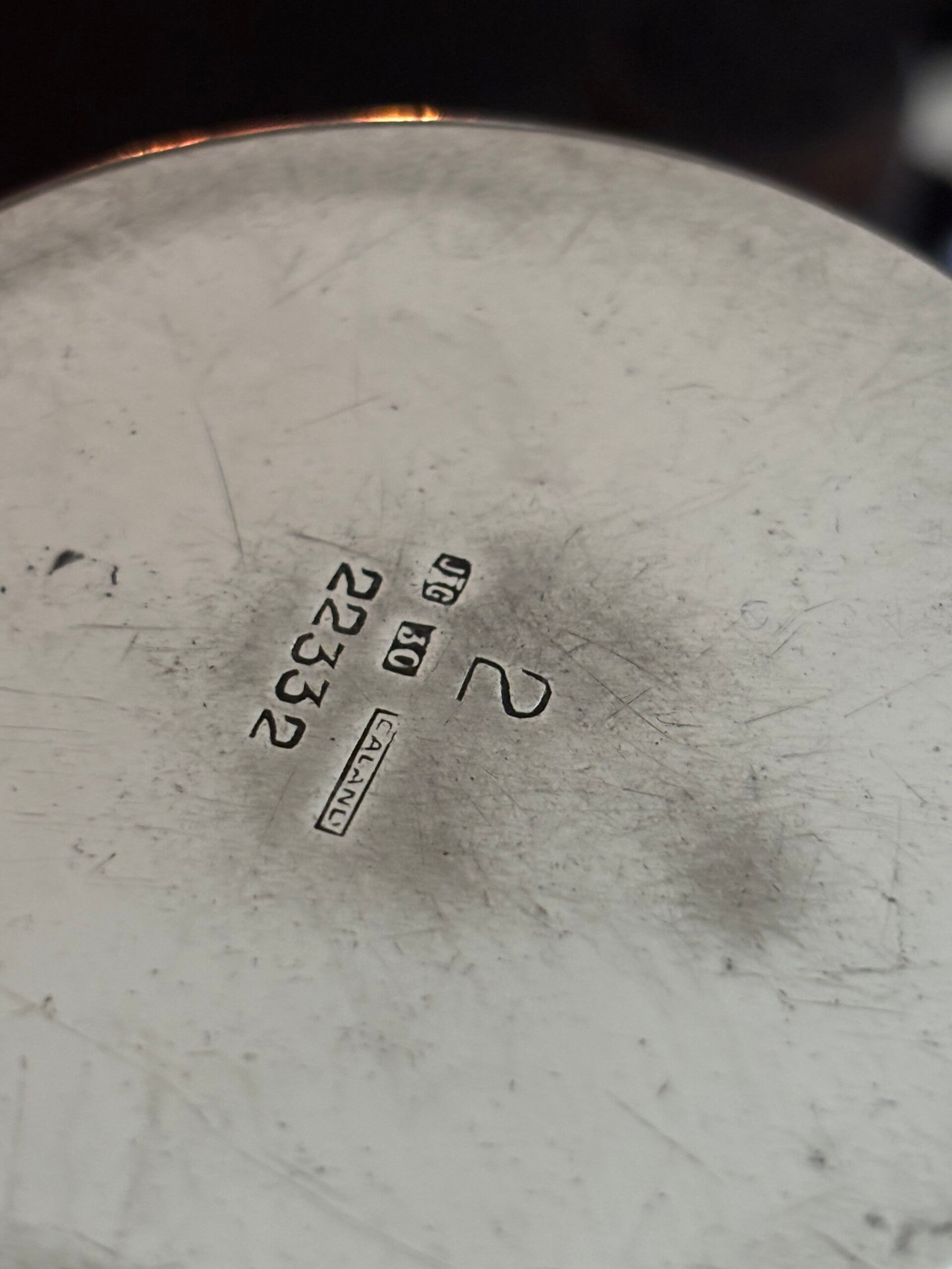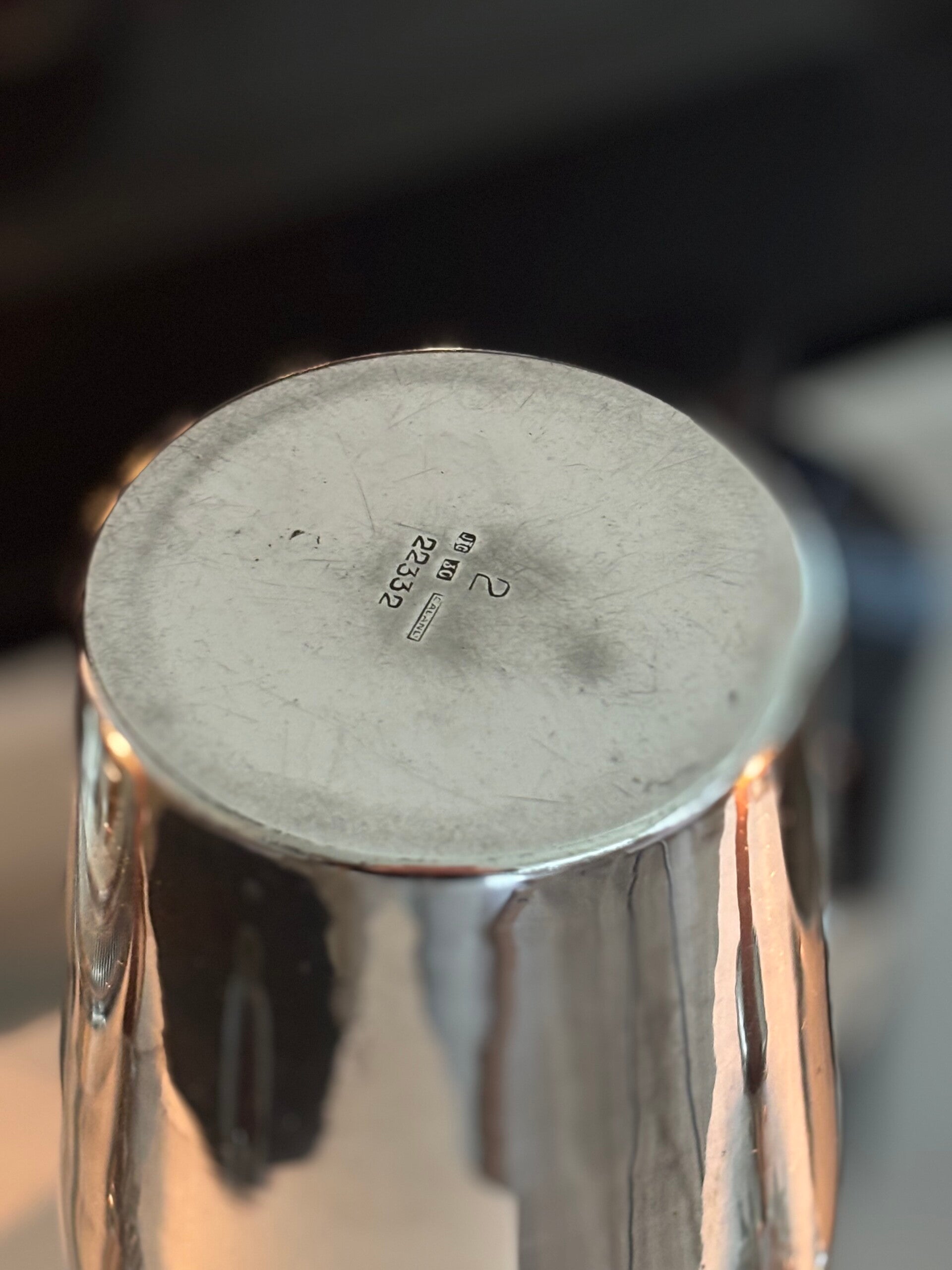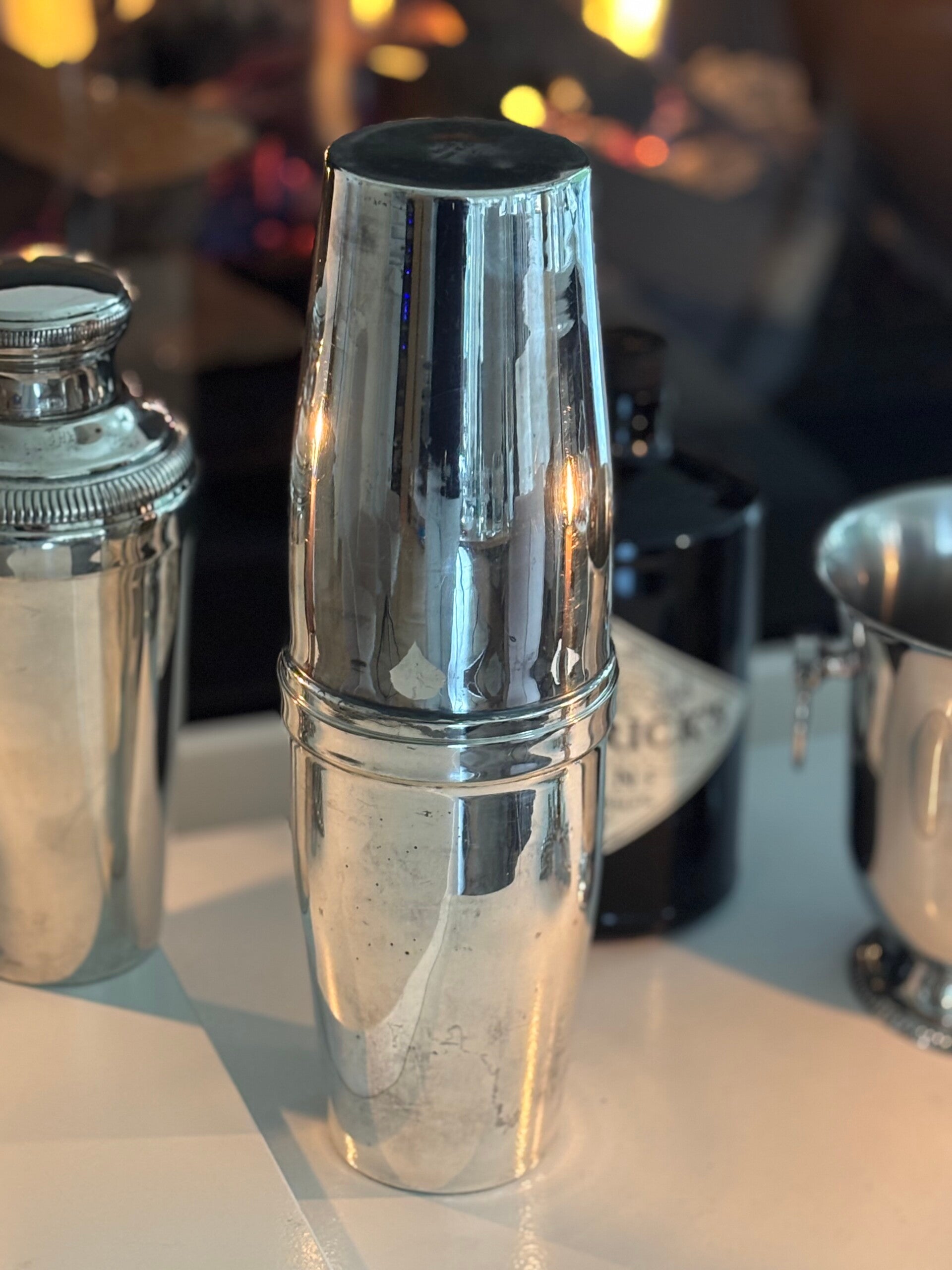 Schitterende antieke verzilverde cocktailshaker met fraaie afwerking en merktekens aan beide zijden, zie detailfoto. Alleen de buitenzijde is gepoetst. Een stijlvol object voor elke bar. Afmetingen: 29,5 x 9,2 cm.